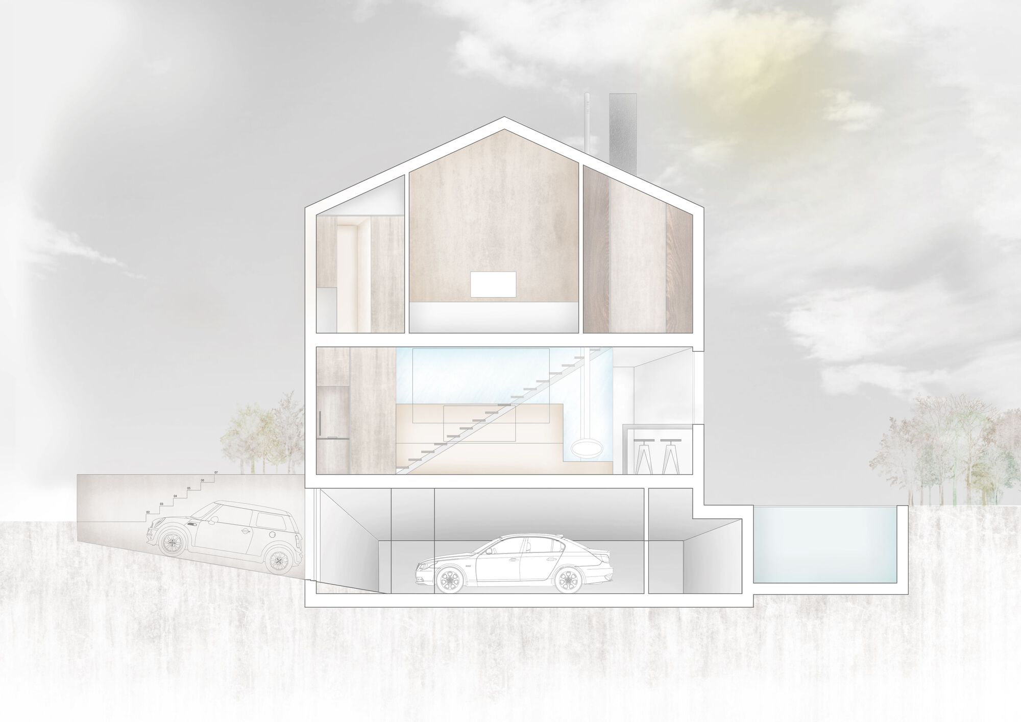 먼저, 1층을 필요에 따라 쉽게 구조를 변경할 수 있도록 계단실 중심의 개방형 공간으로 만들었다. 다음으로, 침실들이 배치된 위층으로 올라가는 철재 계단을 콘크리트 벽체에 캔틸레버 구조로 설치했다. 마지막으로, 차고가 들어있는 지하층에는 수영장과 다목적실 사이에 유리벽을 설치했다.