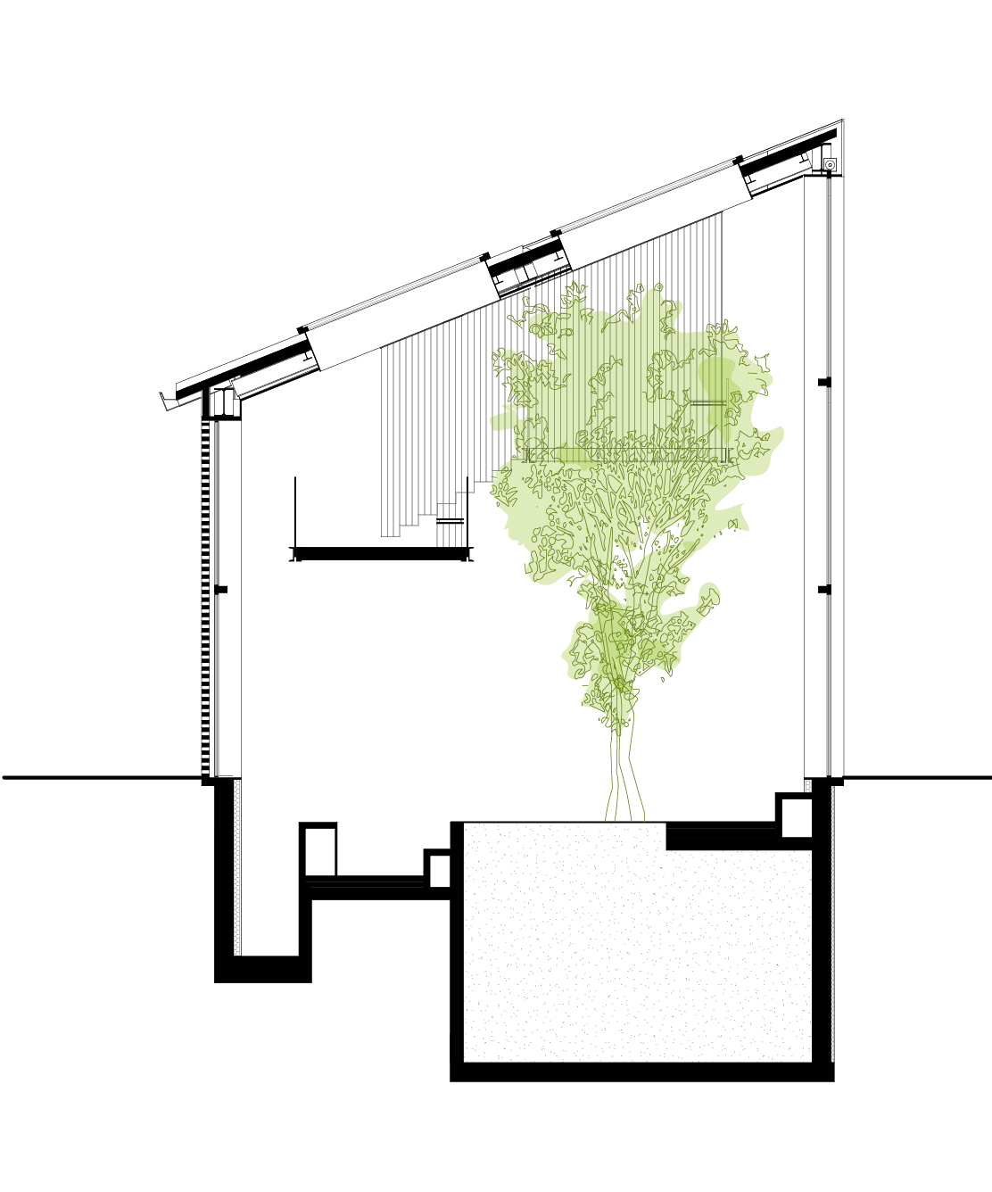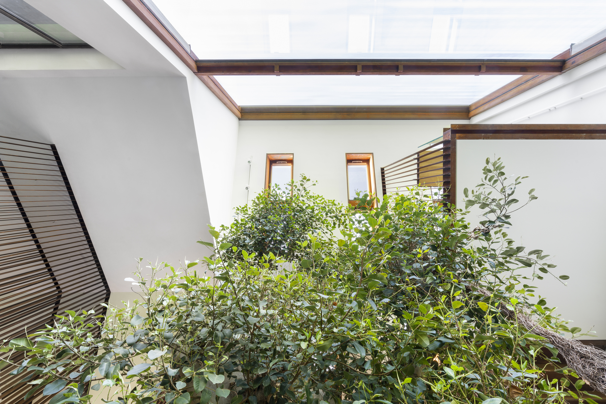 나무가 번성할 수 있는 이상적인 환경을 조성하기 위해, 남측 파사드를 10미터 높이의 유리벽으로 만들어서 자연 채광 능력이 극대화되었다. 이 공간은, 기술과 미기후를 활용하여 온·습도를 제어함으로써, 나무와 거주자가 쾌적한 환경에서 공존할 수 있게 디자인되었다. 창문과 지붕이 모두 자동으로 열리고 닫혀서, 집으로 들어오는 햇빛과 신선한 공기의 양이 저절로 조절되는 시스템이다.