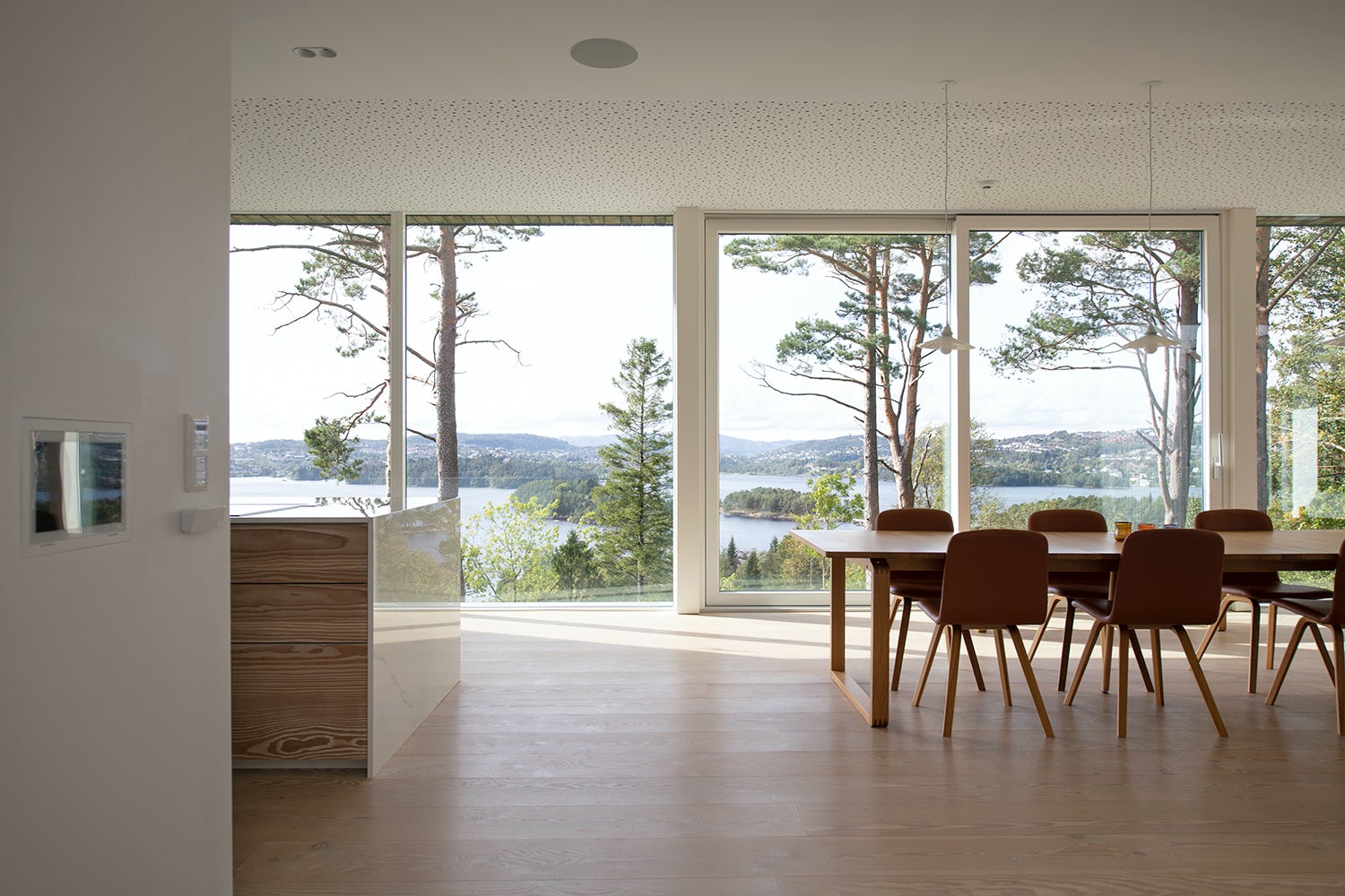 설계를 한 건축가 Todd Saunders의 표현을 빌리자면, 이 집은 툭 트인 호수 풍경을 향해서는 일종의 ‘뷰 파인더’처럼 완전히 개방시킨 반면, 양 측면 파사드는 상대적으로 폐쇄시킴으로써, 노르도스 호수 자체에 집중할 수 있게 계획되었다.