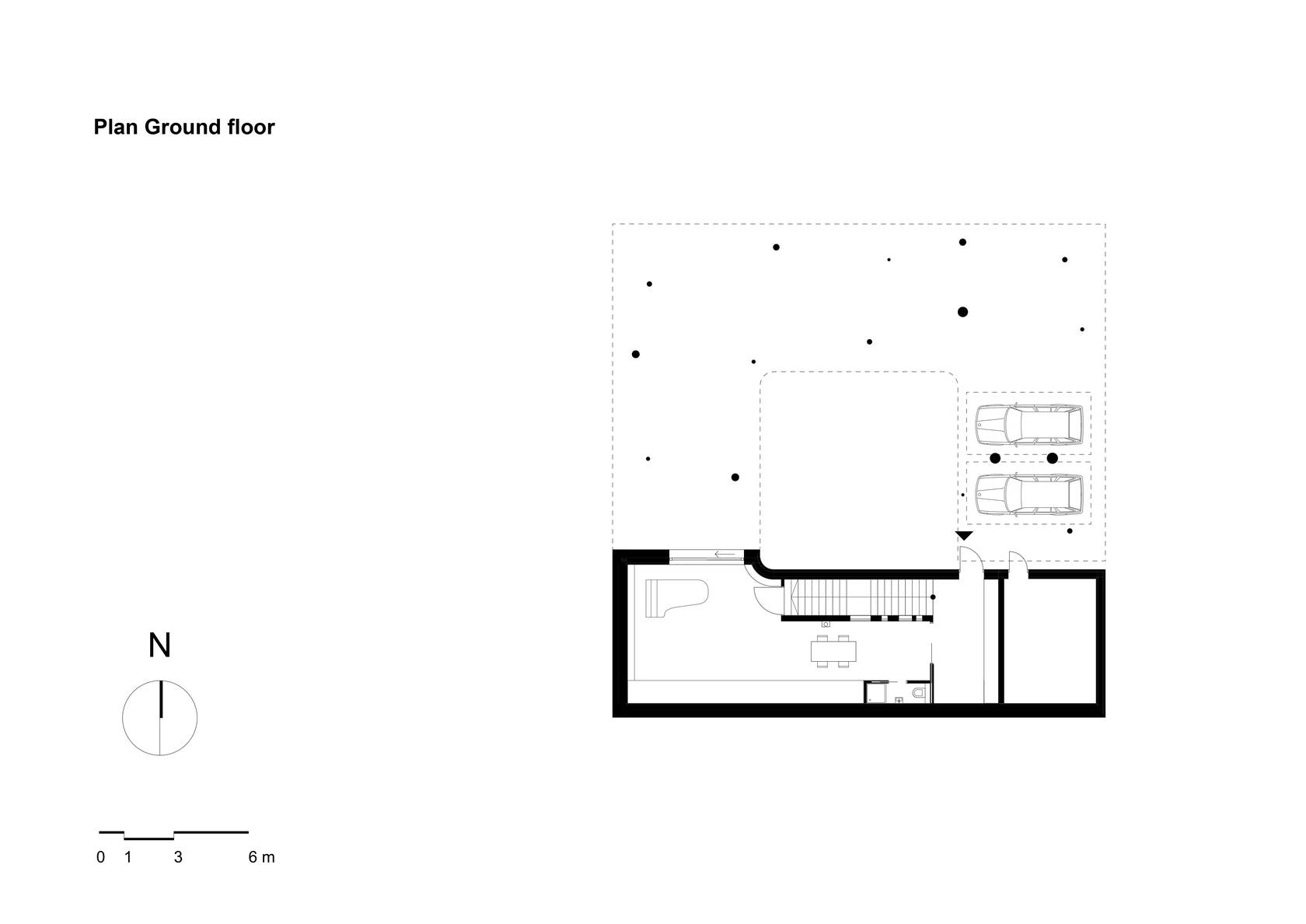 창고를 제외하면 1층에는 음악 스튜디오만 배치되었다. 현관과 계단이 포함된 음악 스튜디오는, 조형 요소로 기능하는 비탈 지붕 아래에 들어 있다.