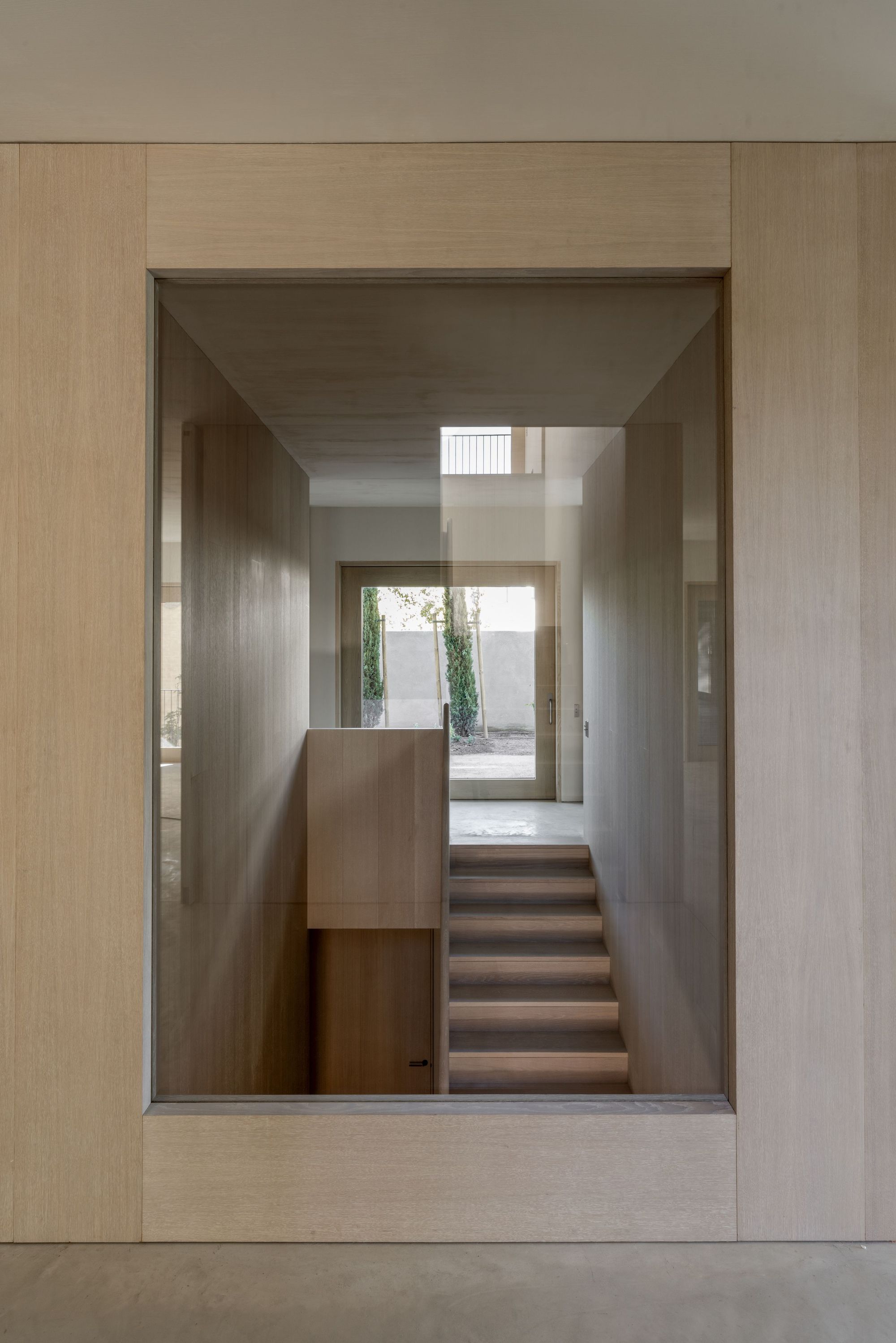 정사각형 평면, 직육면체 모양의 본채는, 세 개 층으로 이루어졌다. 침실은 2층에, 공용 공간은 1층에, 그리고 부속 공간들은 넓은 파티오가 있는 지하층에 배치되었다.