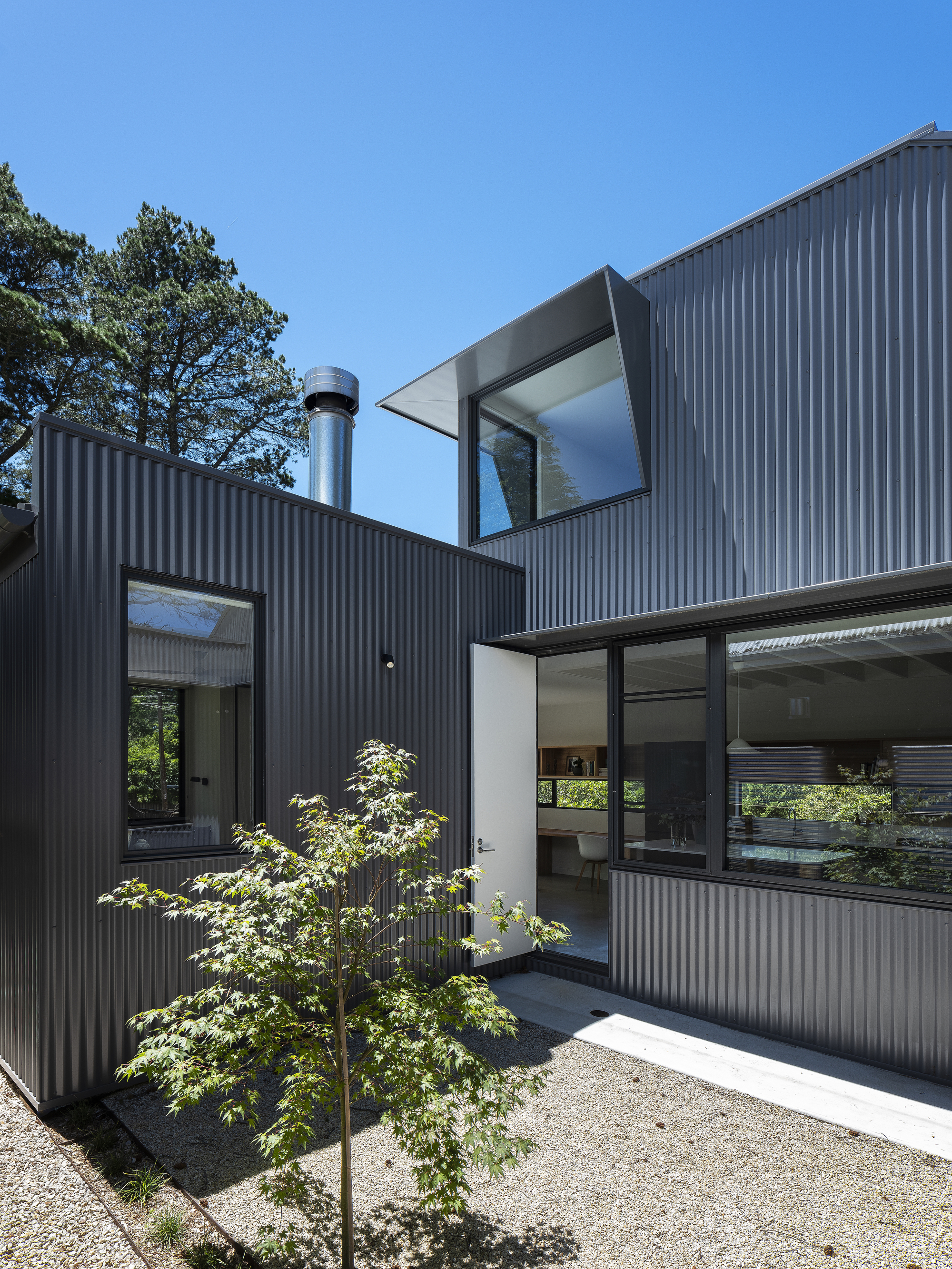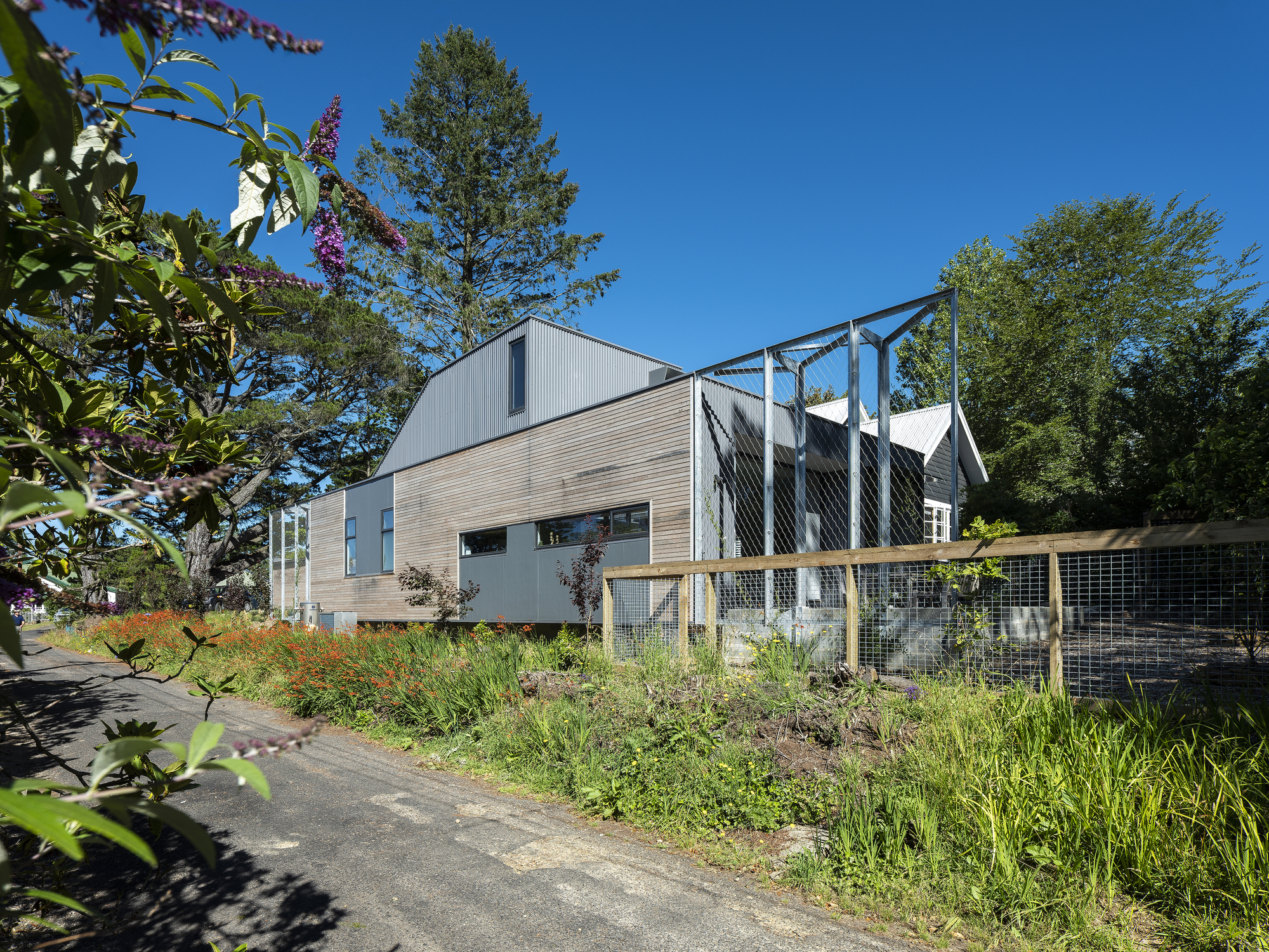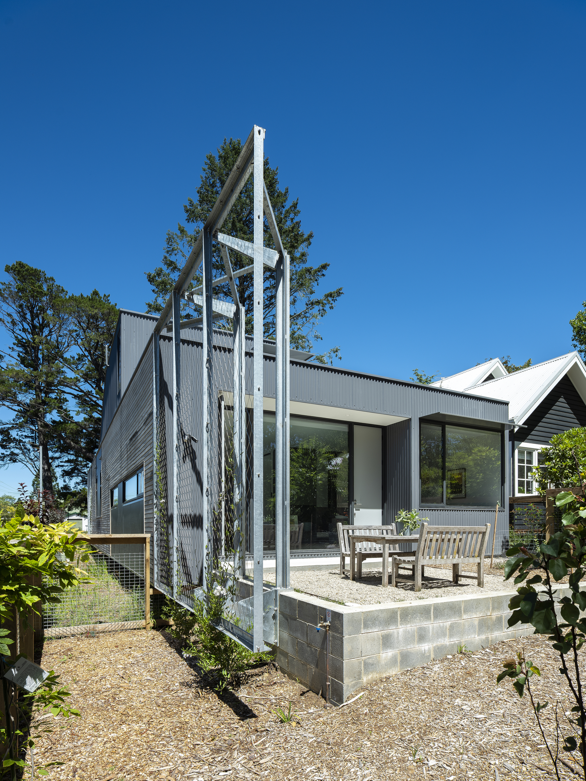 전원주택에 많이 사용하는 골 강판을 적용하여 현대적인 산업 미학을 더했고, 덩굴 식물이 타고 올라가서 건물과 이웃 풍경 사이가 맞물리도록 아연 도금한 철망을 설치했다.