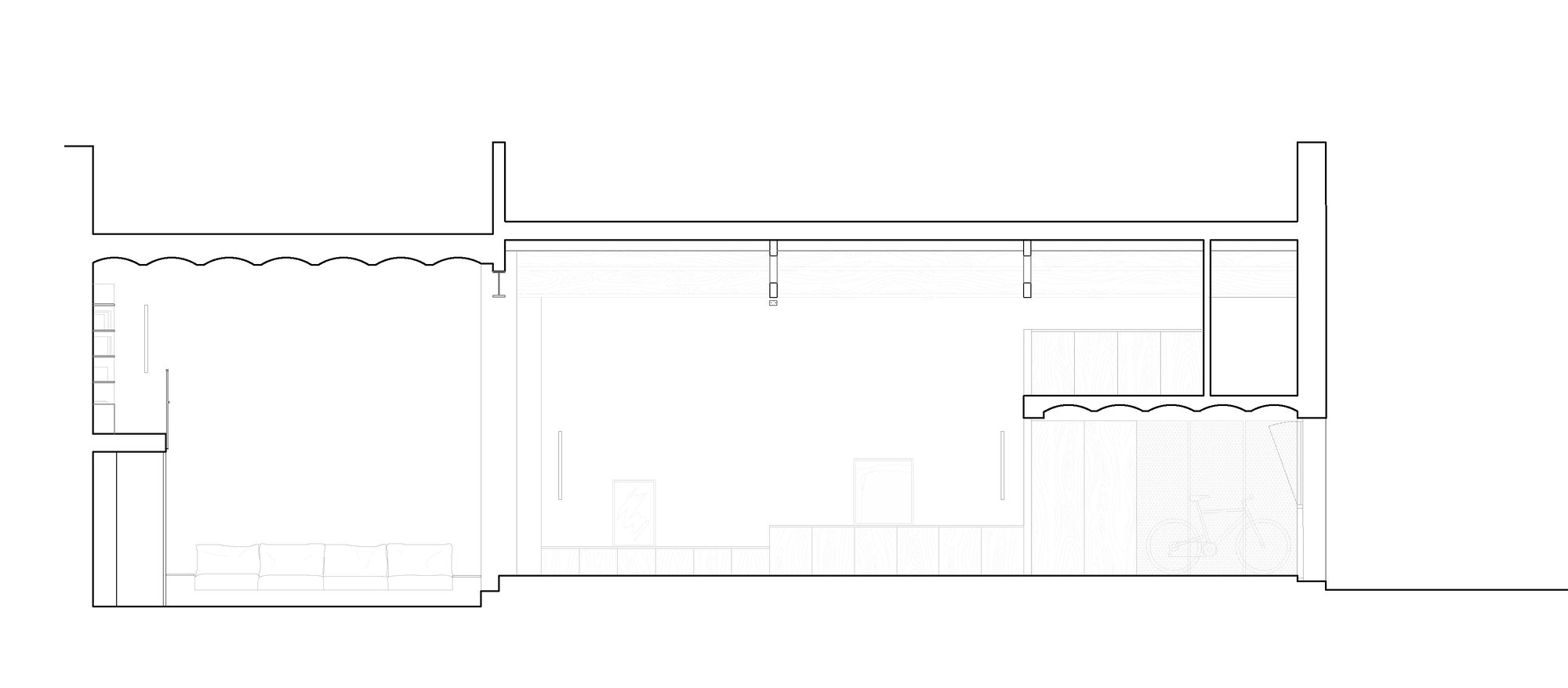 이에 따라, 이 집은 침실과 욕실을 제외한 나머지 전체가 천장고 높은 완전 개방형 가변 공간으로 계획되었다.