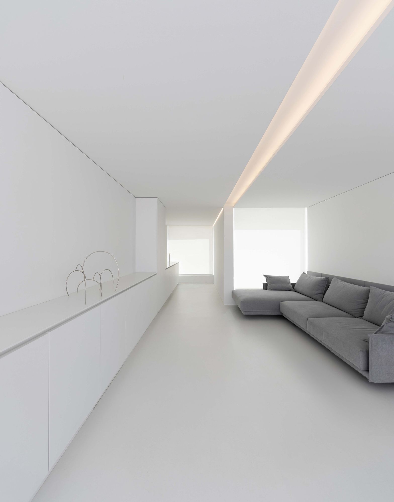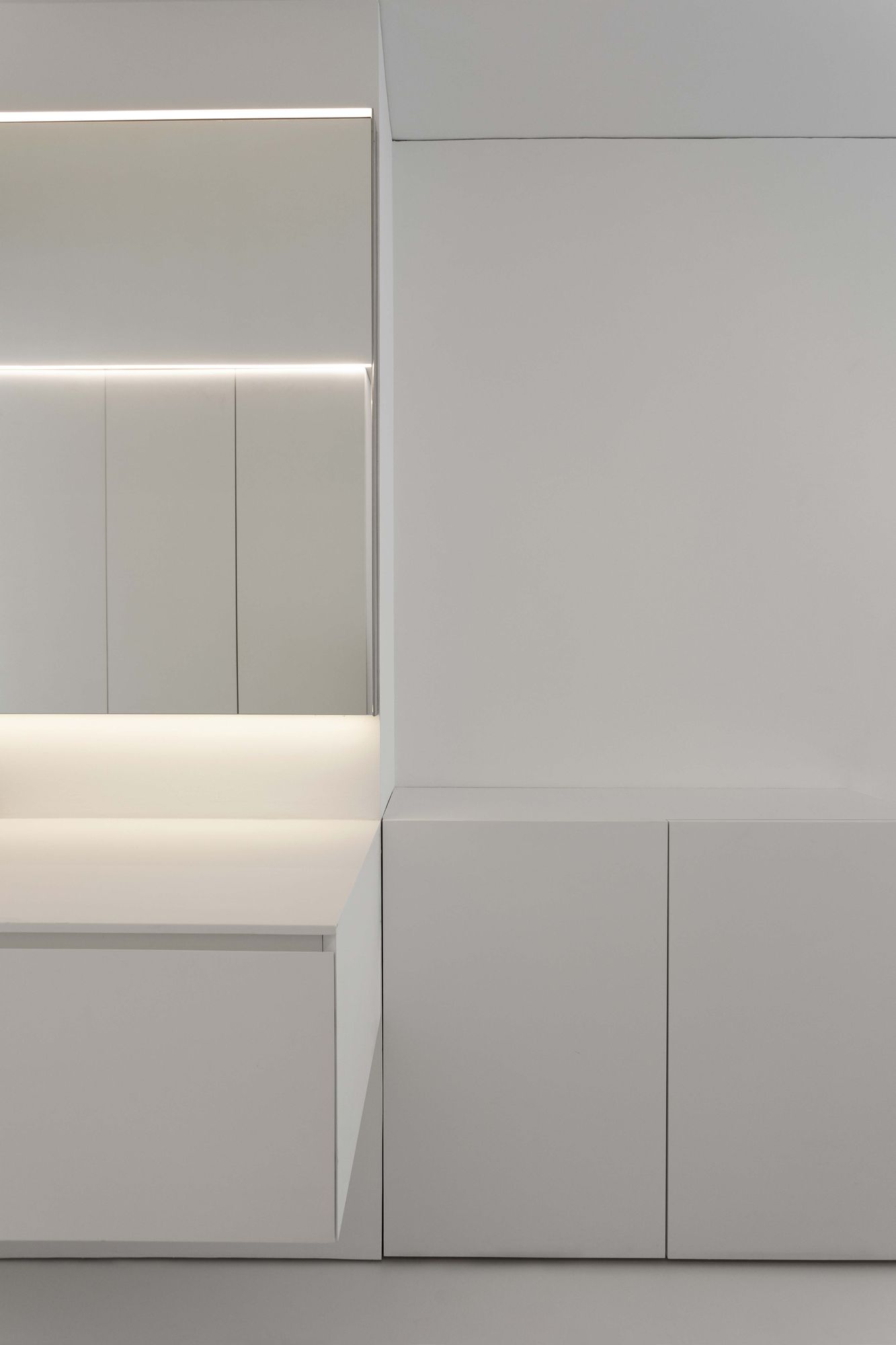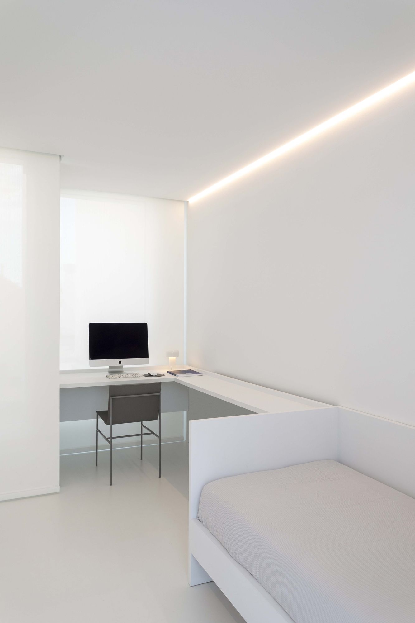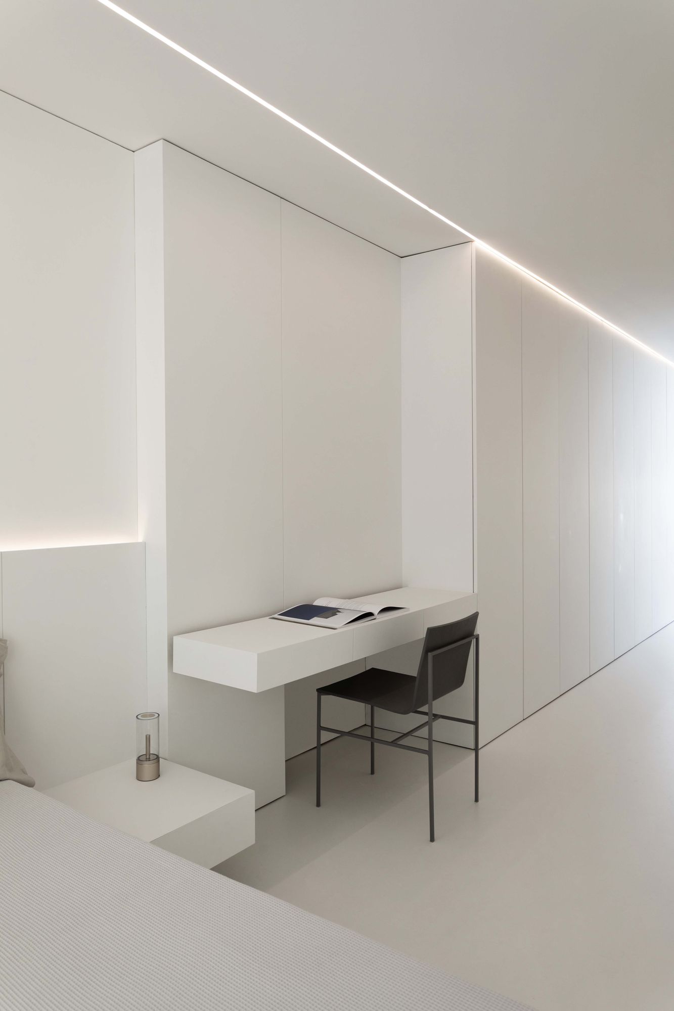 그리고 입구 다른 한쪽으로 침실 영역이 위치한다. 다른 영역들처럼 침실 영역도 하나의 축을 따라 배치되었고, 천장의 선형 조명이나 붙박이 가구와 같은 다양한 요소들을 이 축 방향으로 설치하여, 방향성이 배가되었다.