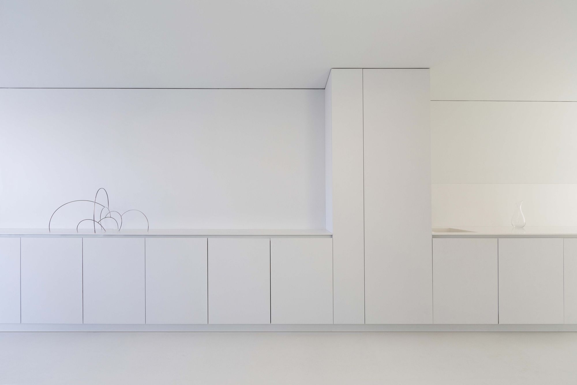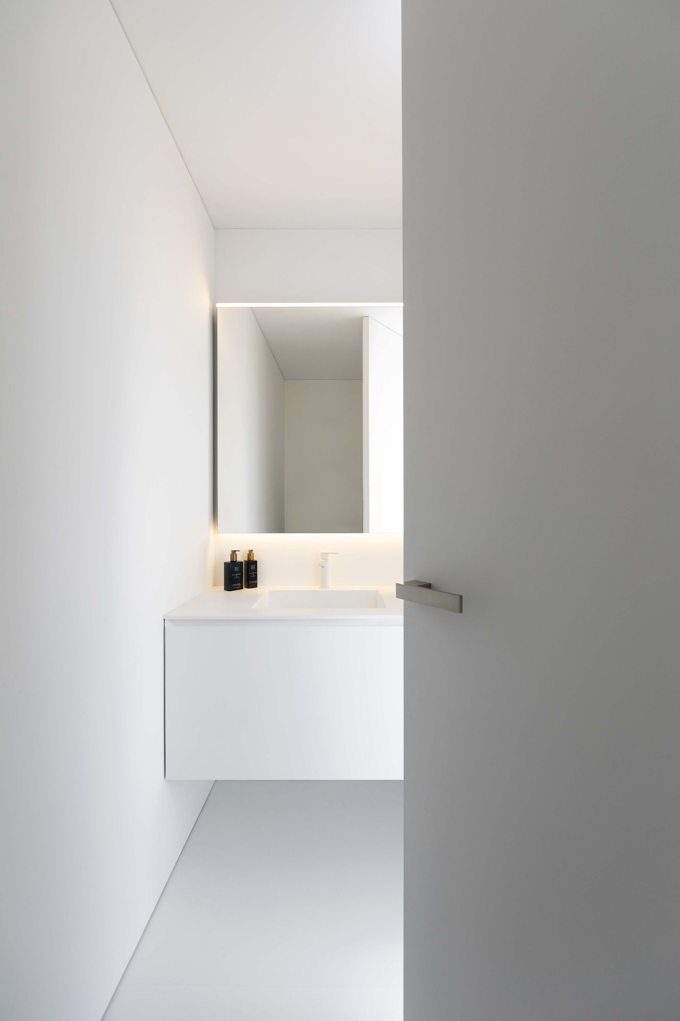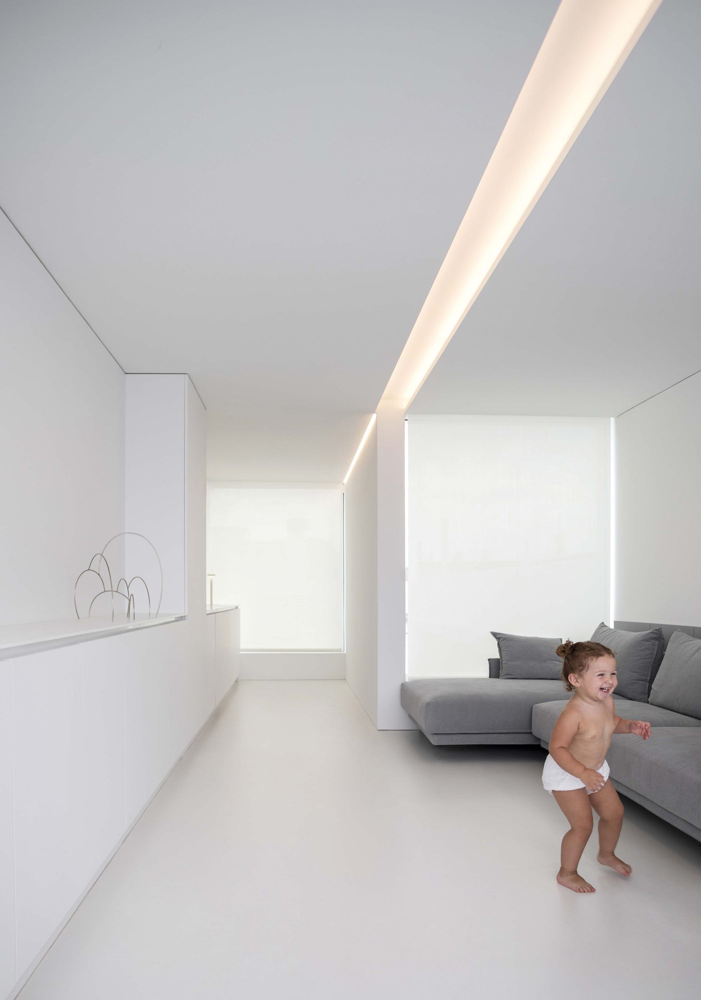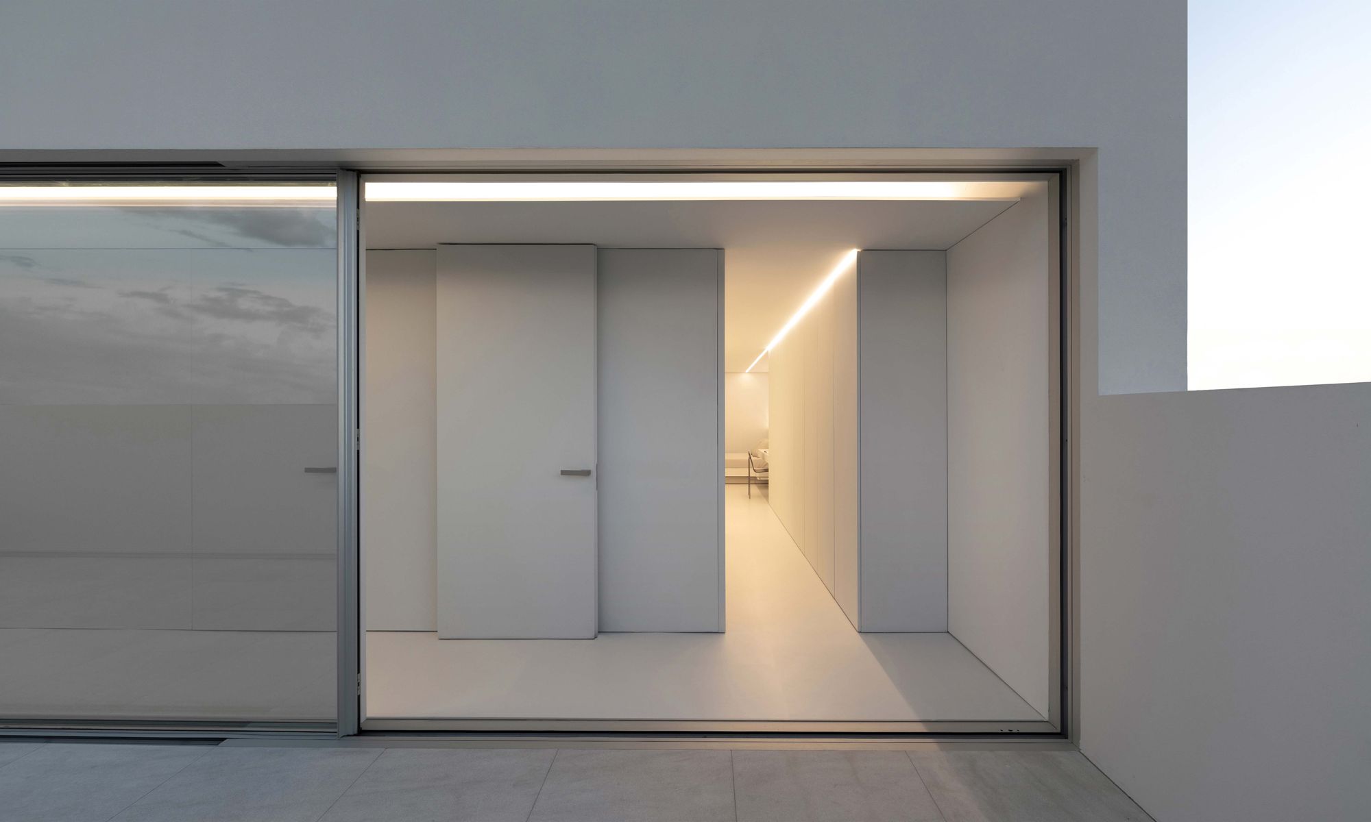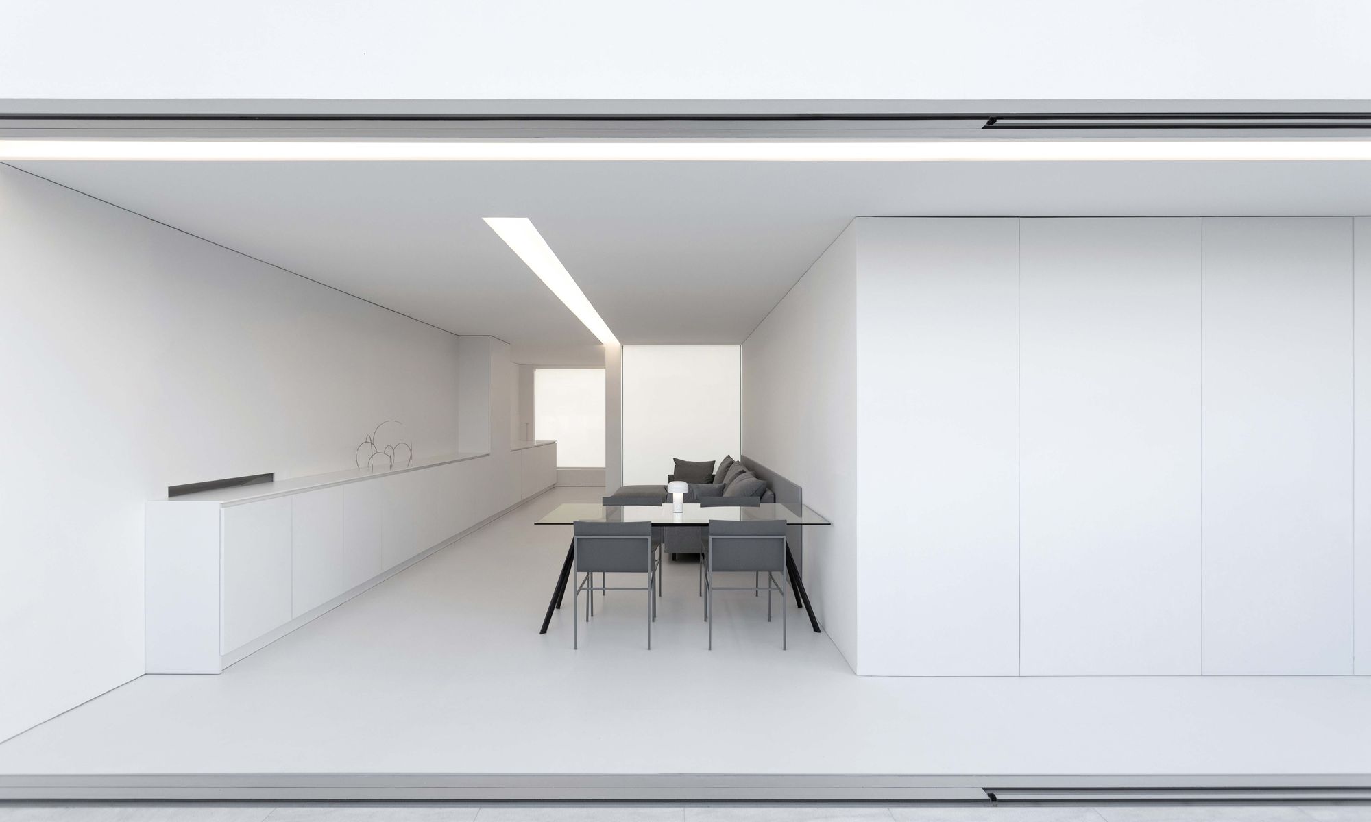 그리고 입구 다른 한쪽으로 침실 영역이 위치한다. 다른 영역들처럼 침실 영역도 하나의 축을 따라 배치되었고, 천장의 선형 조명이나 붙박이 가구와 같은 다양한 요소들을 이 축 방향으로 설치하여, 방향성이 배가되었다.
