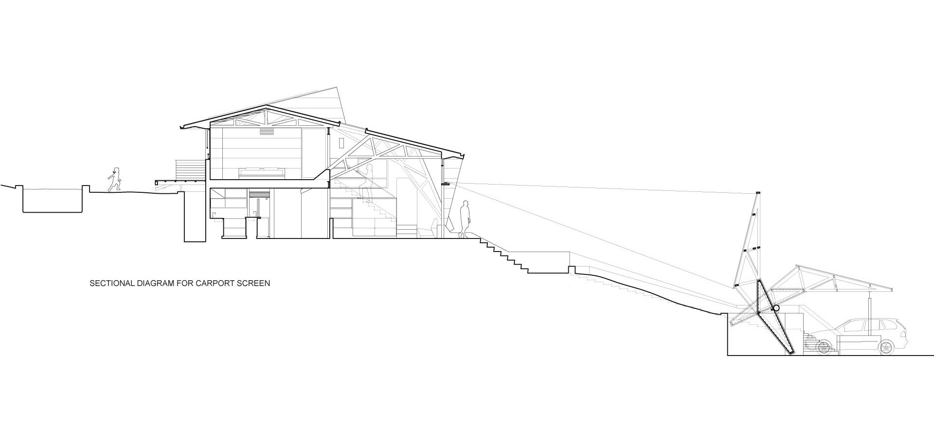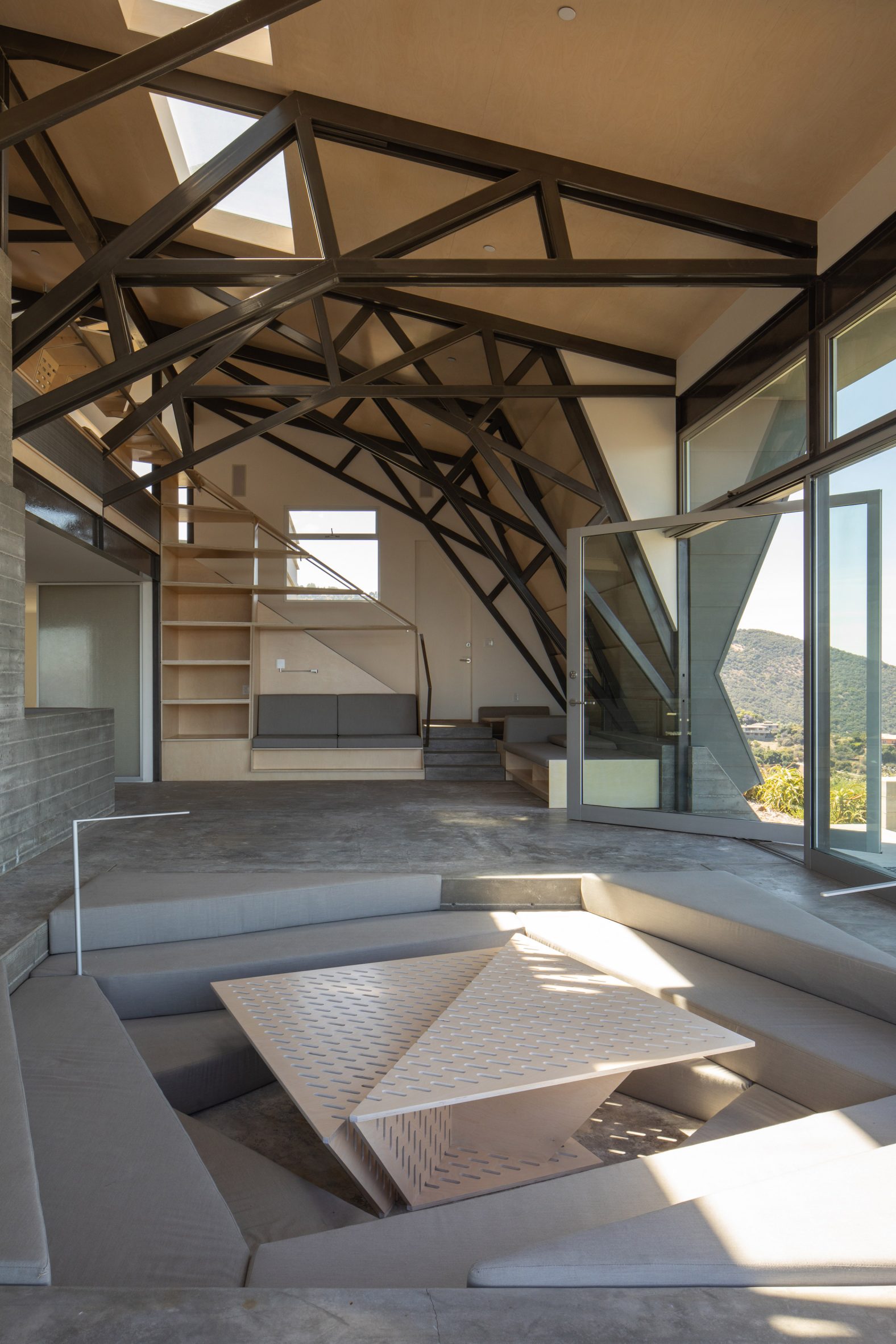 2층 규모의 본채는, 대형 유리창을 통해 바깥 풍경을 즐길 수 있을 만큼 높으면서도, 위쪽 이웃들의 조망에 방해가 되지 않을 정도로 충분히 낮은 위치에 지어졌다. 그리고 그보다 지대가 낮은 도로 측에, 산등성이를 타고 올라오는 산불을 첫 번째로 맞닥뜨려 방어할 간이 차고가 배치되었다.