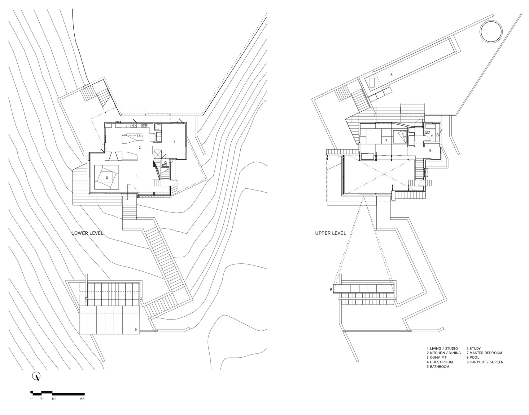 연면적 2,100제곱피트(약 59평) 규모의 본채 위층에 마스터 침실과 서재가 있고, 아래층에 바닥을 낮춘 구덩이 형태의 거실, 주방/식당, 게스트 룸 등이 배치되었다.