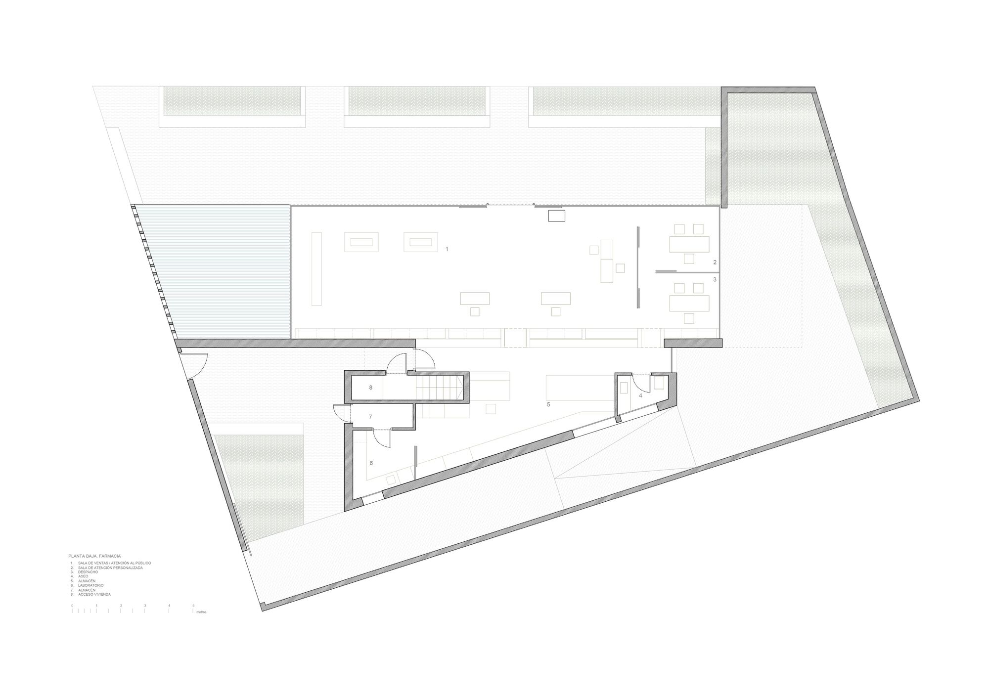 The intervention creates two visually differentiated volumes. One white piece is weightlessly placed over the pharmacy, locating the common spaces of the house. In another volume, made of concrete, the rooms and working and storage areas of the pharmacy. On its own, the public space of the pharmacy shows itself to the outside entirely sheer, in permanent contact with the urban space, where limits are faded.
