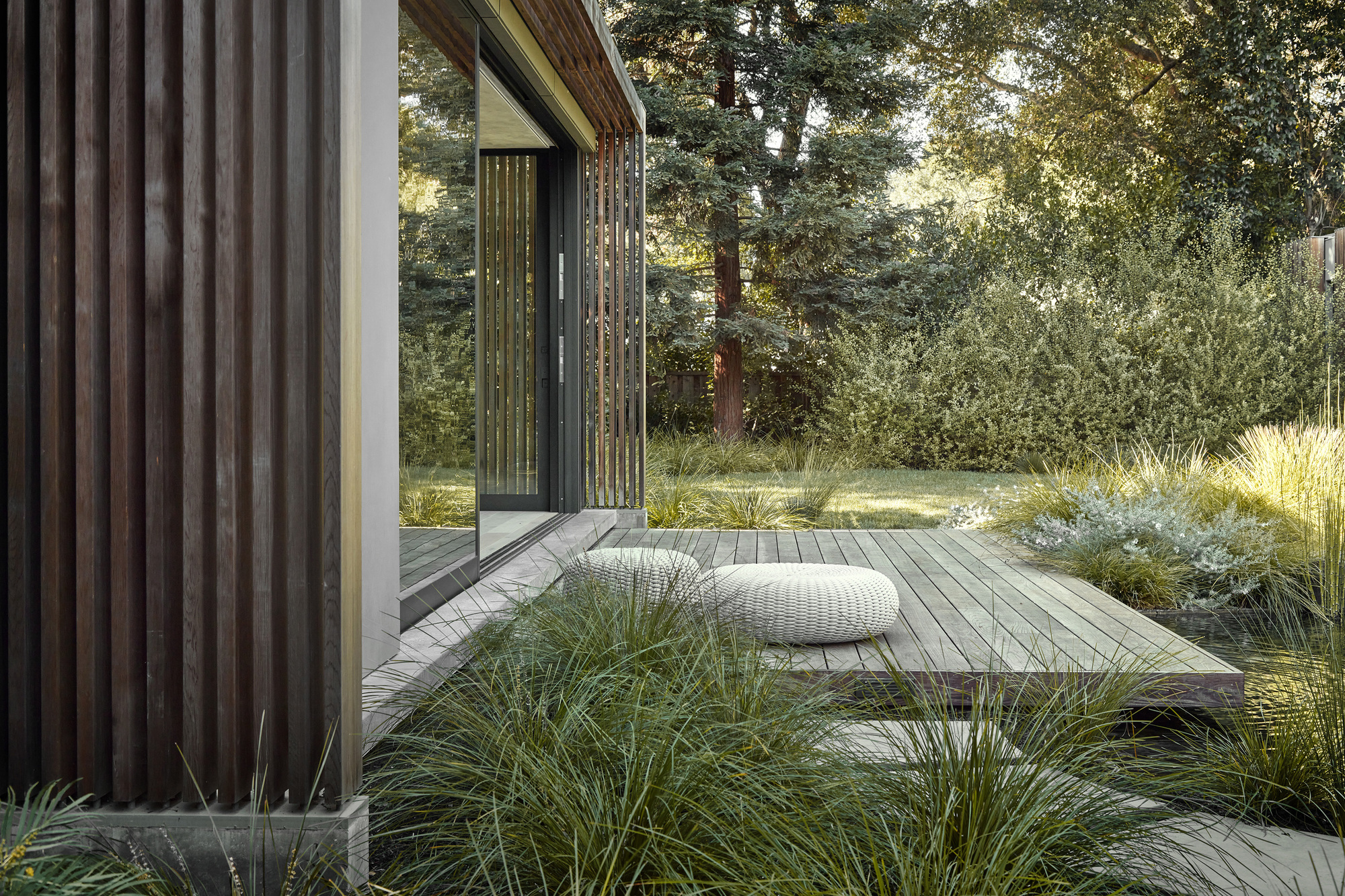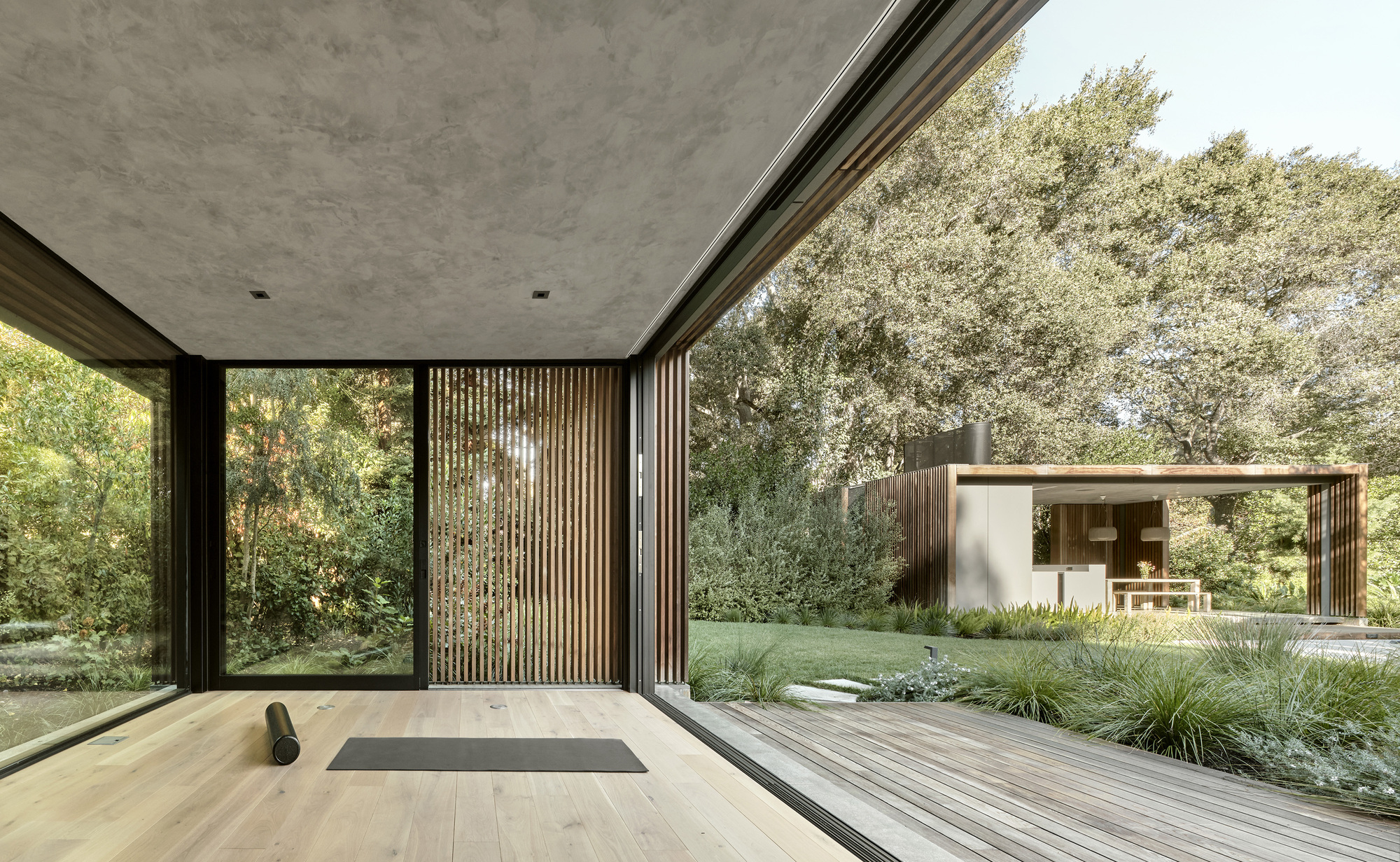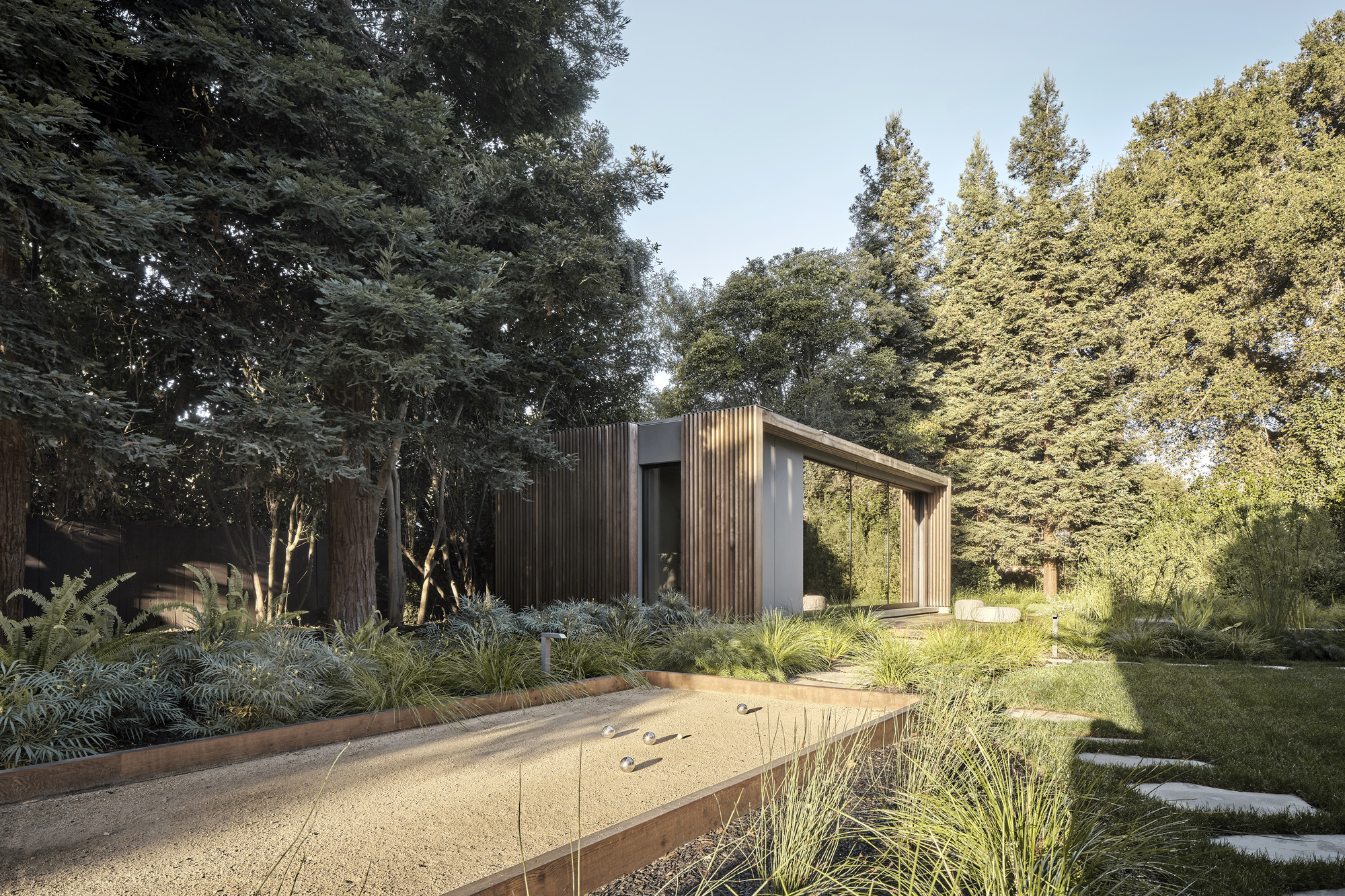 The Atherton pavilions are two accessory structures rich in detail and imagined by the owners to be of the landscape. Both of identical footprint, height, and materials, these jewel boxes have two distinct functions: one serves as an outdoor kitchen and dining space, and the other as a meditation or workout room. After searching extensively for their perfect home, the homeowners fell in love with a contemporary house on a flag lot in Atherton, continuously adding to the property over the years. A small garage expansion and a top floor addition provided additional space for their growing family, but the clients had yet to realize the full potential of their lush and private backyard.