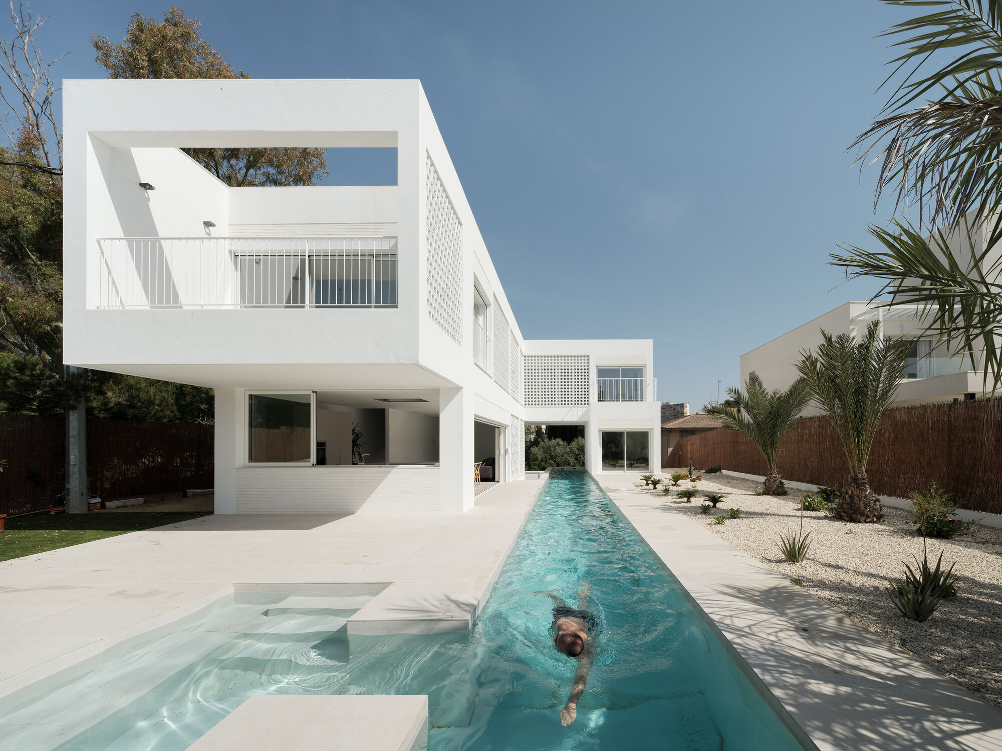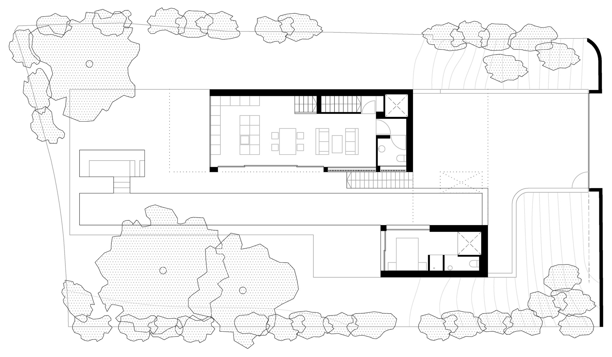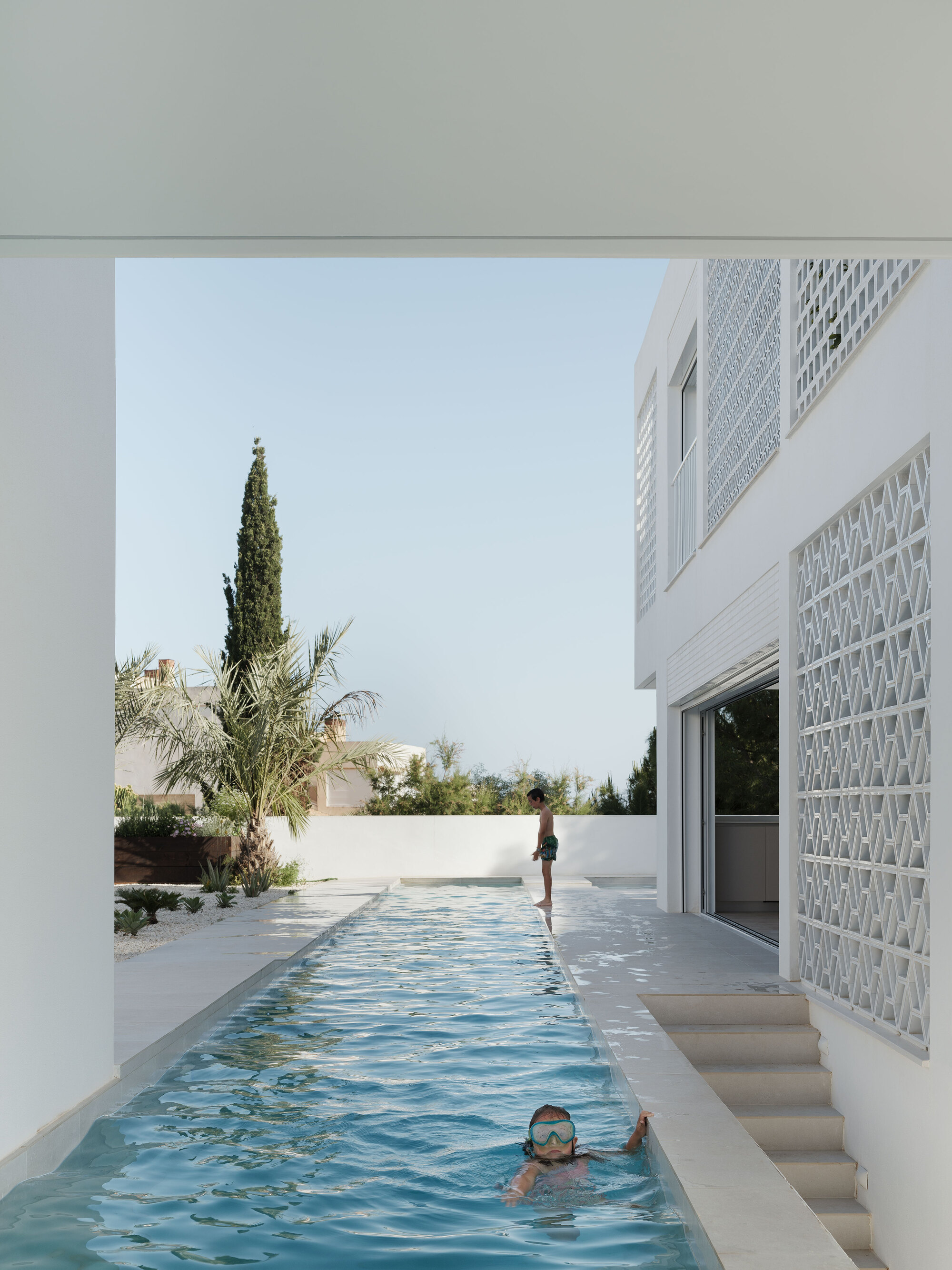 The first and most obvious is the one that refers to the client, who dreams of swimming regularly again. That is why the first decision when drawing the floor plan is to fit a 25m long swimming lane on the plot. This fact, together with the unevenness of the terrain, explains the flight of the L-shaped second floor over the pool and first floor, as well as the access sequence to the interior.