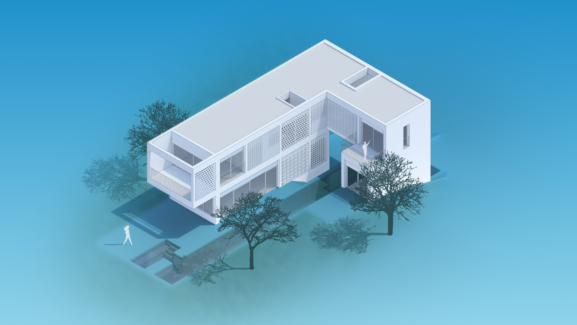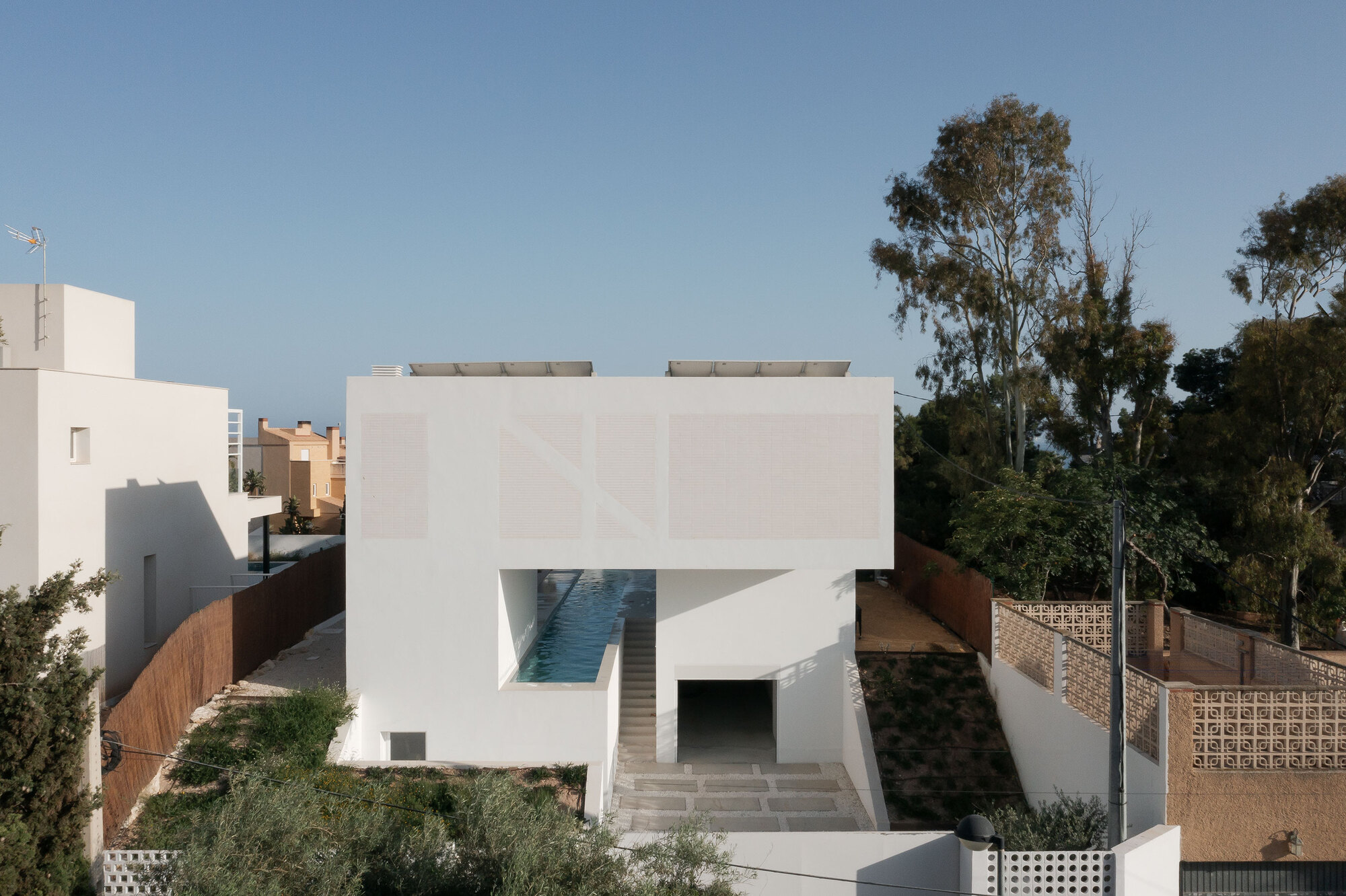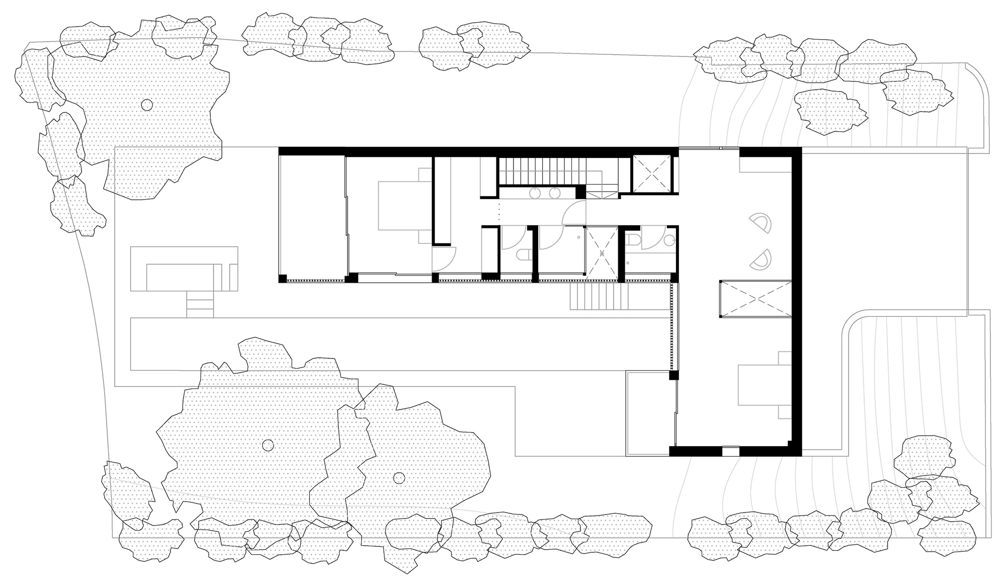 The first and most obvious is the one that refers to the client, who dreams of swimming regularly again. That is why the first decision when drawing the floor plan is to fit a 25m long swimming lane on the plot. This fact, together with the unevenness of the terrain, explains the flight of the L-shaped second floor over the pool and first floor, as well as the access sequence to the interior.