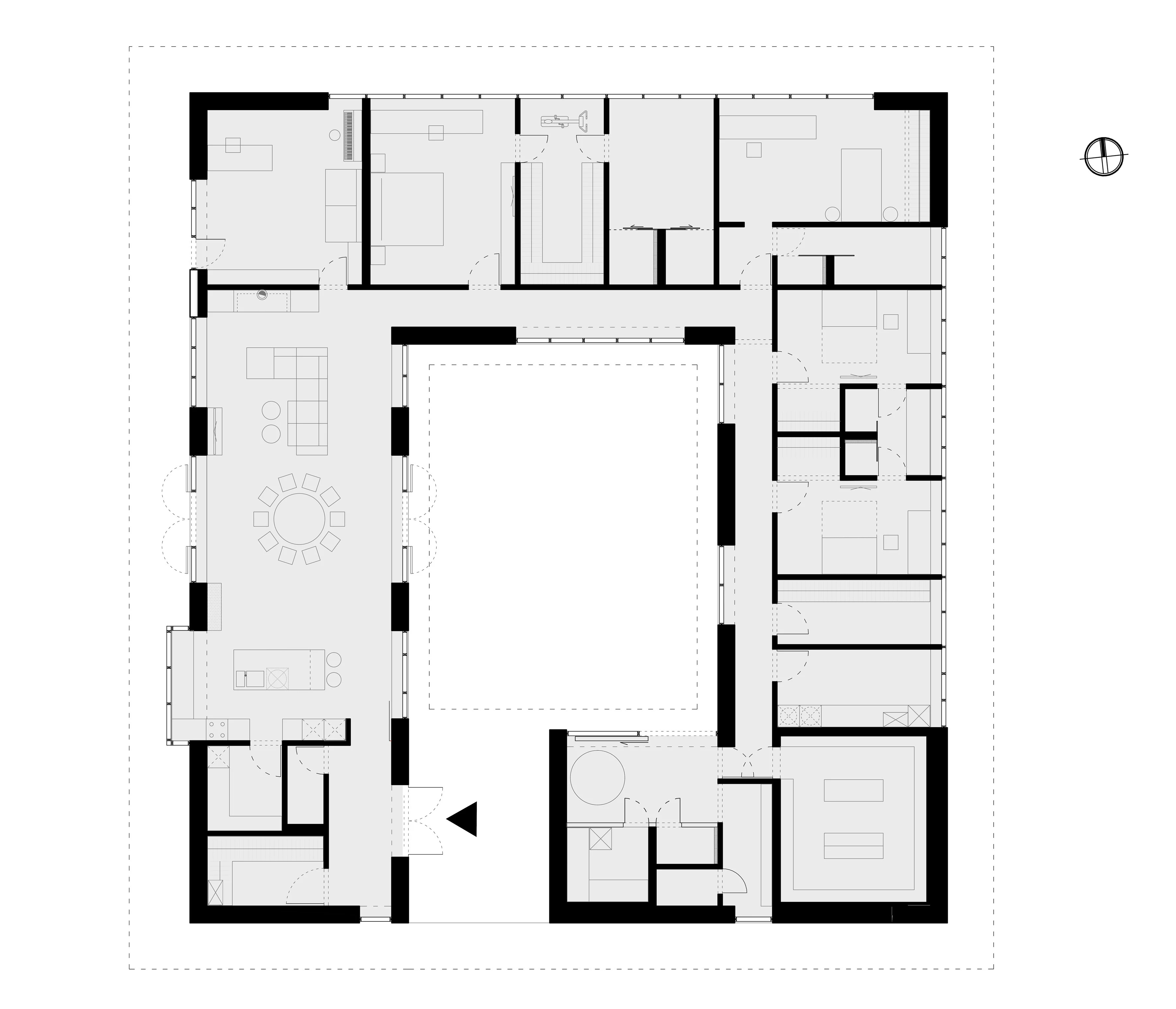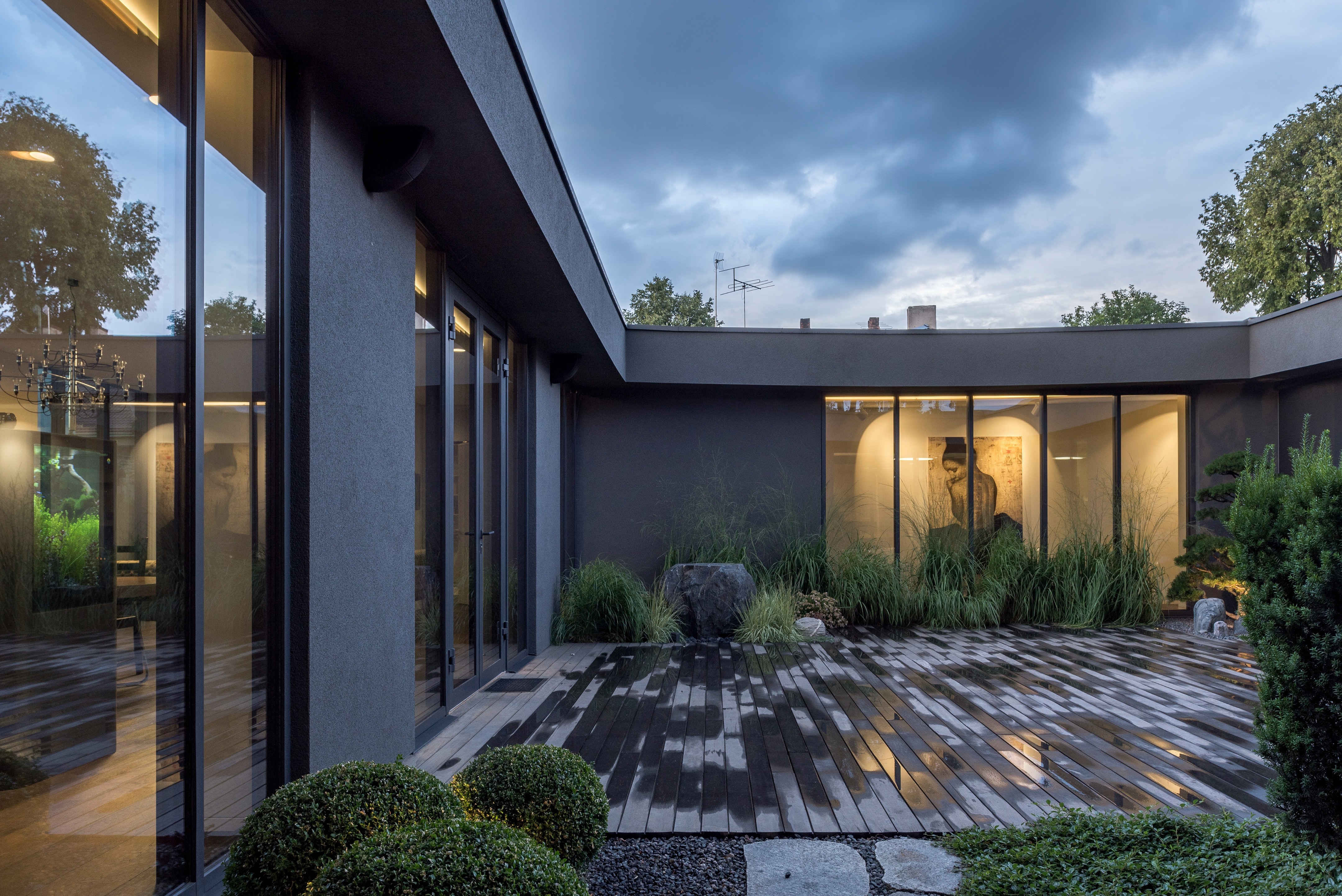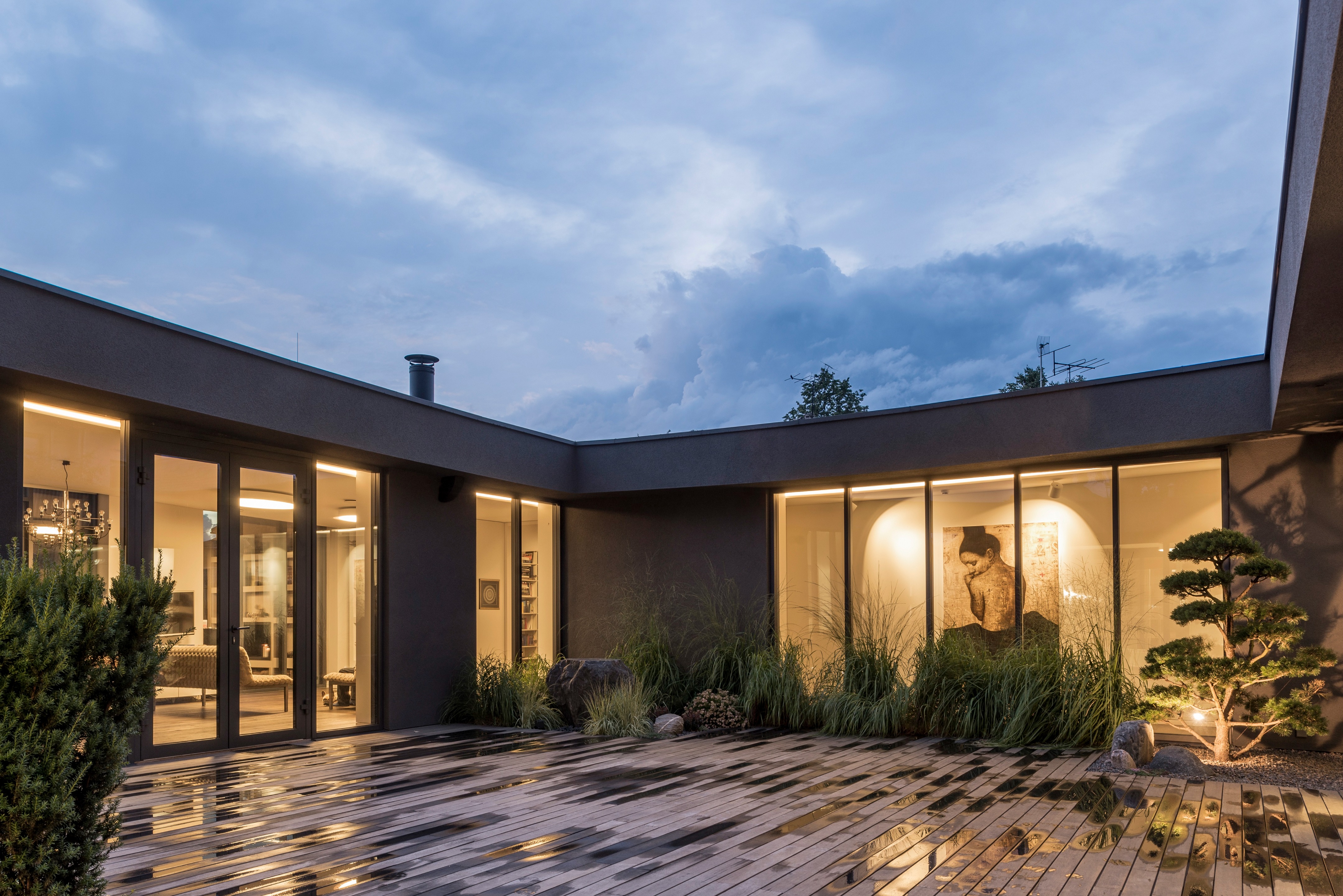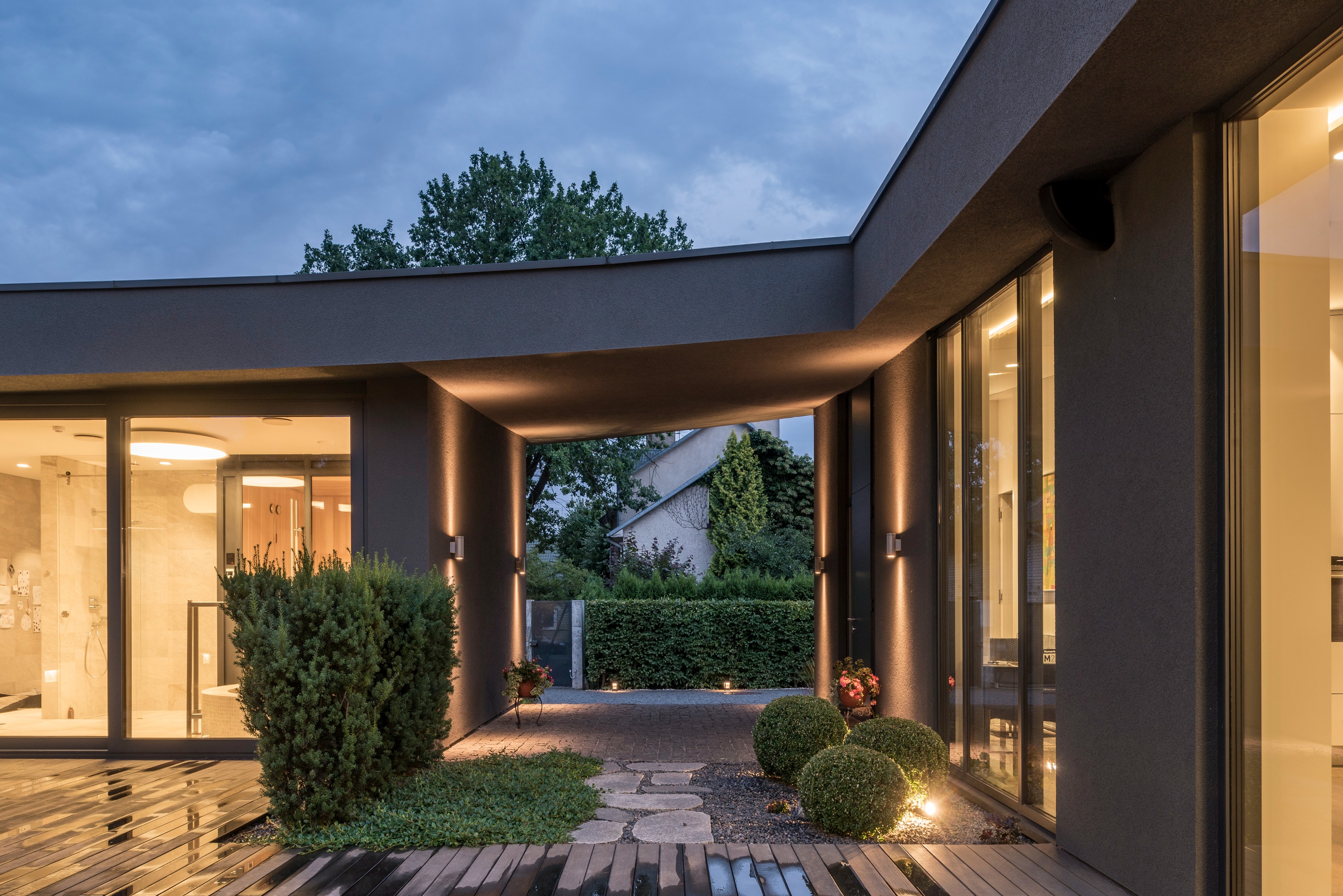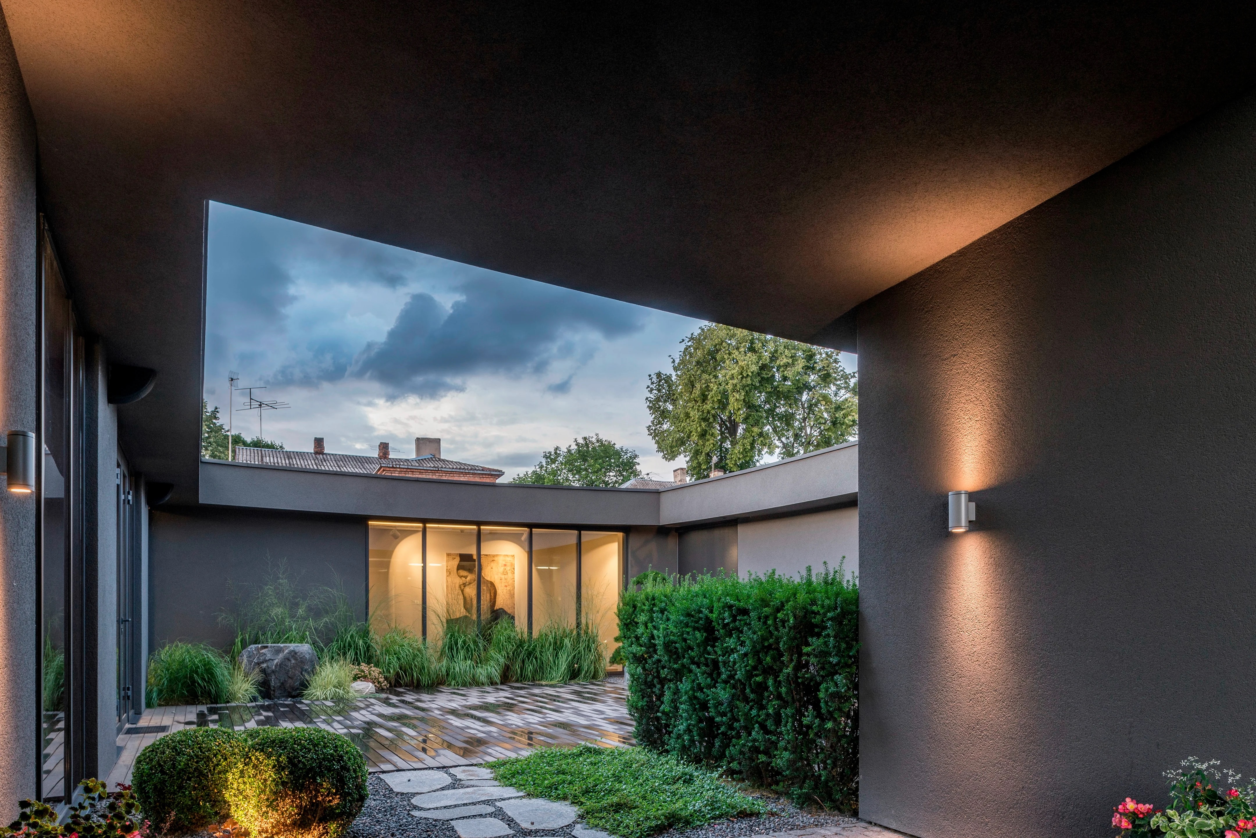 “중정 주위를 도는 동선으로, 중정 하나를 가족 모두가 함께 공유하는 느낌이 들게 만들었습니다.” 설계팀의 설명이다. “그리고 거실, 자녀 방, 와인셀러, 사우나 등 모든 공간들을 복도(저녁에는 특별한 조명을 켜고, 낮에는 중정을 통해 채광이 이루어지며, 수집품들을 전시하고, 조경이 잘 된 중정 풍경을 즐길 수 있는)를 따라 배치했습니다.