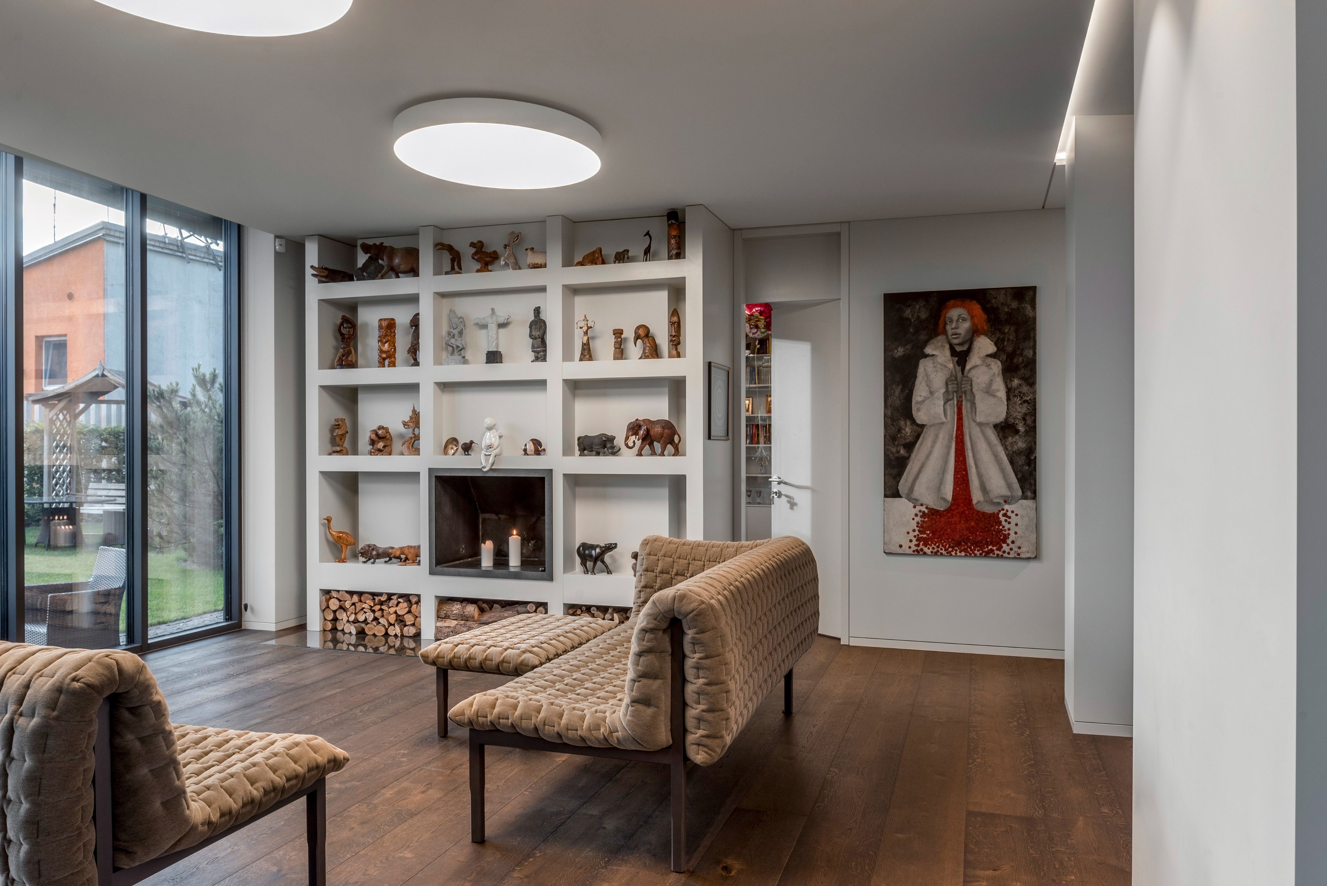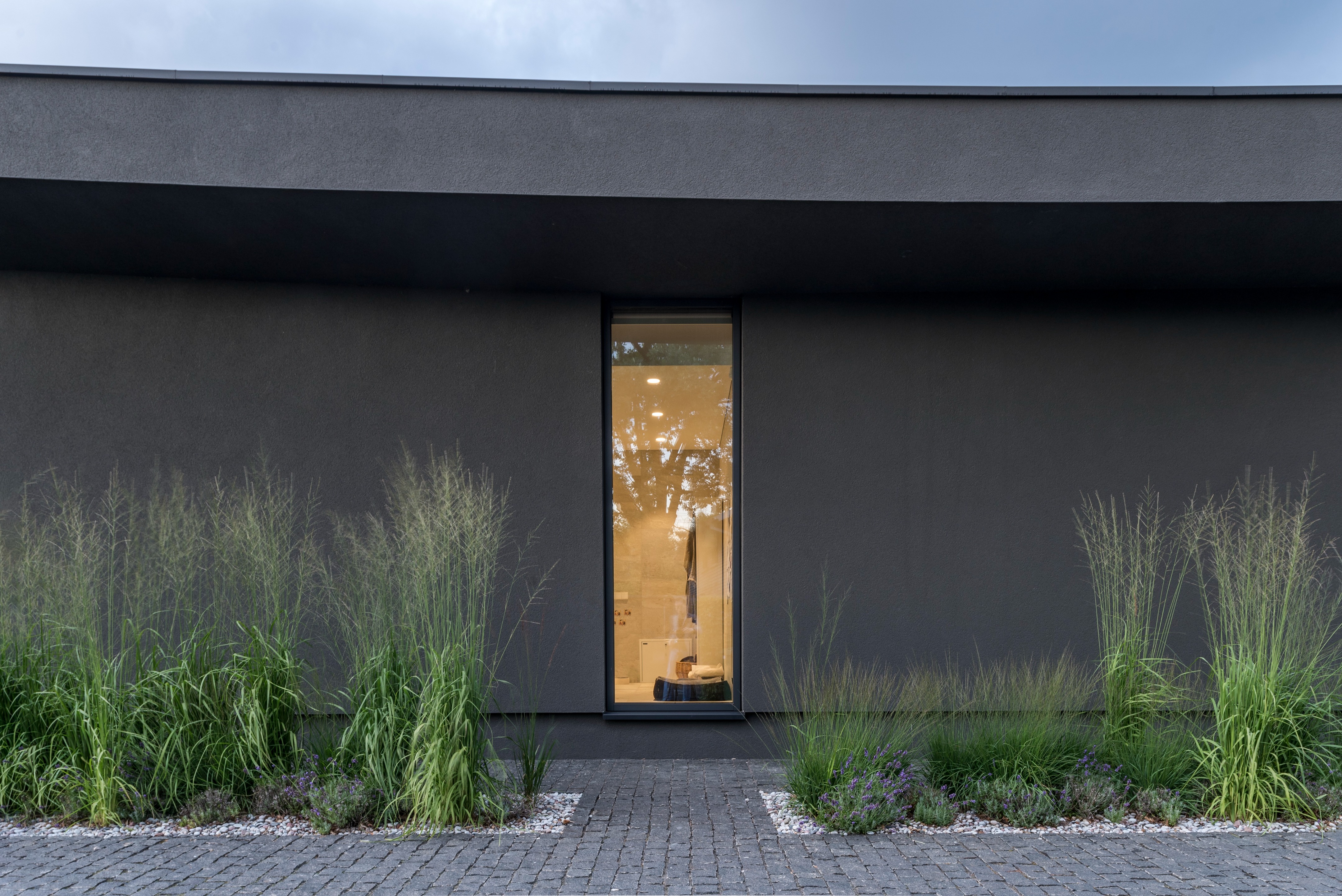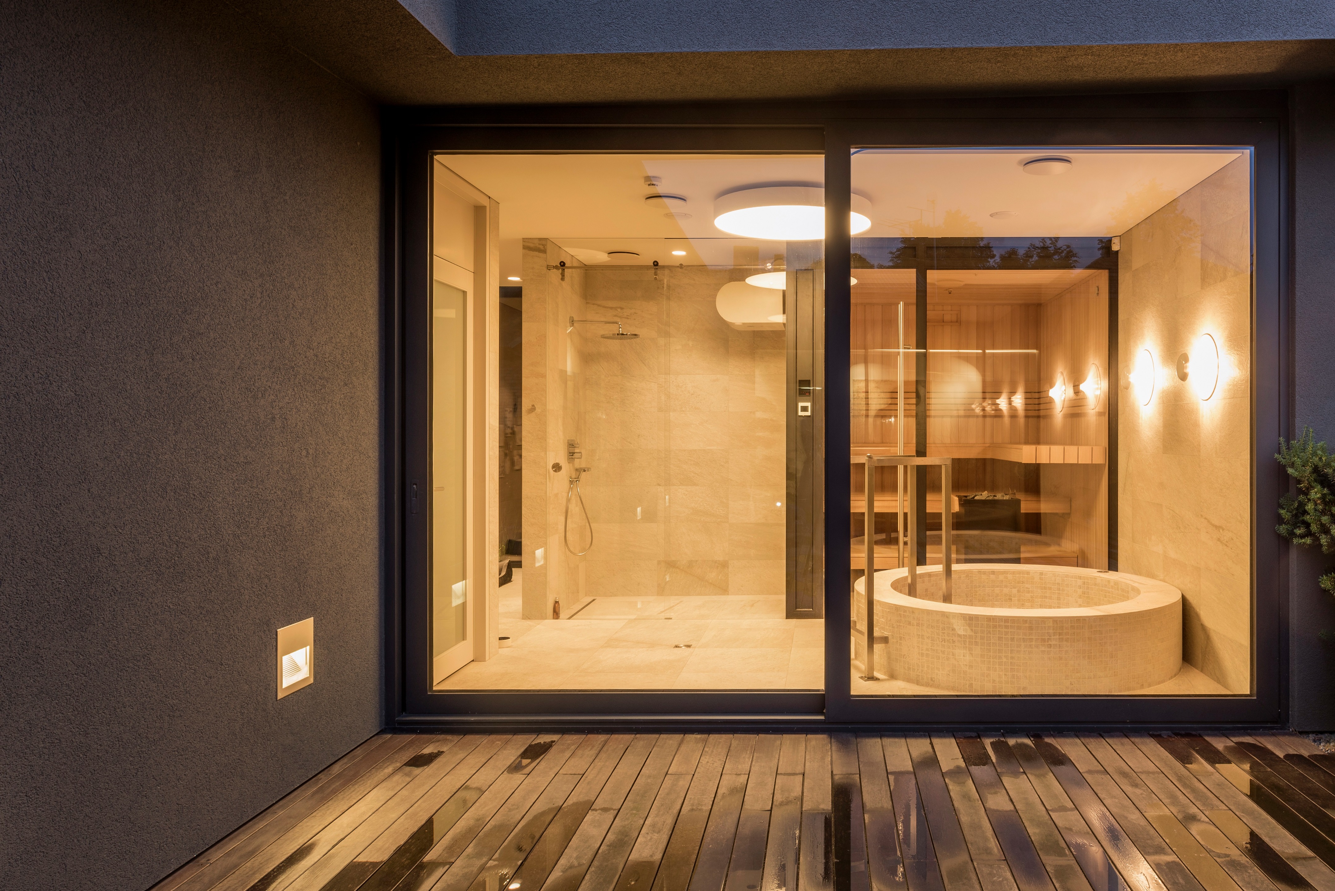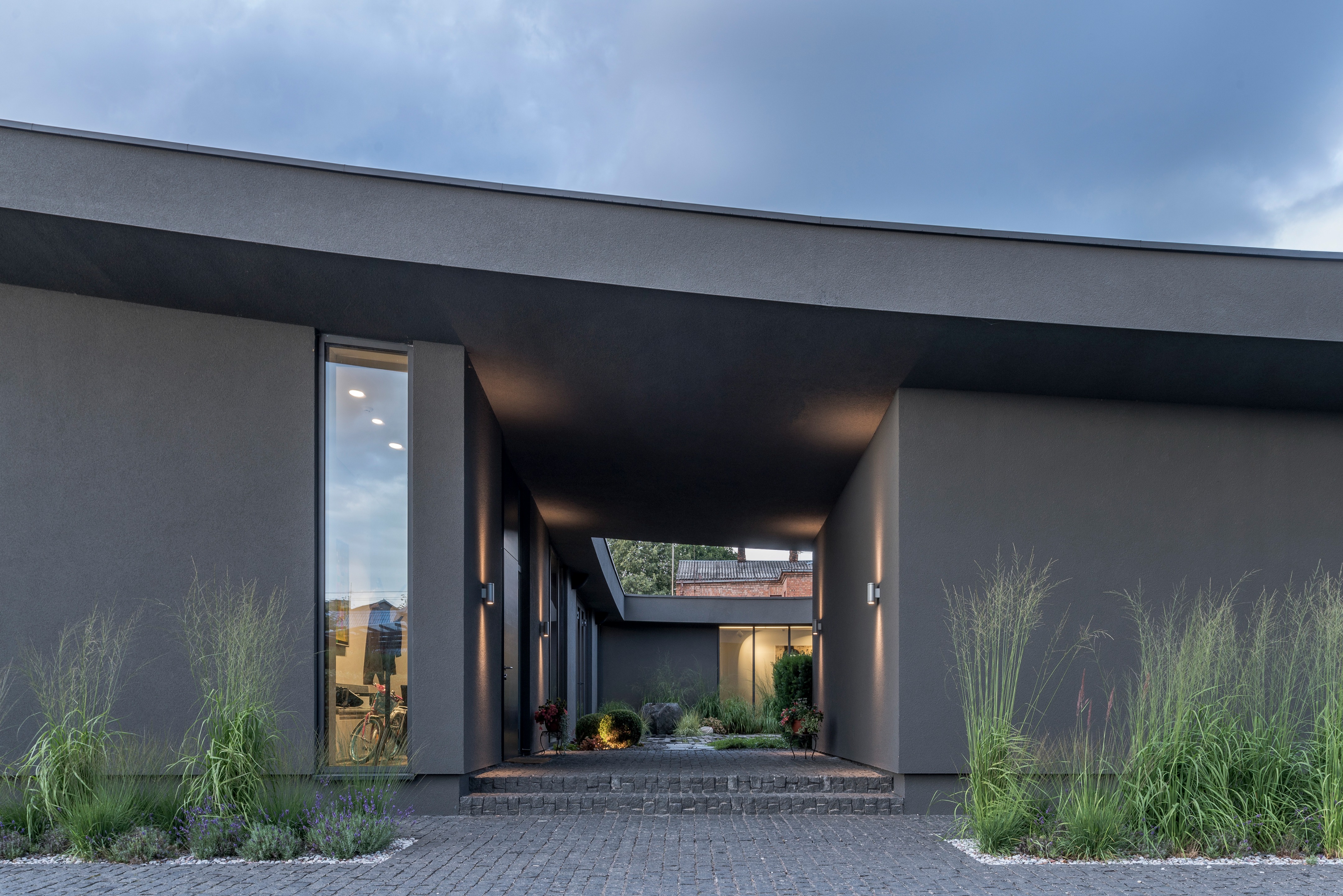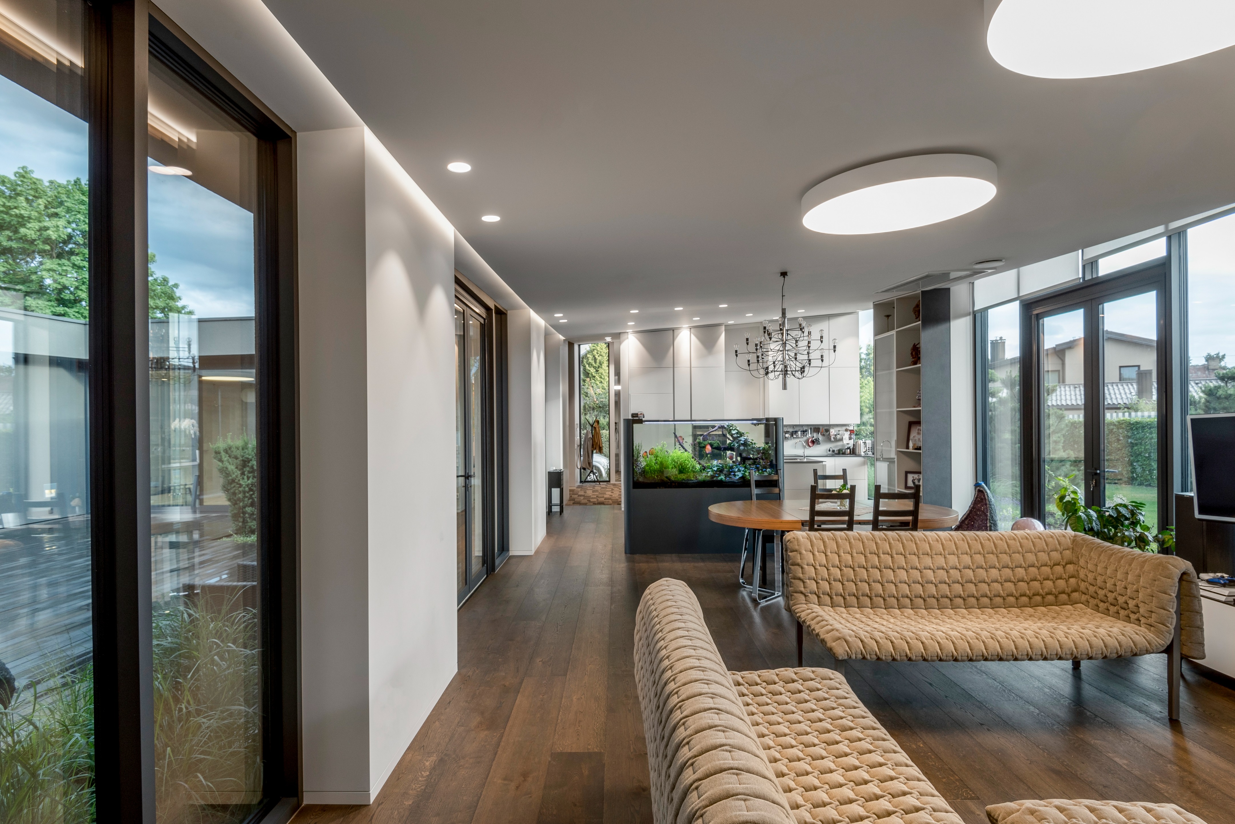 “중정 주위를 도는 동선으로, 중정 하나를 가족 모두가 함께 공유하는 느낌이 들게 만들었습니다.” 설계팀의 설명이다. “그리고 거실, 자녀 방, 와인셀러, 사우나 등 모든 공간들을 복도(저녁에는 특별한 조명을 켜고, 낮에는 중정을 통해 채광이 이루어지며, 수집품들을 전시하고, 조경이 잘 된 중정 풍경을 즐길 수 있는)를 따라 배치했습니다.
