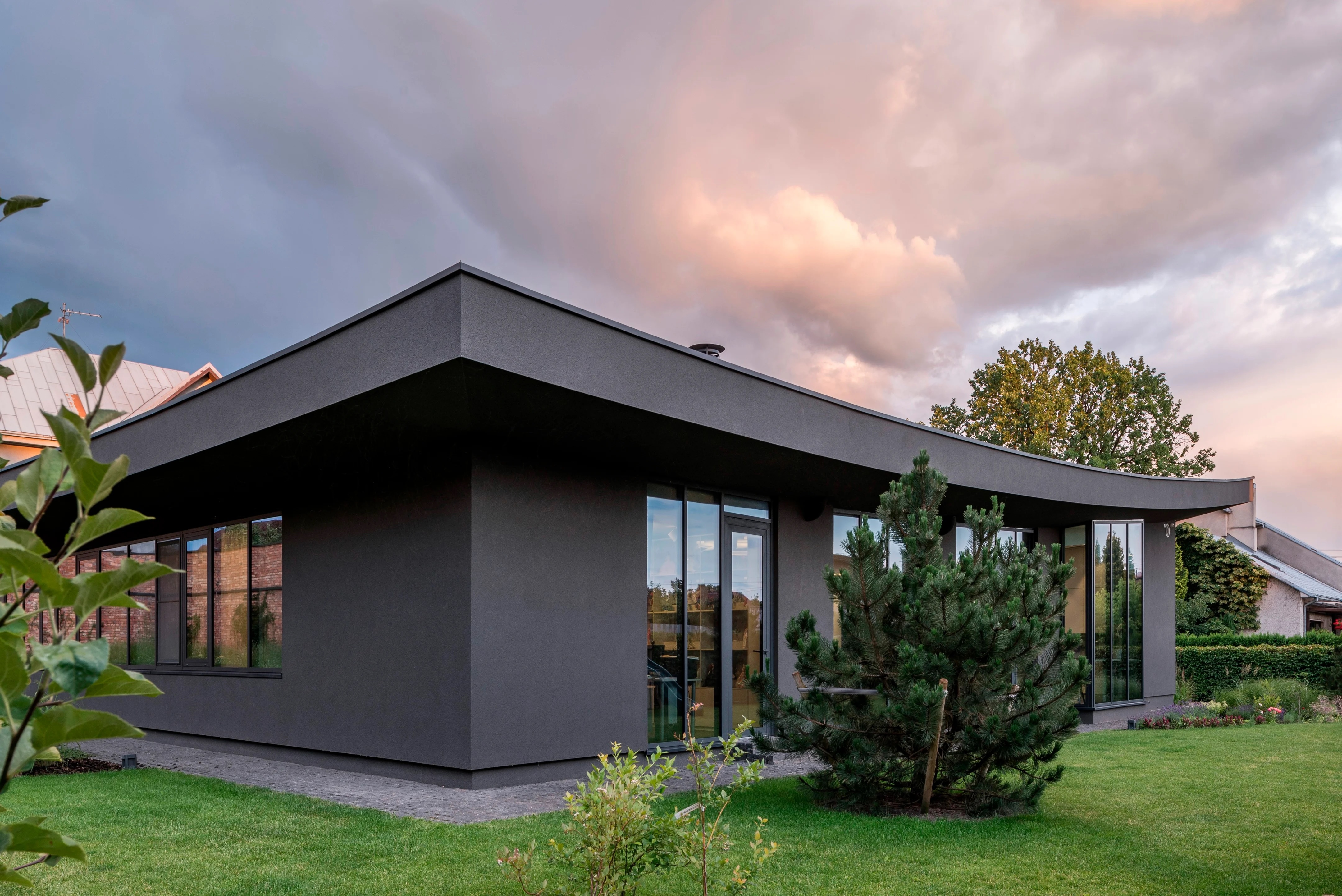 종잇장 하나를 올려놓은 것처럼 가운데로 갈수록 낮아지게 지붕을 디자인하여, 네 귀가 들렸다. 건물 자체에 의해 이웃으로부터 가려진 중정은, 채광과 환기 통로이자 온전히 내밀한 오아시스 같은 외부 휴식 공간이다.