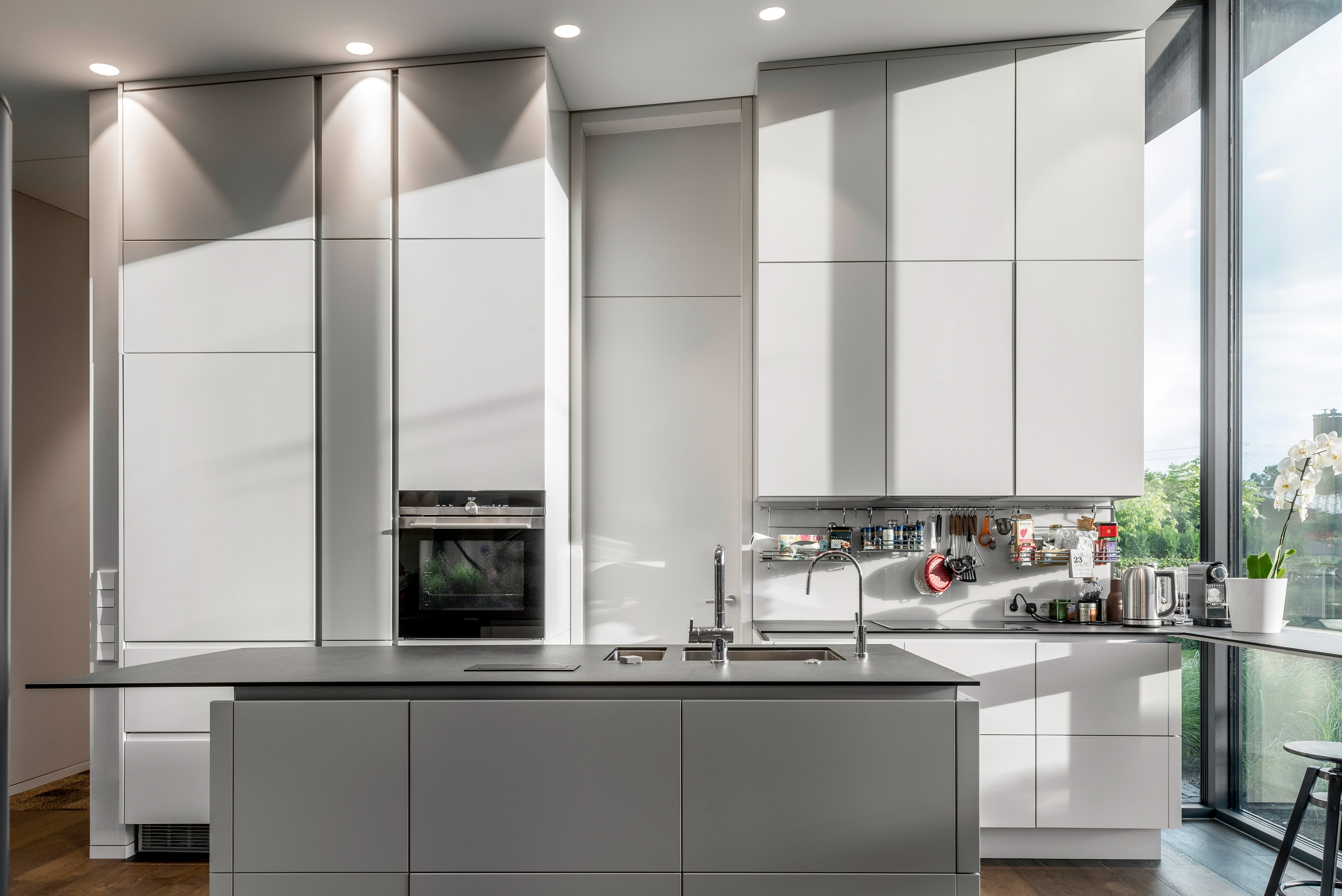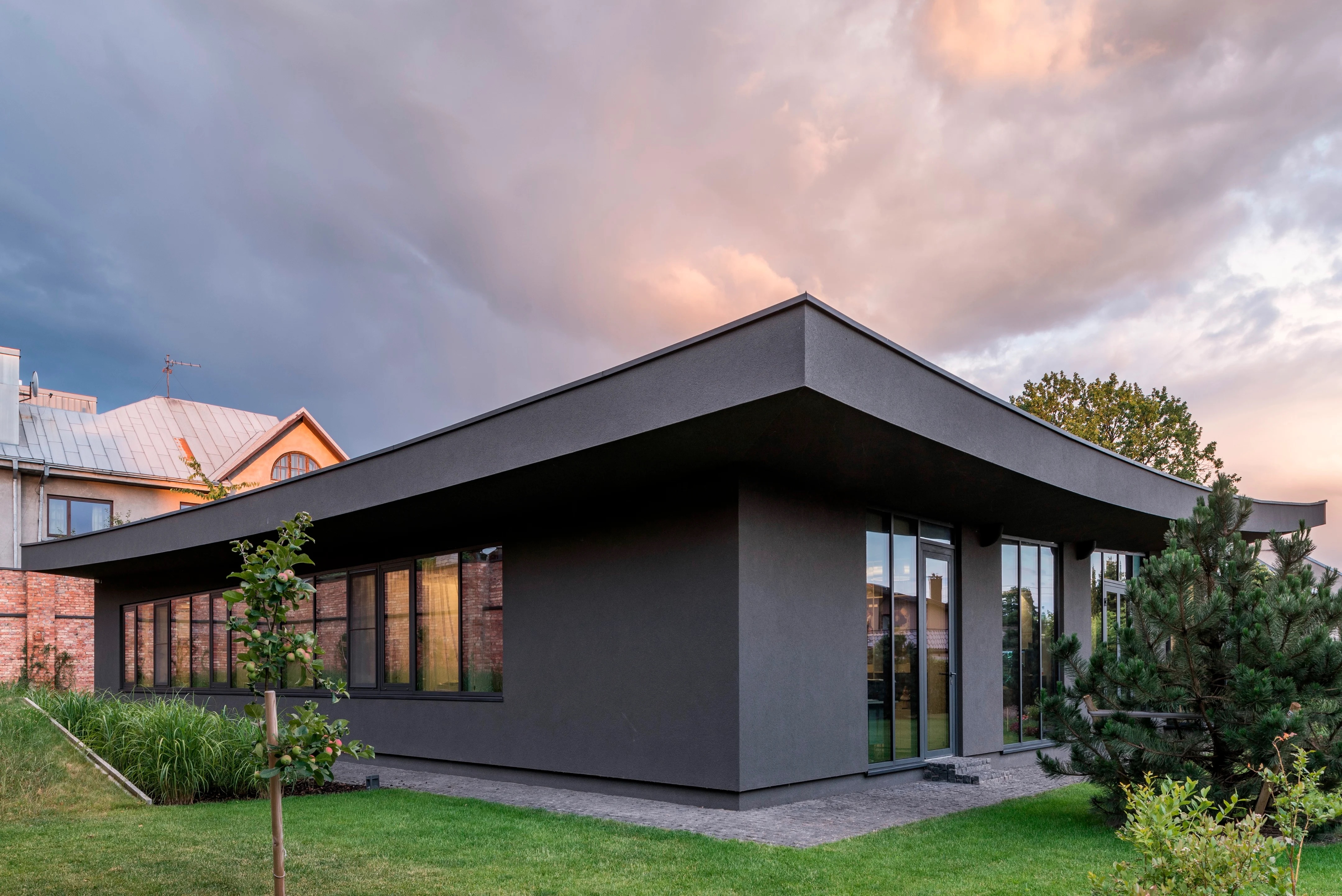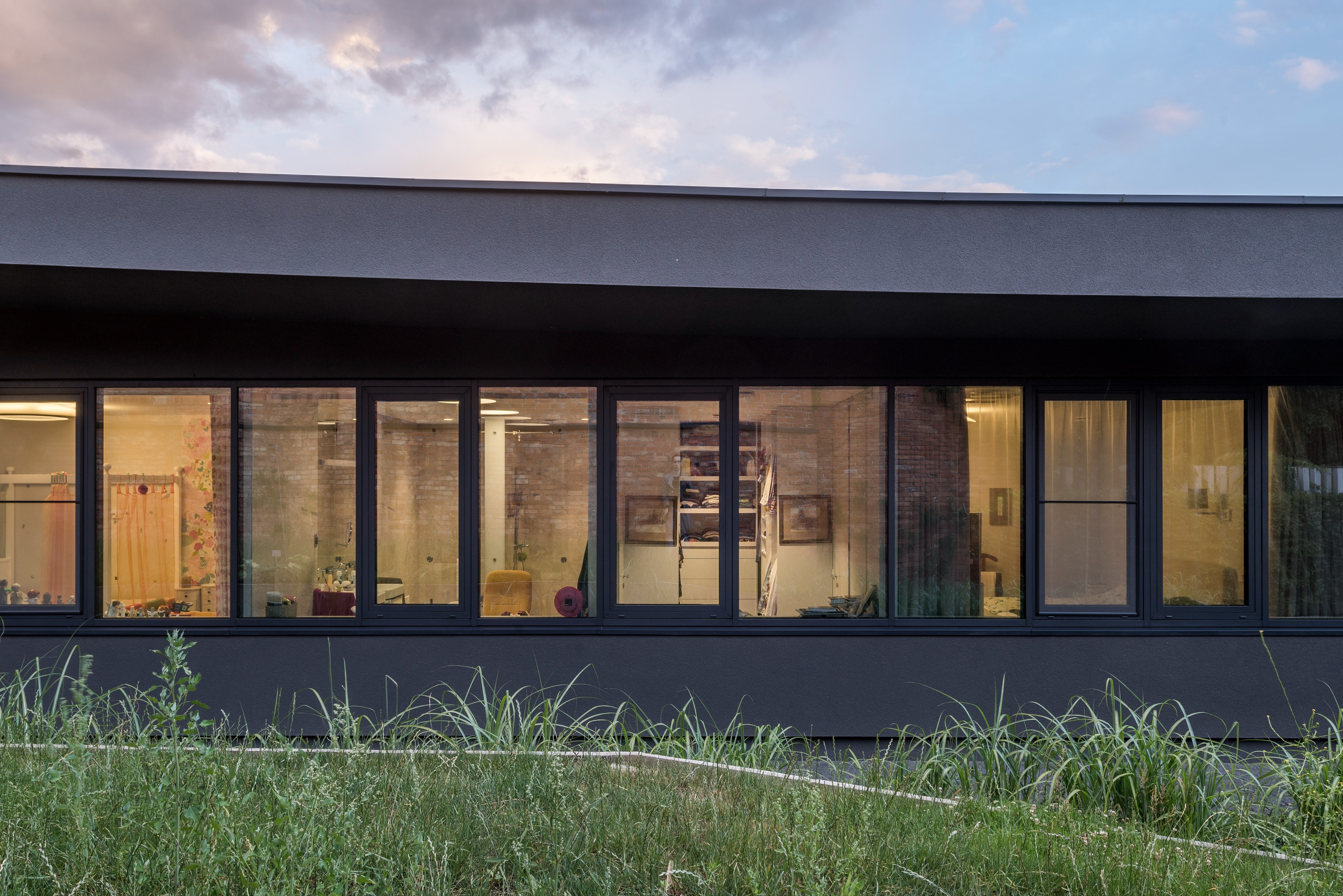 블록 내의 이웃집들이 모두 도로를 향해있기 때문에, 블록 중앙에 있는 이 대지에서는 다른 집들의 뒷모습만 보인다. 하지만 한 가지 긍정적인 측면도 있다. 낭만적인 전원 풍경을 옮겨놓은 듯한, 이웃집들의 뒷마당이 보인다는 것이다. 그래서 모든 공간이 사방을 향하도록 평면을 계획하고 입면도 전후좌우 구분 없이 디자인을 했다고 한다. 그중에서도 가장 좋은 풍경을 향해, 거실, 주방, 식당 등 공용 공간이 배치되었고, 복도 끝 맨 안쪽에 사우나가 위치한다.