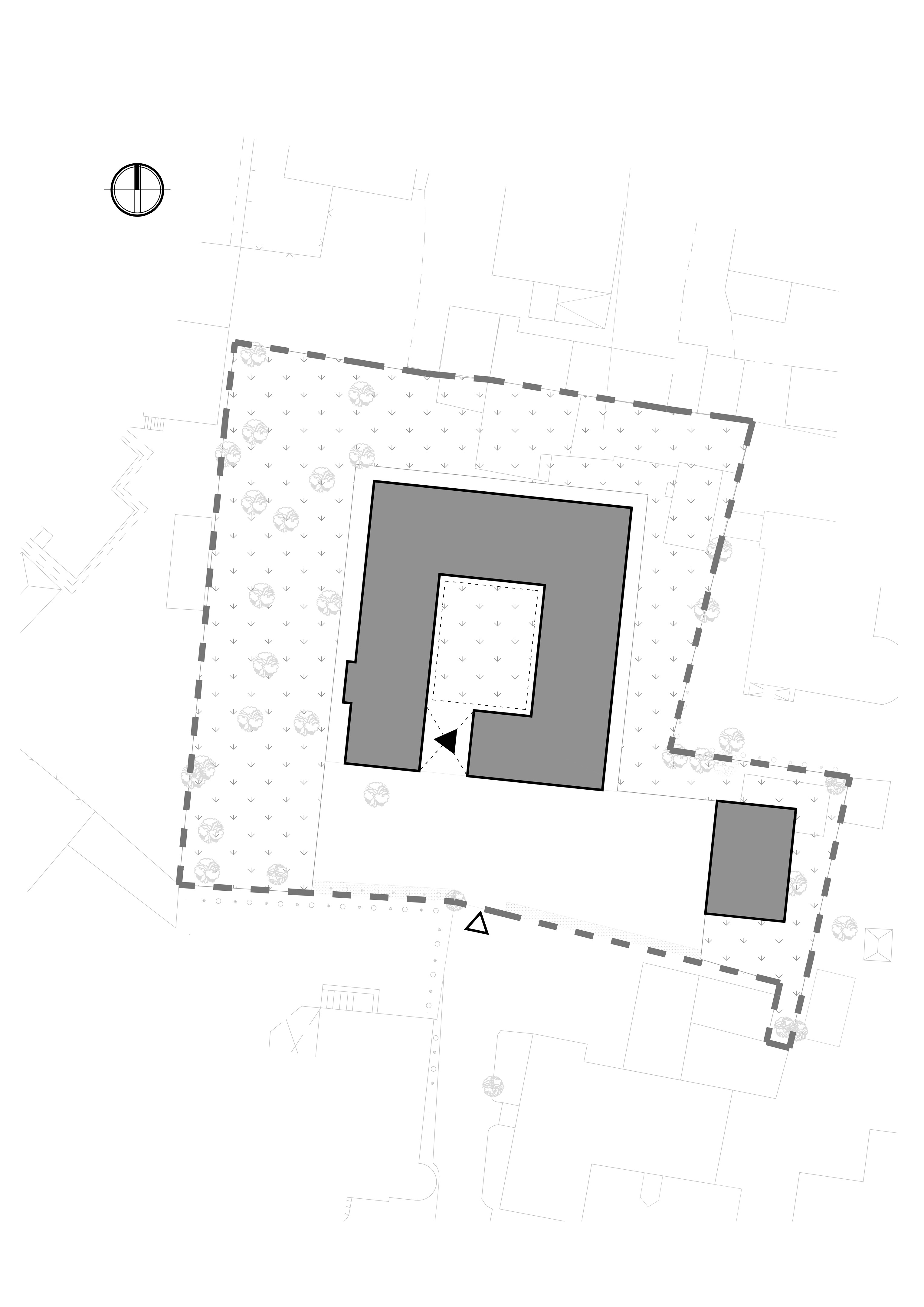 주변의 일반적인 집들과 달리 이 집은, 진입로는 좁지만 매우 큰 대지에 지어졌다. 블록 가운데에 위치하여, 사방이 이웃집들로 에워싸인 흥미로운 대지이다.