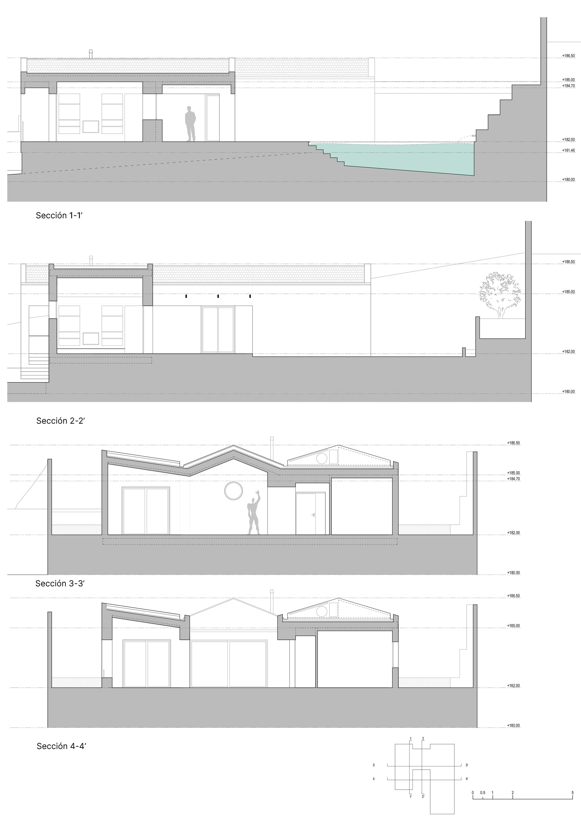 거실 영역이, 침실 영역 및 수영장과 밀접하게 연결된 구조이다. 침실 영역에는, 4개의 침실과 두 개의 욕실이 갖추어졌다. 그중 공용 욕실은 외부 수영장에서도 쉽게 사용할 수 있게 배치되었다. 그리고 입구 쪽에 위치한 침실 하나는 오피스로도 사용할 수 있게 만들어졌다.