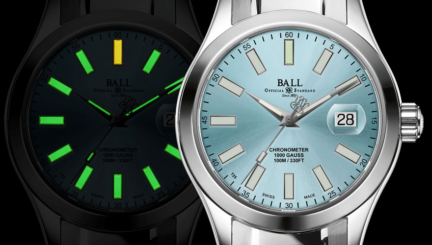 마이크로 가스 튜브 방식의 아워 인덱스와 싸이클롭스 날짜창이 특징인 볼 워치 시계로, COSC 인증 크로노미터 무브먼트인 셀프 와인딩 칼리버 BALL RR1103-C가 장착되어 있는 Engineer III Marvelight Chronometer(40mm) NM9026C-S6CJ-BE이다.