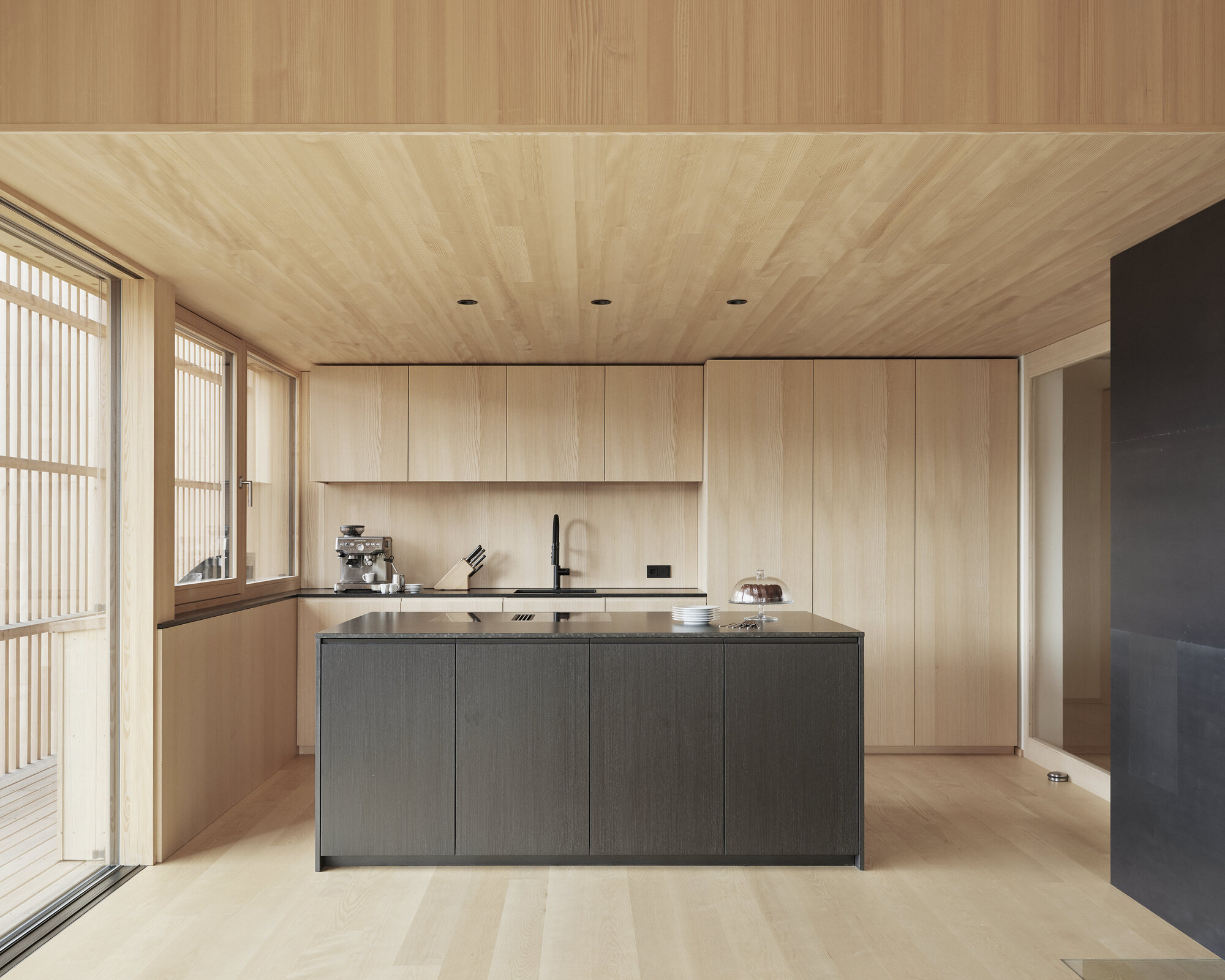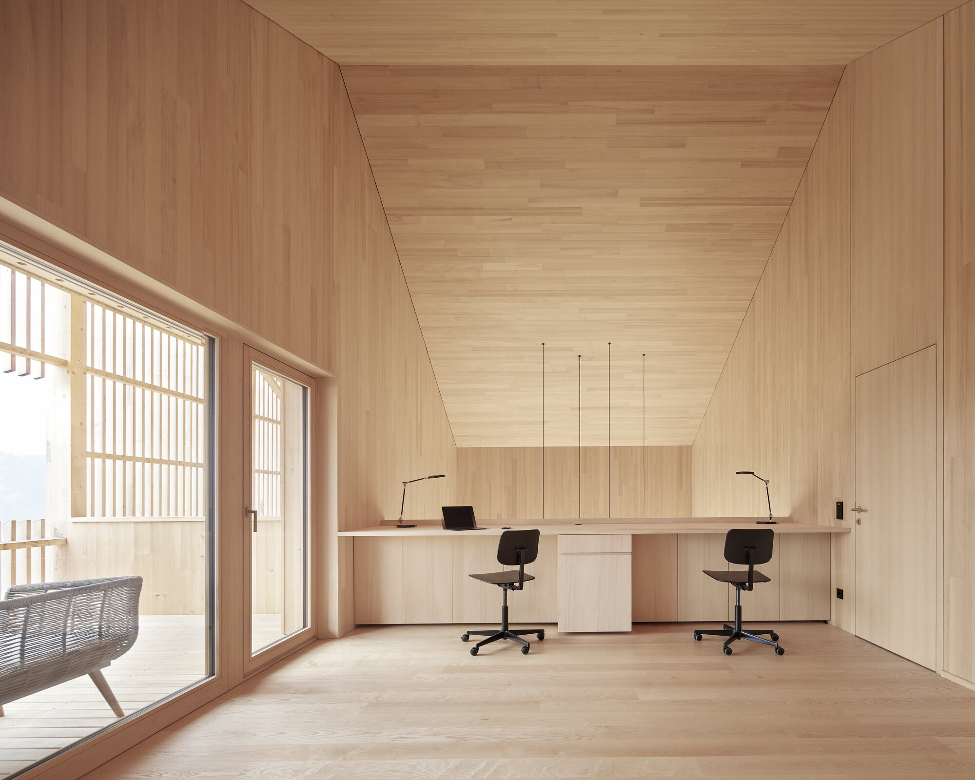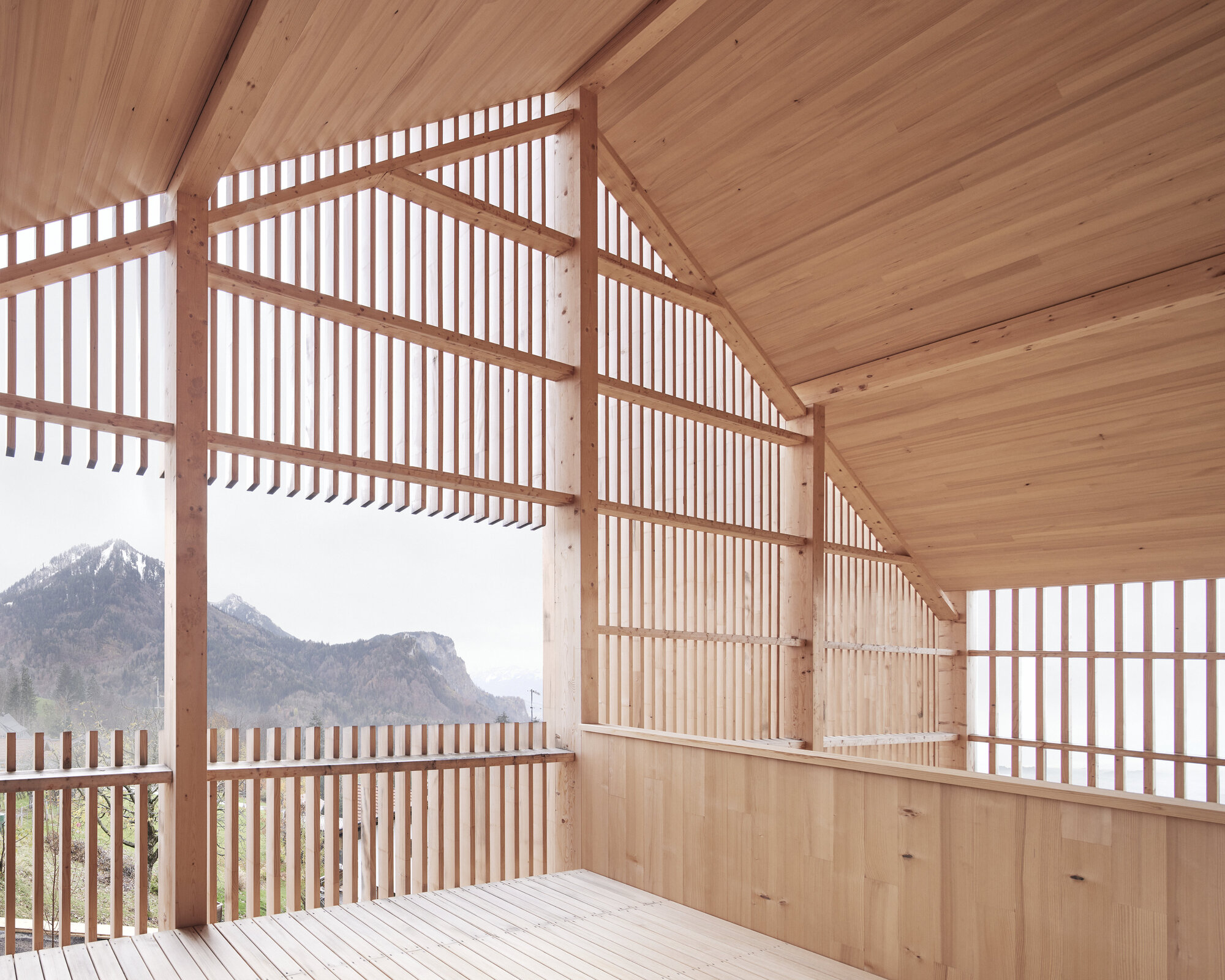 이질적인 재료로 이루어진 건물 전체 외부가 전나무 원목 부재로 균일하게 마감되었다. 이 외피와 기존 건물 사이의 반 외부 공간들에 의해 시각적으로나 기능적으로 내부와 외부 사이가 강하게 연결되었다. 그리고 내부는 거대한 가구처럼 인테리어되었다.