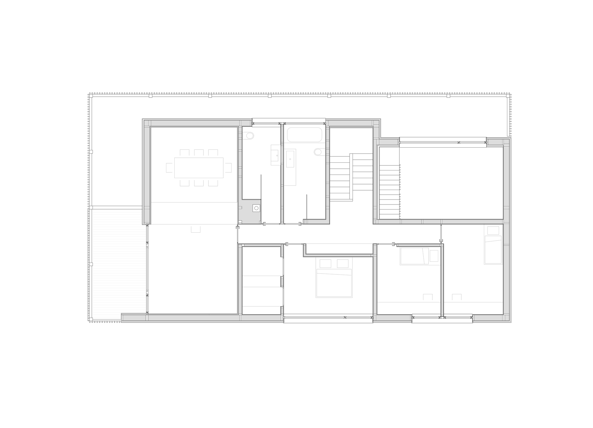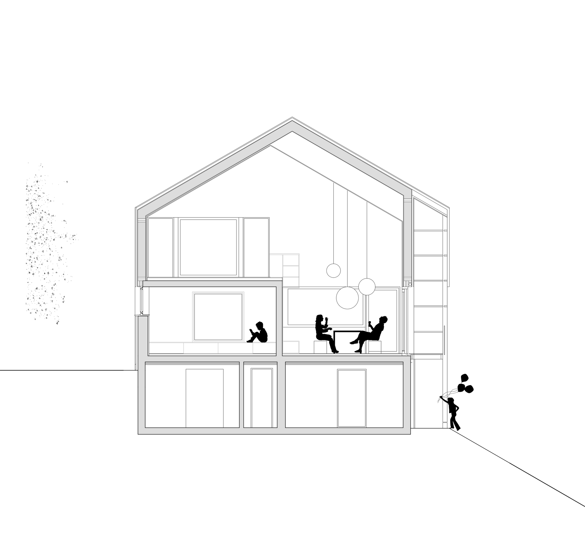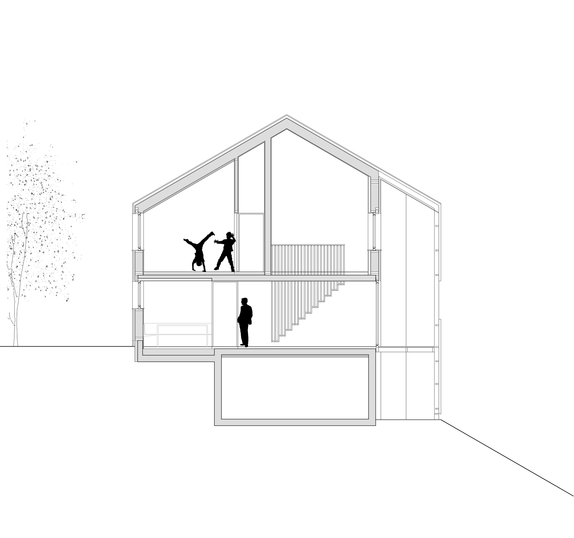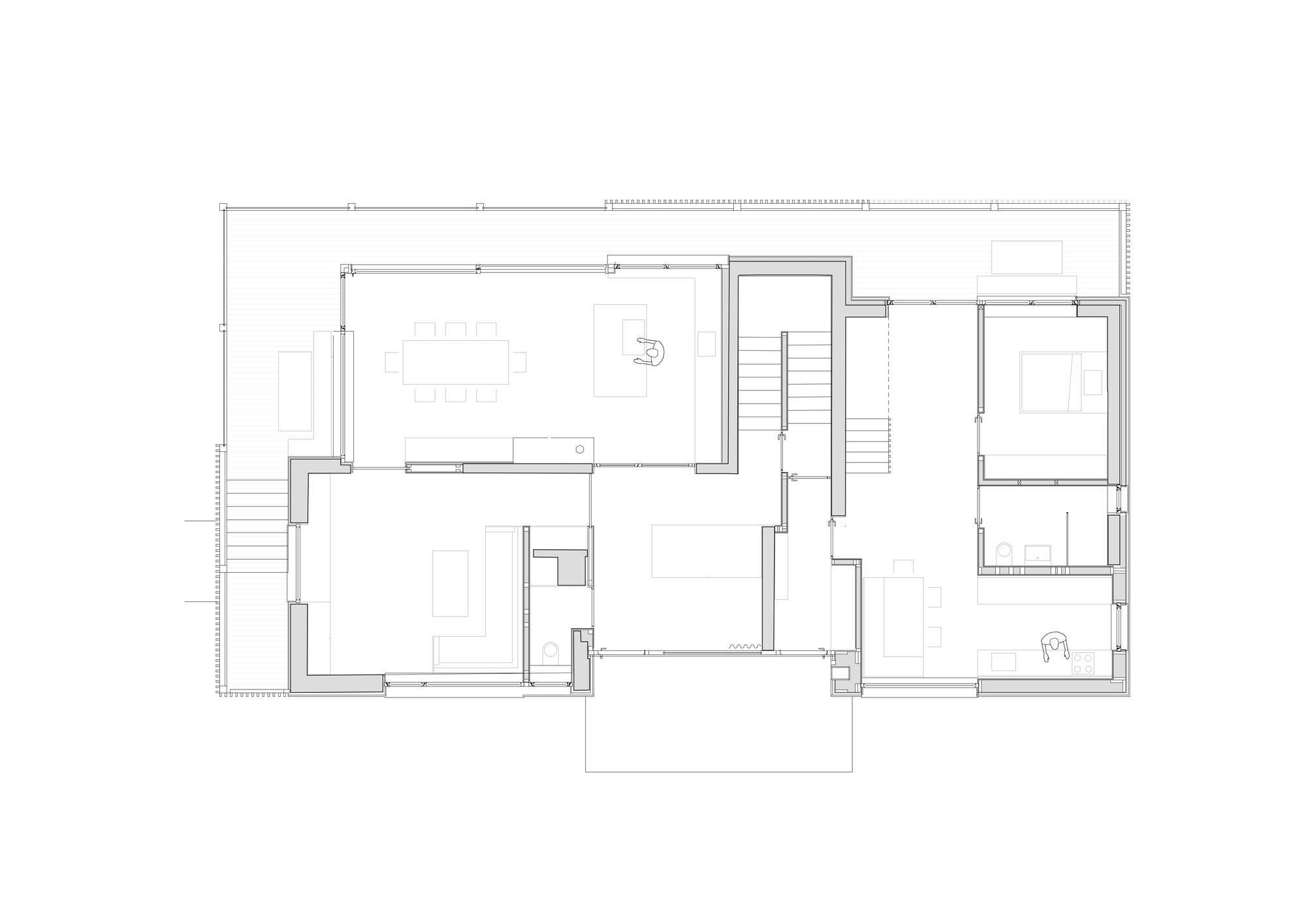 지하층과 1층은 개조를 했고 2층은 층고가 낮아서 철거 후 현대식 목조 건물로 대체되었다. 구조 조정을 통해, 두 층에 걸친 거실, 식사 공간 등 파티에 필요한 공간이 넉넉하게 확보되었다.