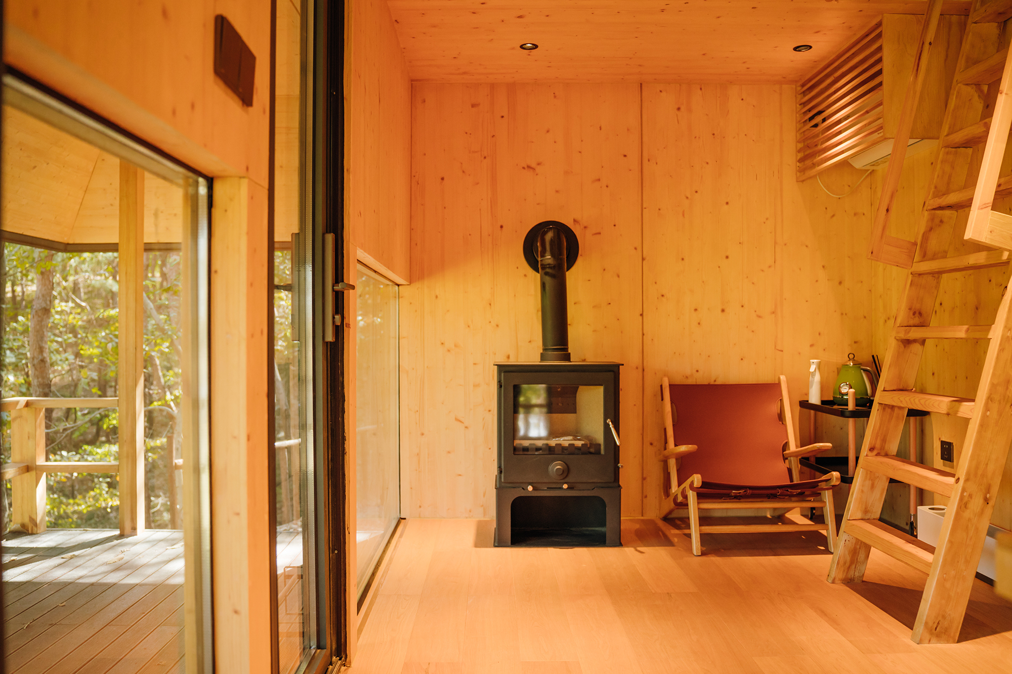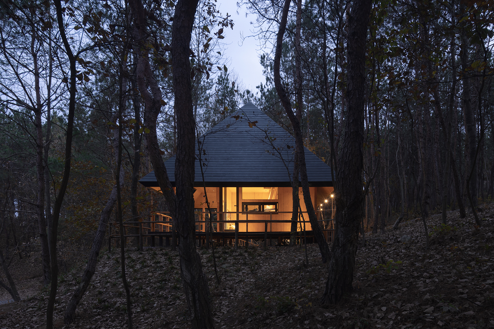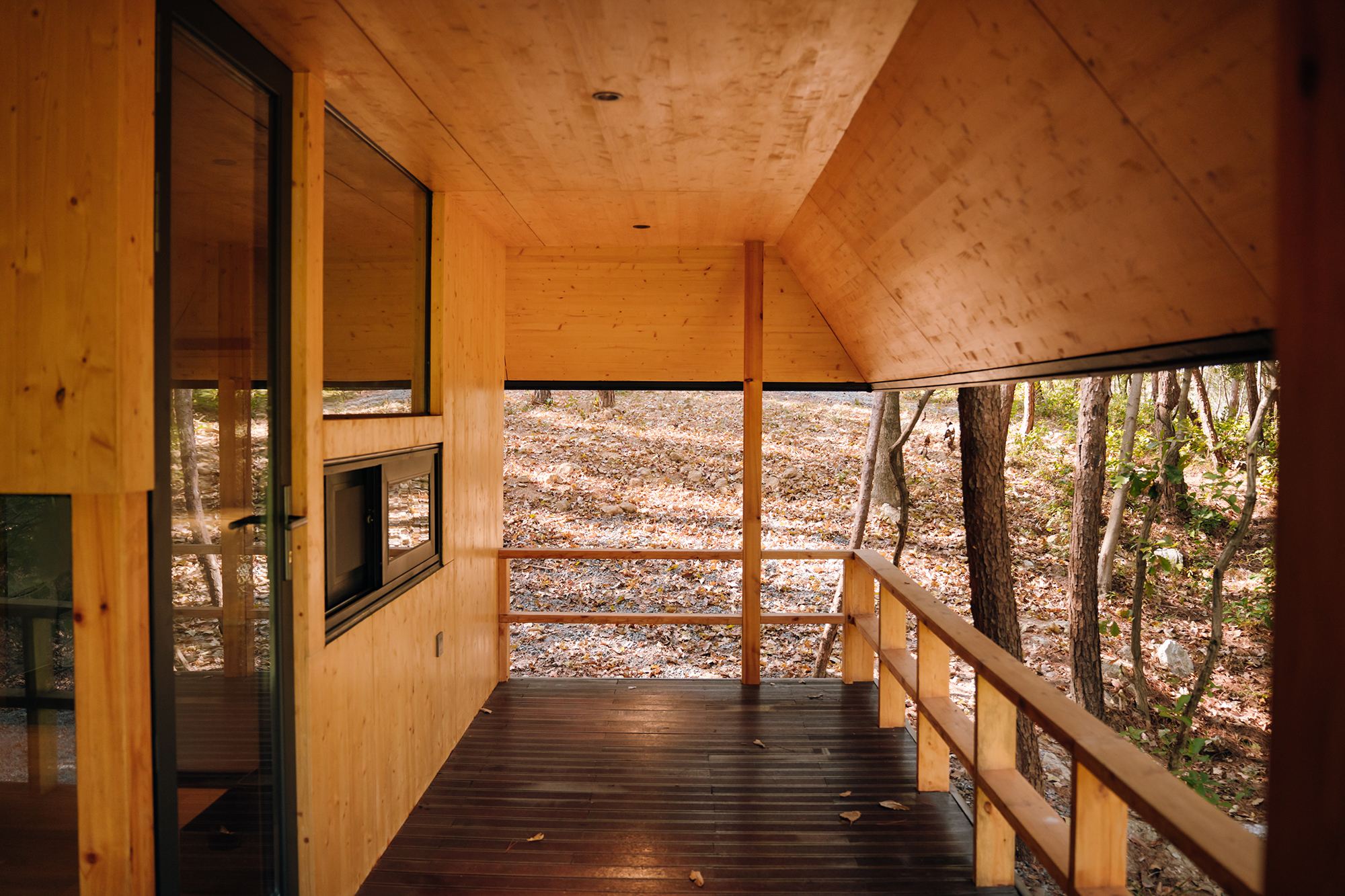 숲이 우거진 언덕에 위치한 숙소이다. 야생이나 다름없는 환경이라는 점을 감안하여, 원시 주거에서처럼 안도감을 제공하도록 디자인되었다.