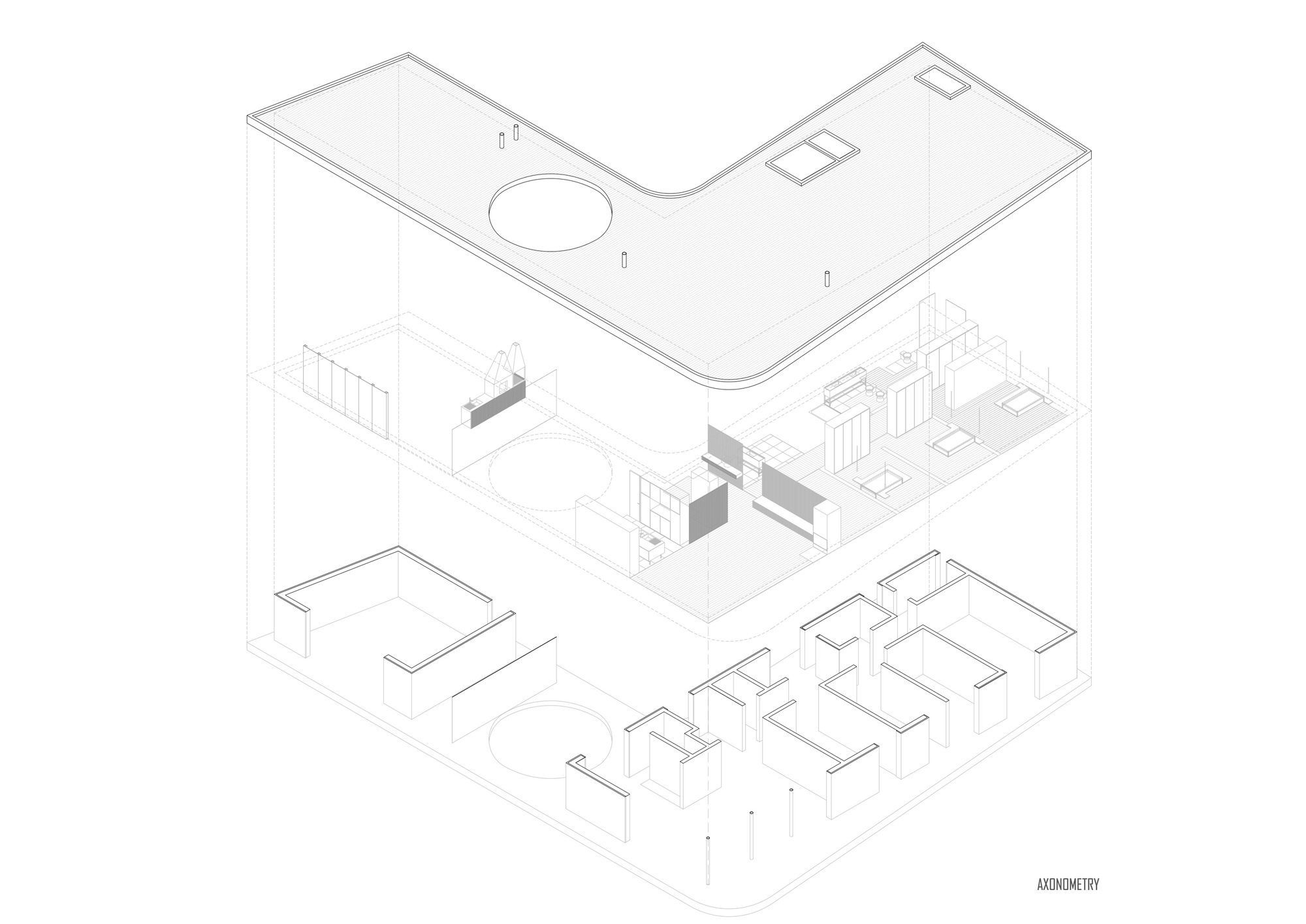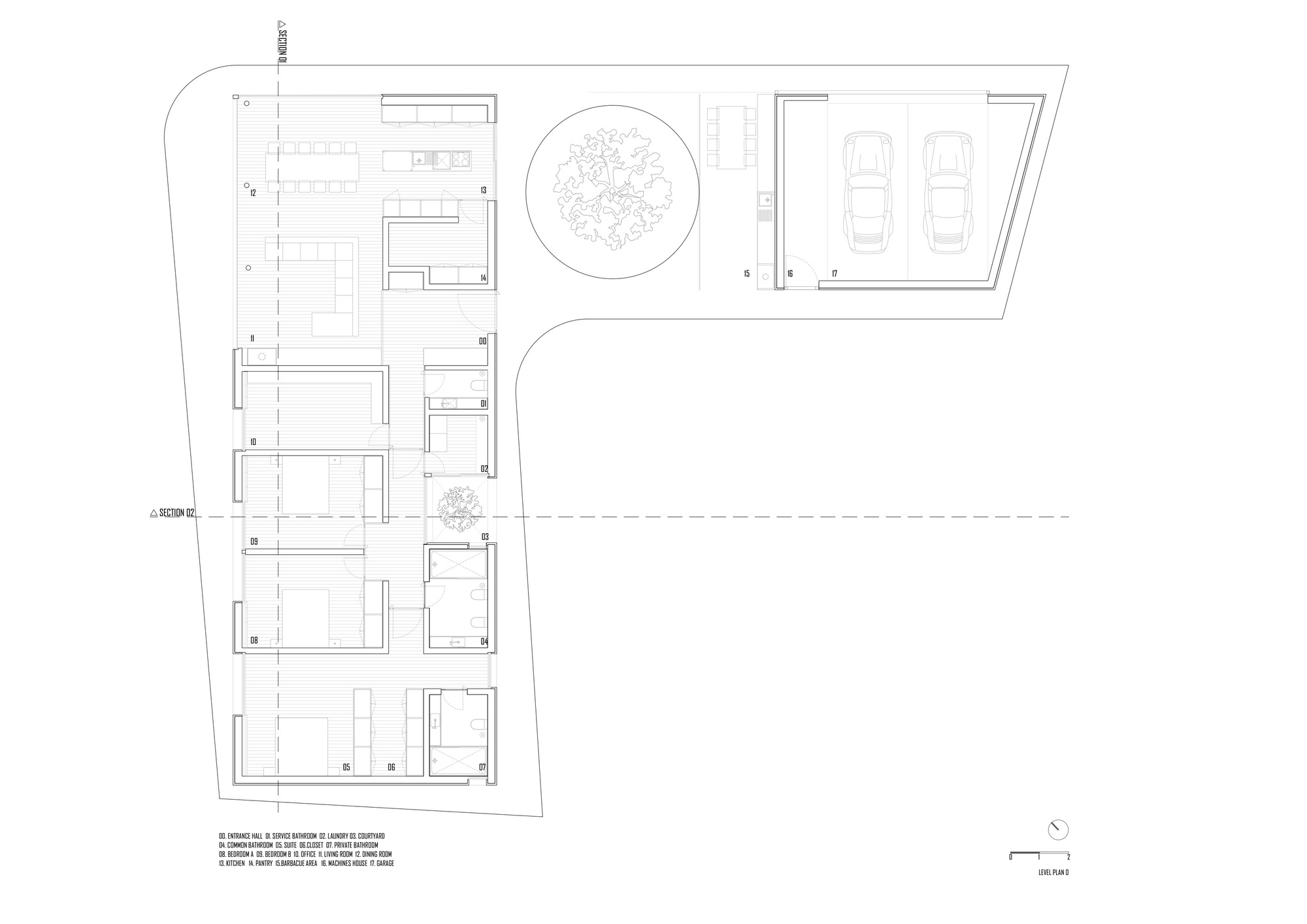 파티오를 사이에 두고, 거실, 침실, 서재 등 주거 영역과 바비큐, 차고 등 부속 영역으로 구분된, ㄱ-자형 평면으로 계획되었다. 매개, 전이, 완충 공간인 파티오는, 설계팀이 발견한 타작마당과 유사하게 배치되었다. 인접 도로에서 프라이버시를 제공할 뿐만 아니라 주변 경관을 충분히 즐길 수 있게 계획된 집이기도 하다.