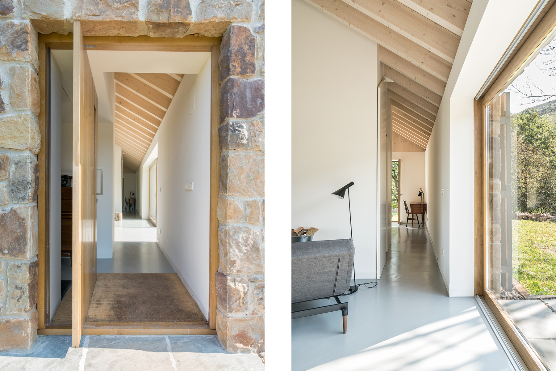 거친 석재를 사용한 외부와 달리 내부는 매끄러운 재료로 인테리어 되었다. 거친 것과 매끄러운 것, 열린 구조와 닫힌 구조, 목재 천장과 회색 바닥, 내부와 외부, 전통과 현대 등 절묘한 대조를 이루는 요소들이 많은 건물이다. 온기가 느껴지는 목재와 흰색 벽을 배경으로, 클래식한 의자와 현대적인 미니멀 요소들이 결합되어, 천혜의 자연환경을 즐길 수 있는 매우 차분한 공간으로 연출되었다.