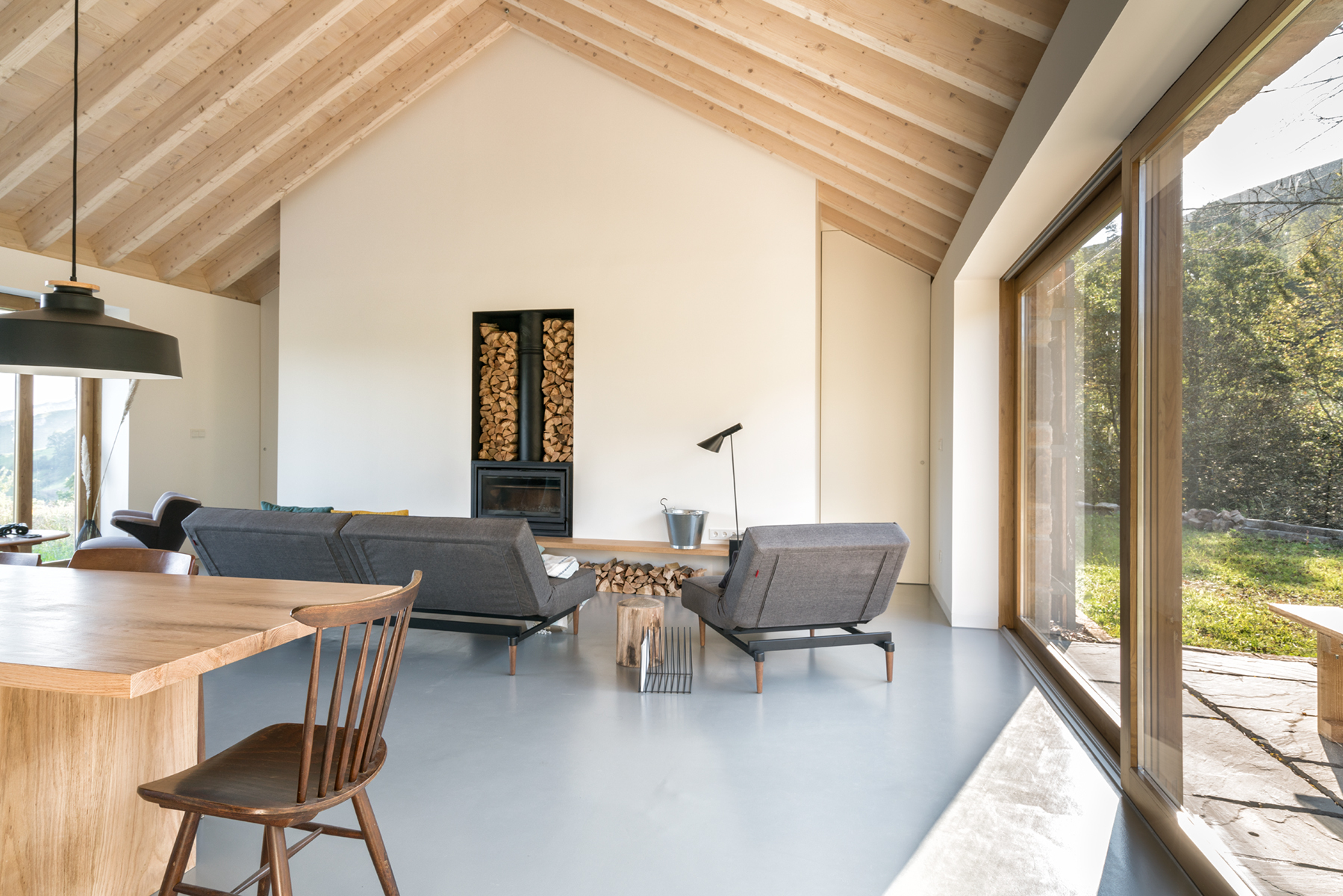 구조는 매우 단순하다. 거실 양쪽으로 난 두 군데의 대형 파노라마 창을 통해, 산, 구름, 그리고 나무 등 주변의 아름다운 풍경이 한눈에 들어온다. 가장 안쪽 거실 바로 옆에는 전용 욕실 딸린 두 개의 침실이 동쪽 숲을 향해 배치되었다. 아침이면 해가 드는 두 침실의 전용 욕실 위에는 높은 천장고를 이용하여 중이층 구조로 다락을 설치하여, 잠자리가 부족할 경우 침실로 사용할 수 있게 했다.