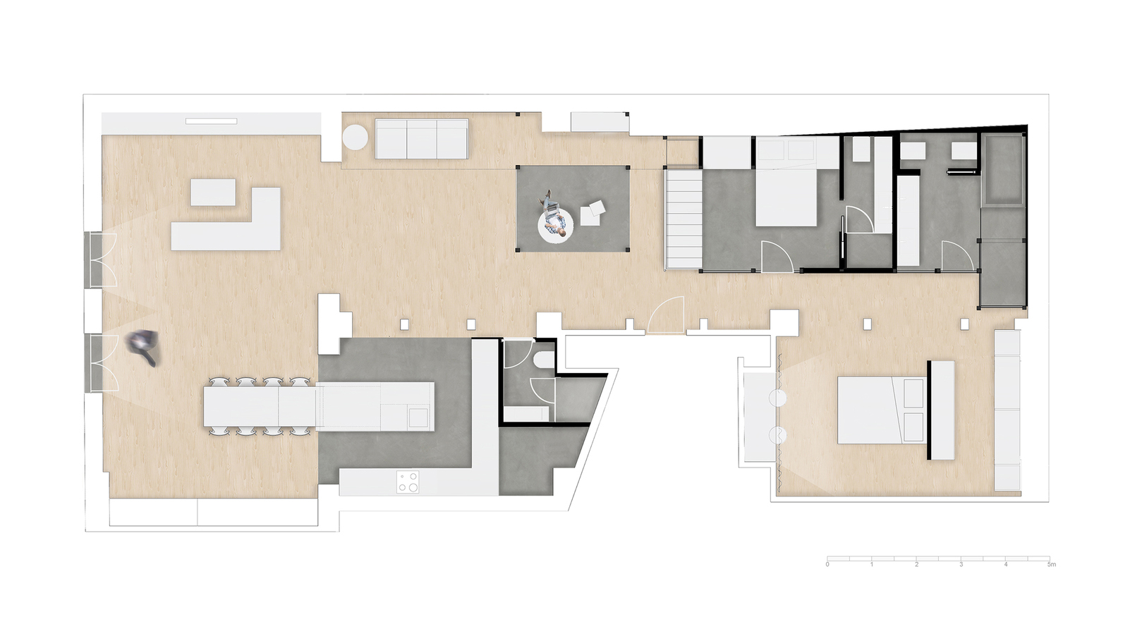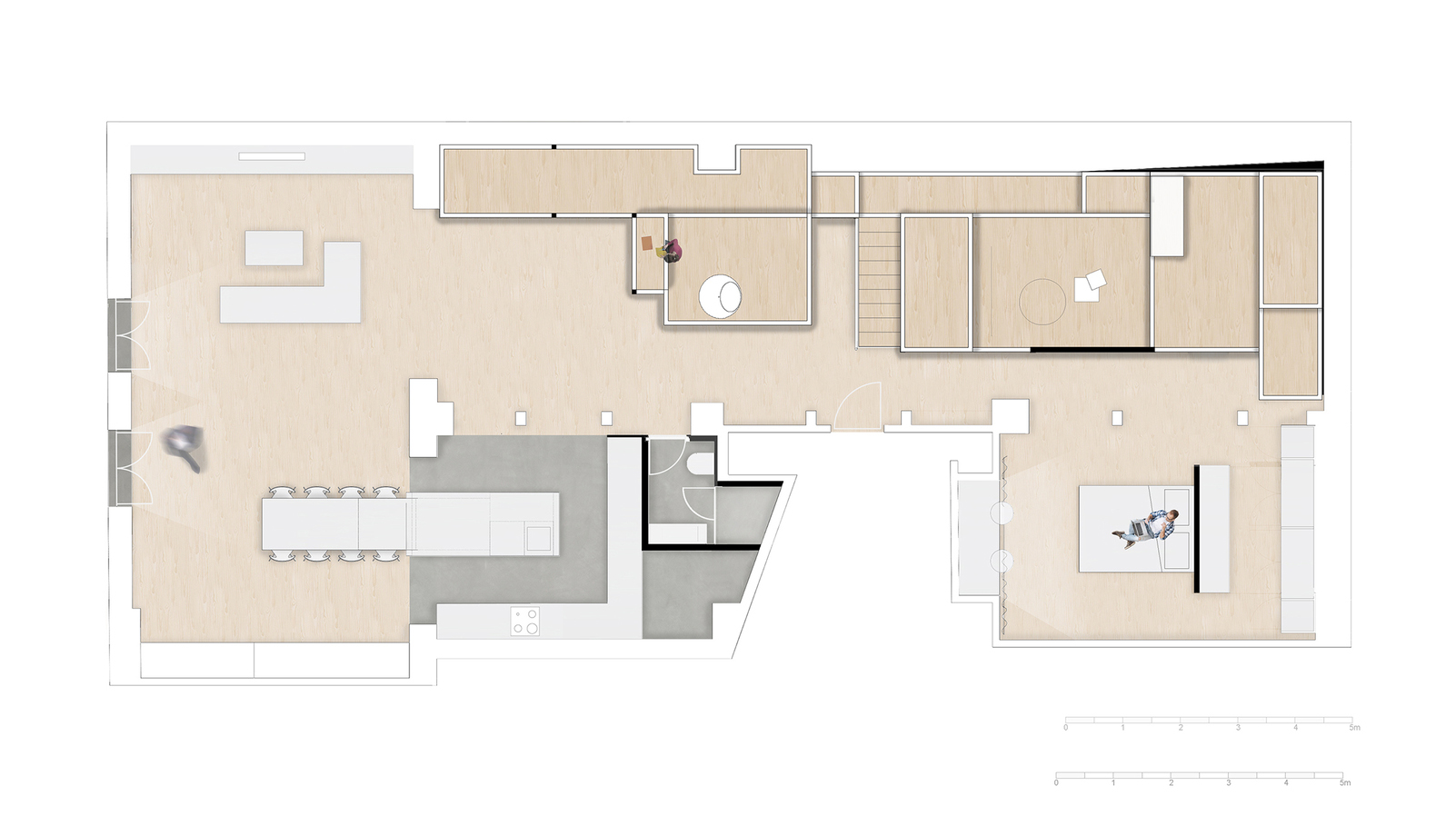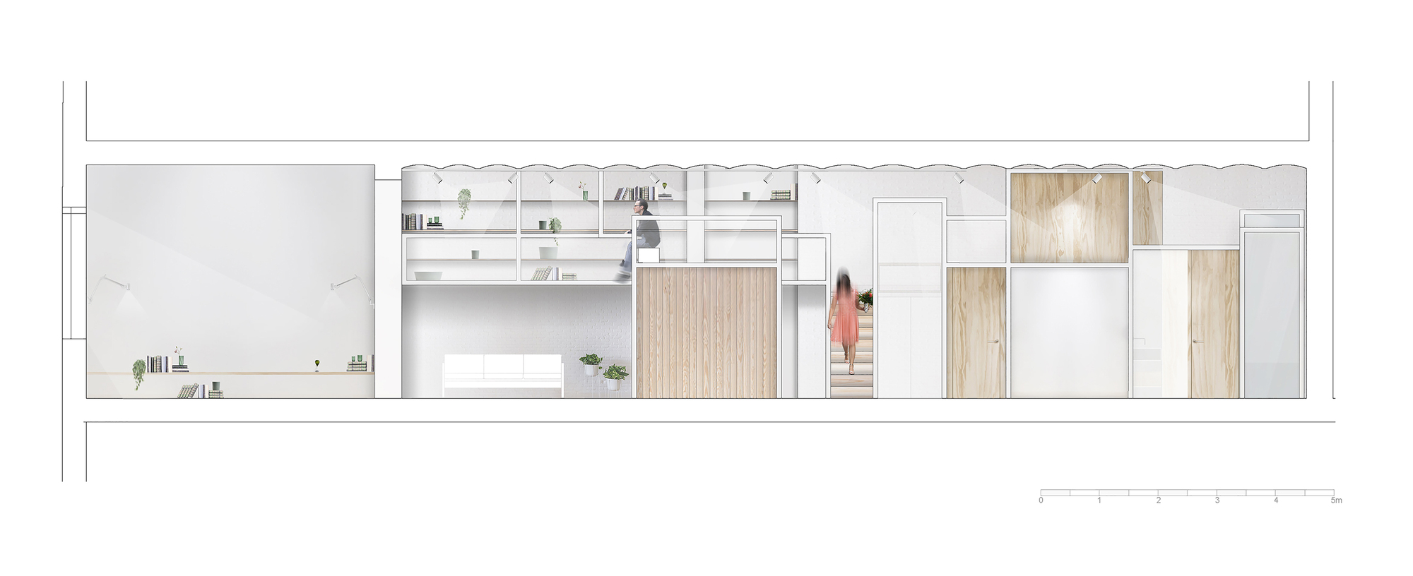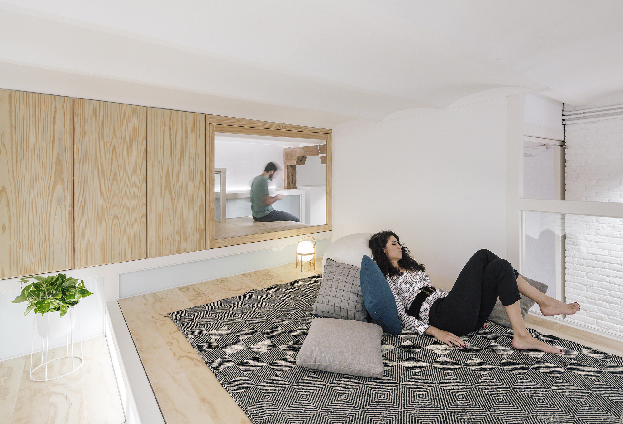 천장 아래에는, 침실 하나, 책장 딸린 스튜디오/갤러리 등이 마련되었다. 메인 침실은 가장 큰 욕실과 연결되어 있는데, 둘 사이에 복도를 두고 칸막이벽을 설치하면 따로 쓸 수도 있게 계획되었다. 그리고 주방 옆에 오피스 공간과 공용 욕실이 있다.