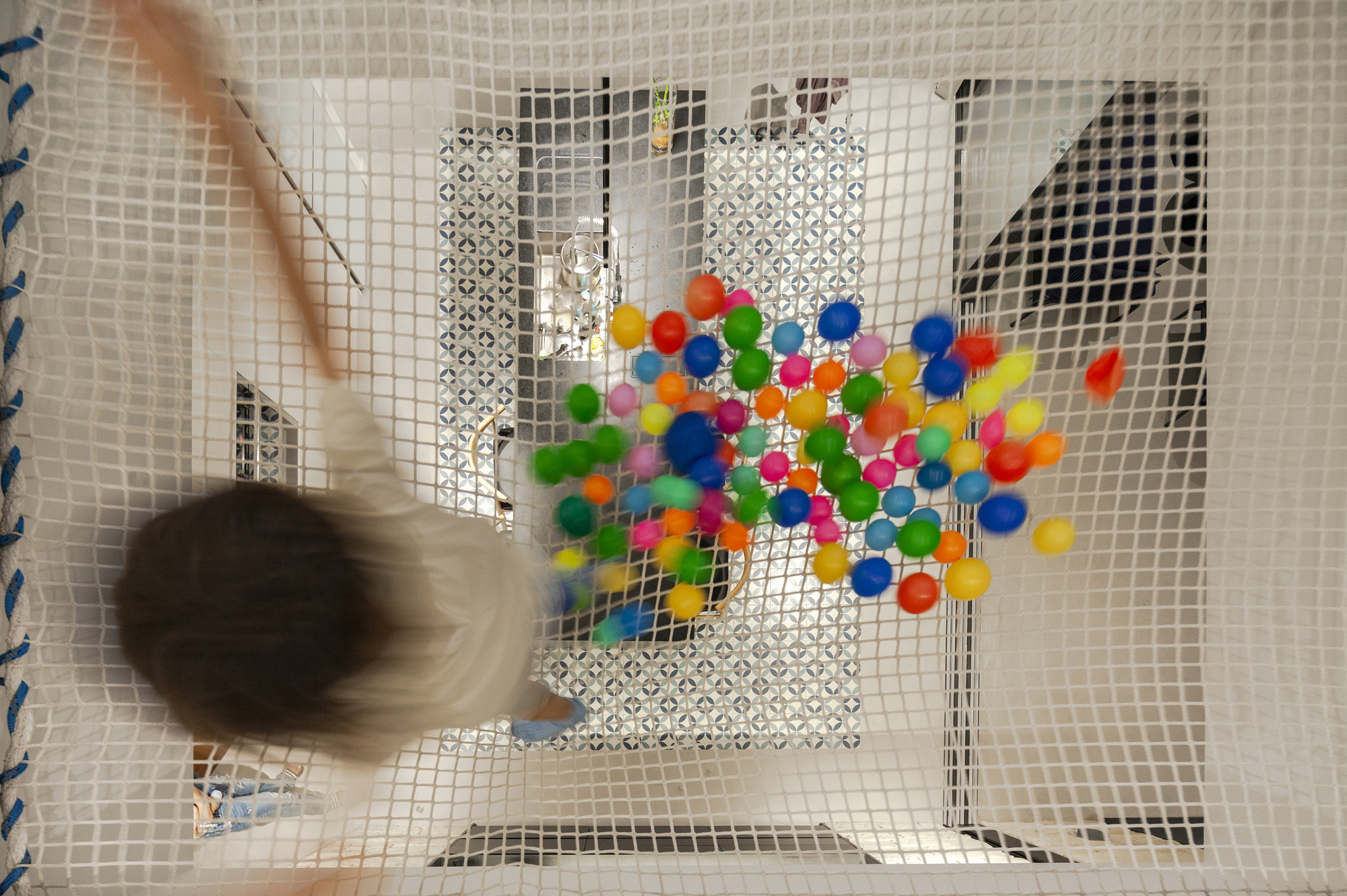 2층 놀이 공간과 1층 주방 사이를 연결하는 것이 필수 조건이 되었다. 그래서 주방 천장이자 놀이 공간 바닥의 일부를 텄다. 여기에 그물을 설치하여, 가족이 일상적으로 사용하는 두 공간 사이를 유쾌한 분위기로 연출했다.