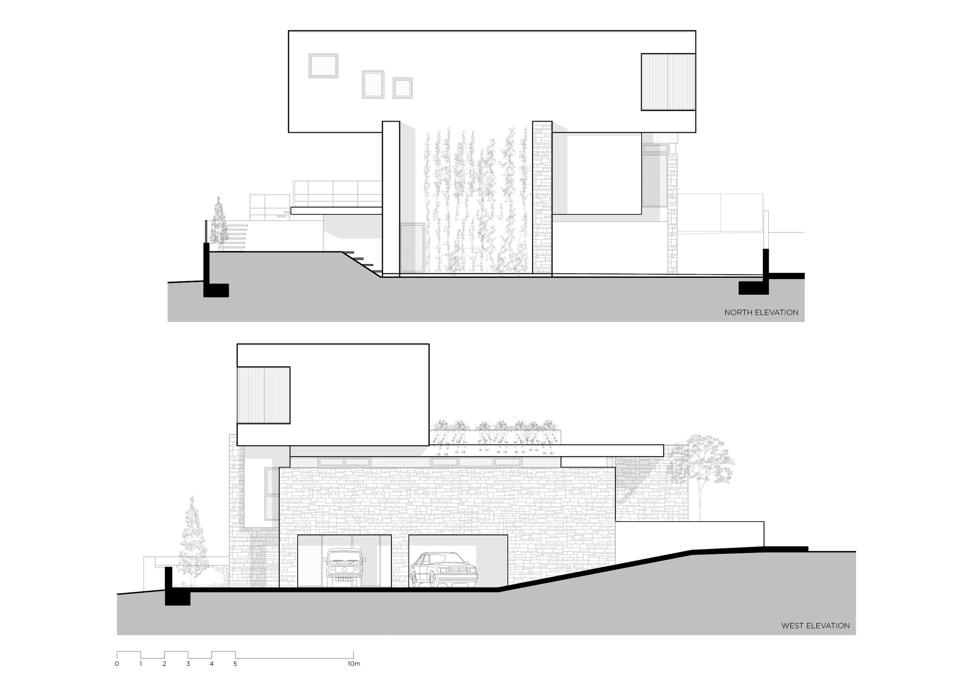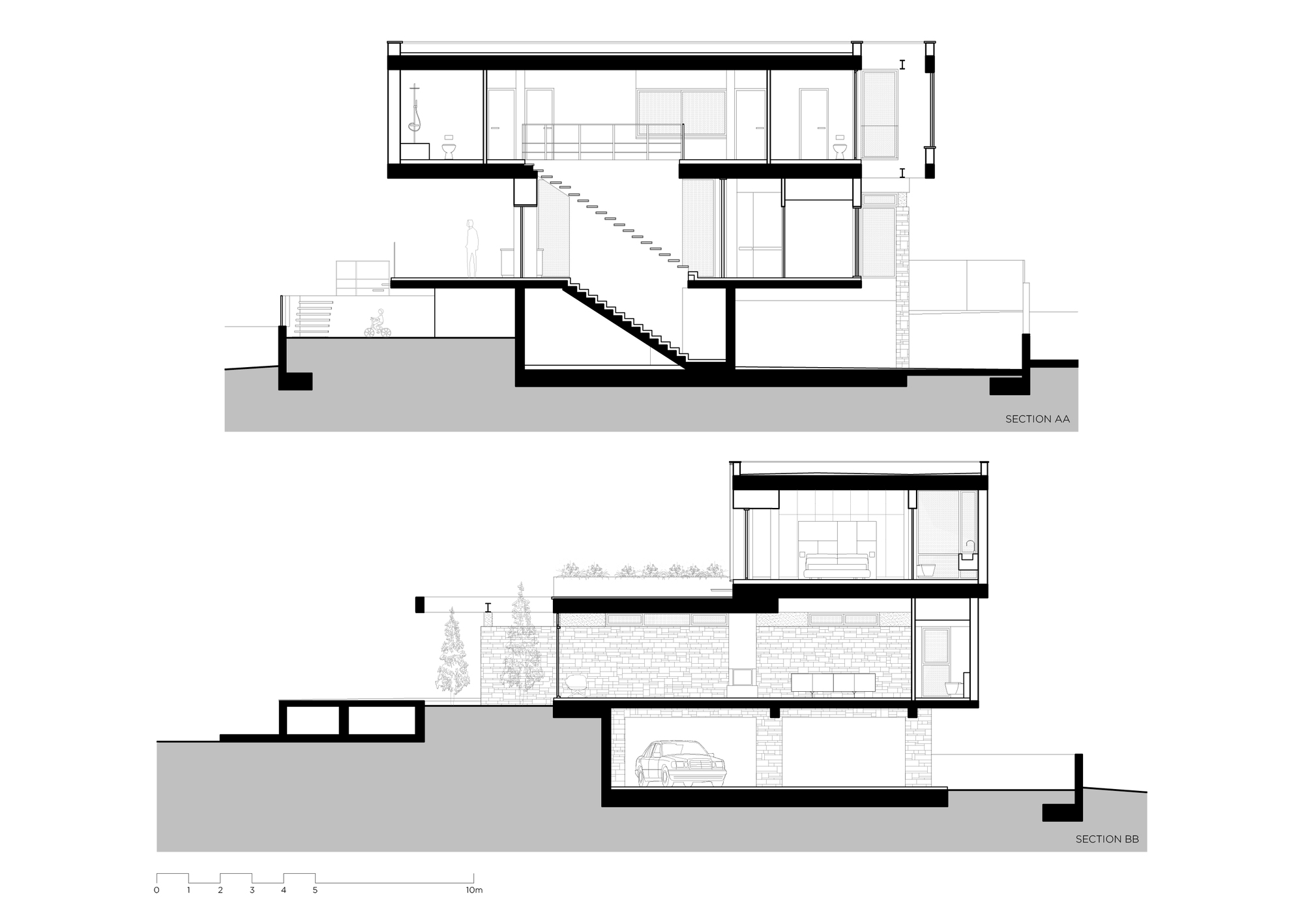 1층을, 캔틸레버 구조의 2층을 지지하는 기초 역할을 하도록 만들고자 했다. 이는, 주방 수납장 등을 포함하는 석재 마감의 두꺼운 벽체들을 통해 해결했다. 그중 가운데 석벽을 추가로 3미터 연장하여, 거실의 프라이버시를 확보하는 동시에 서풍으로부터 안마당이 보호되도록 했다.