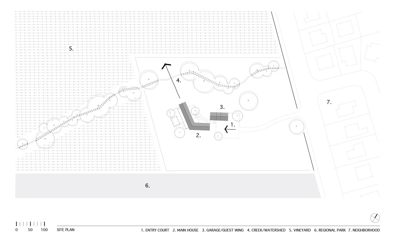 경사진 지형을 활용하고 비교적 특색이 없는 대지를 의미 있는 ‘장소’로 만들기 위해, 중앙 정원 공간이 형성되도록 두 개의 날개 모양으로 본채의 평면을 계획한 주택이다.