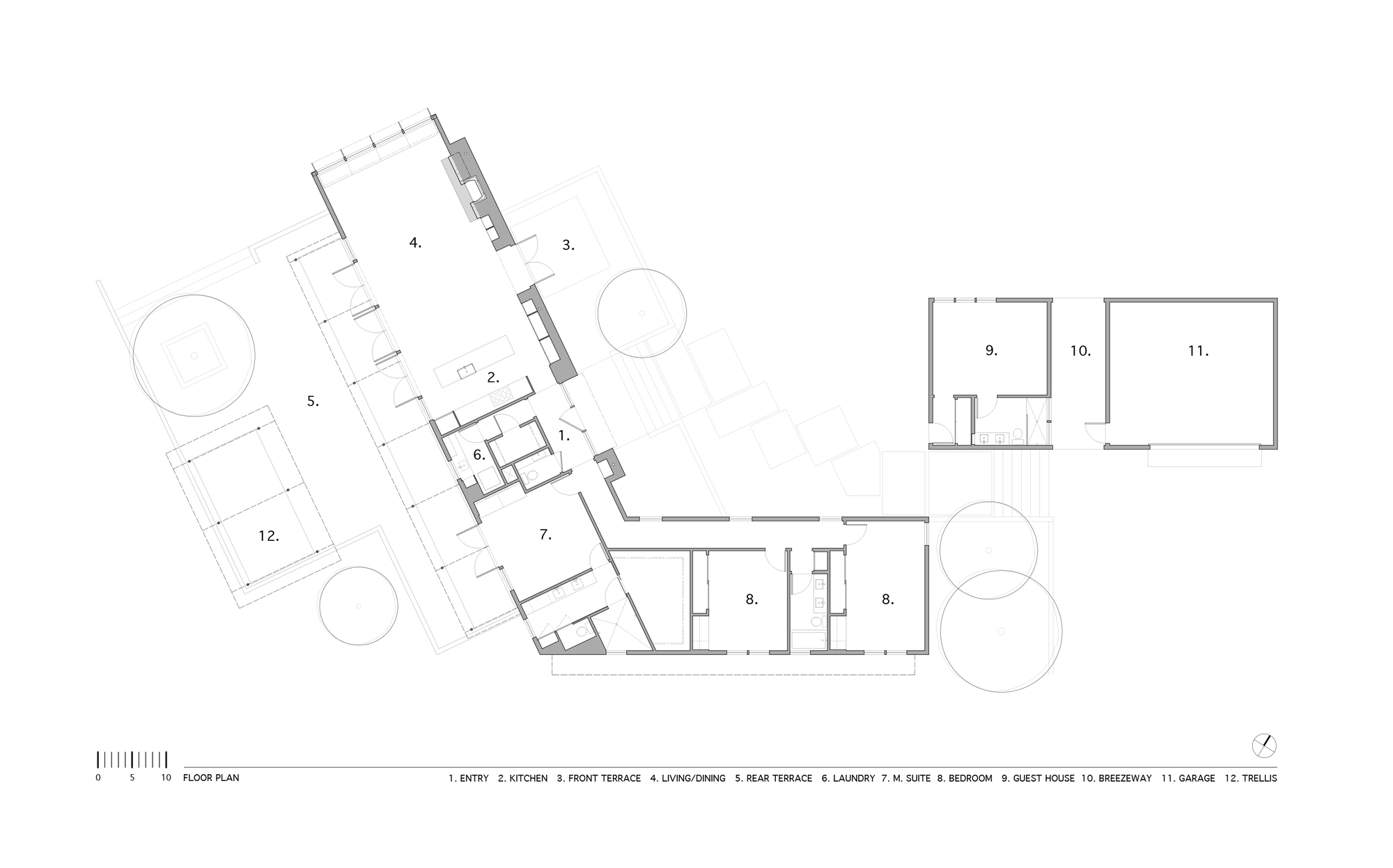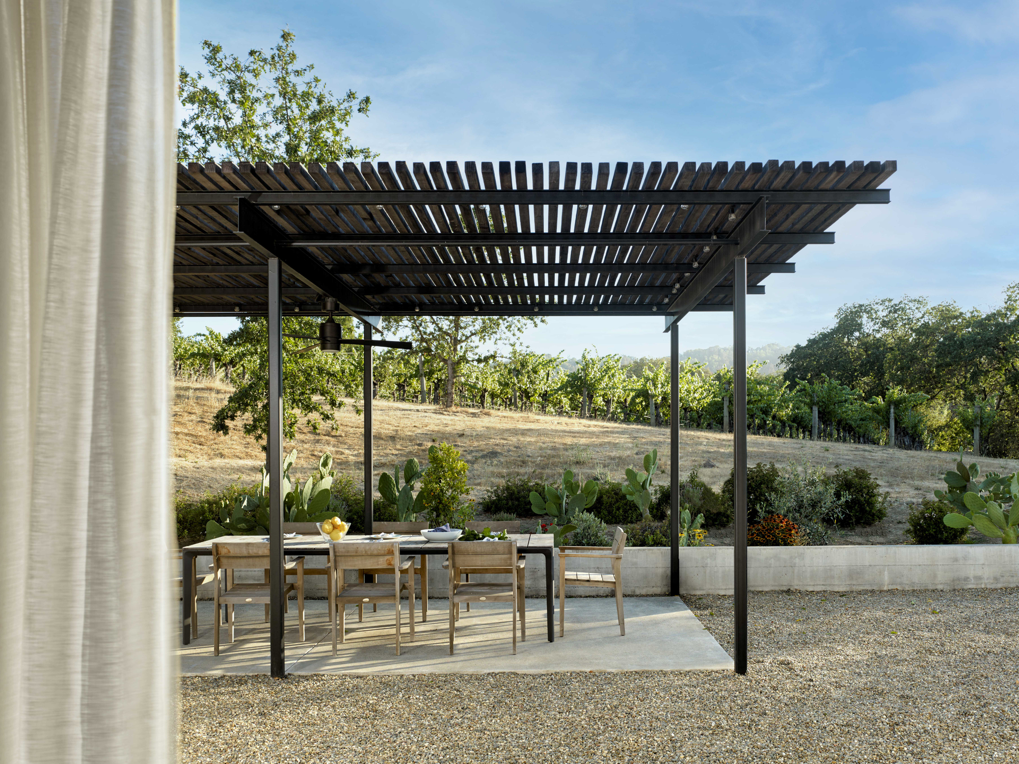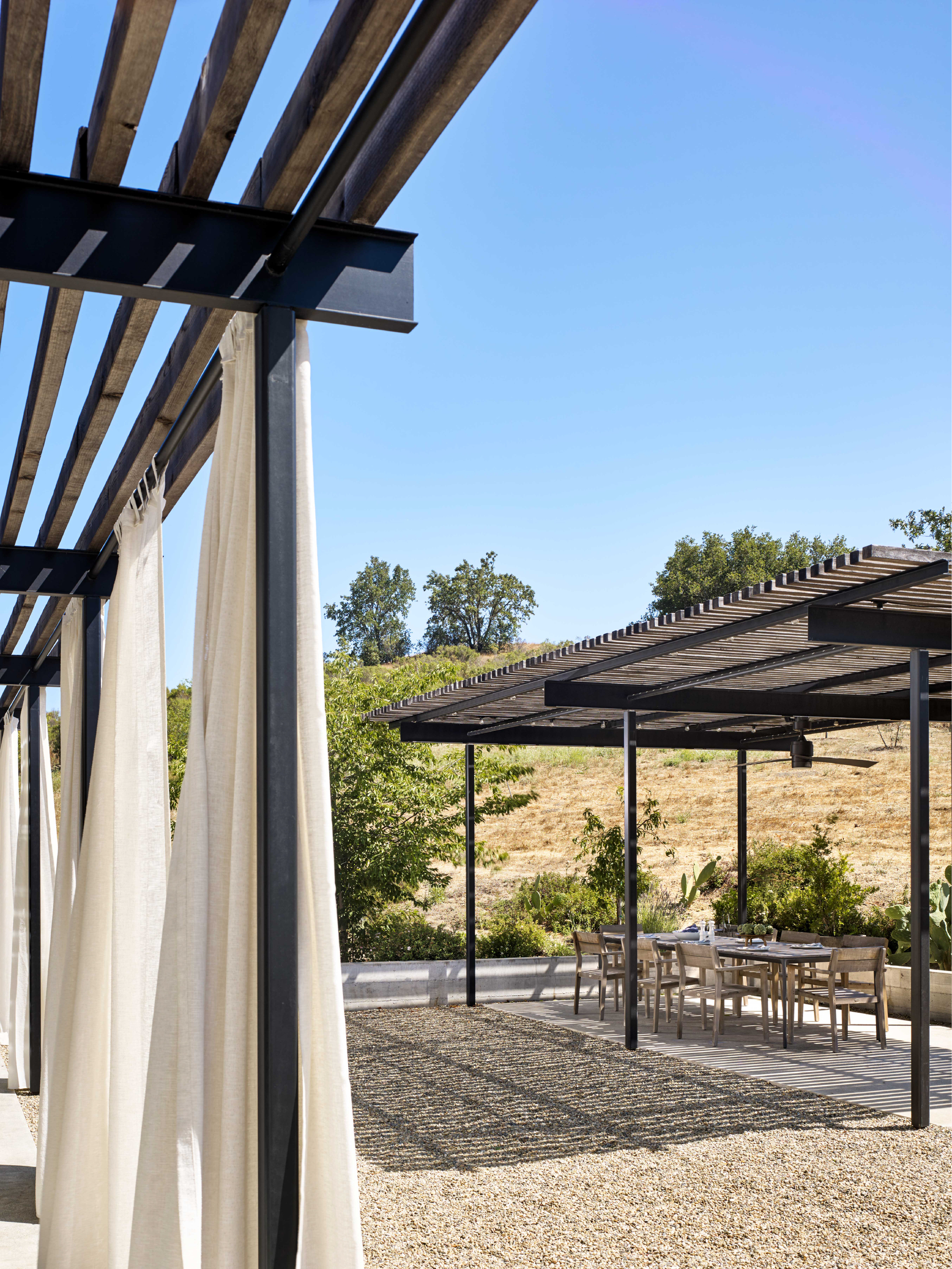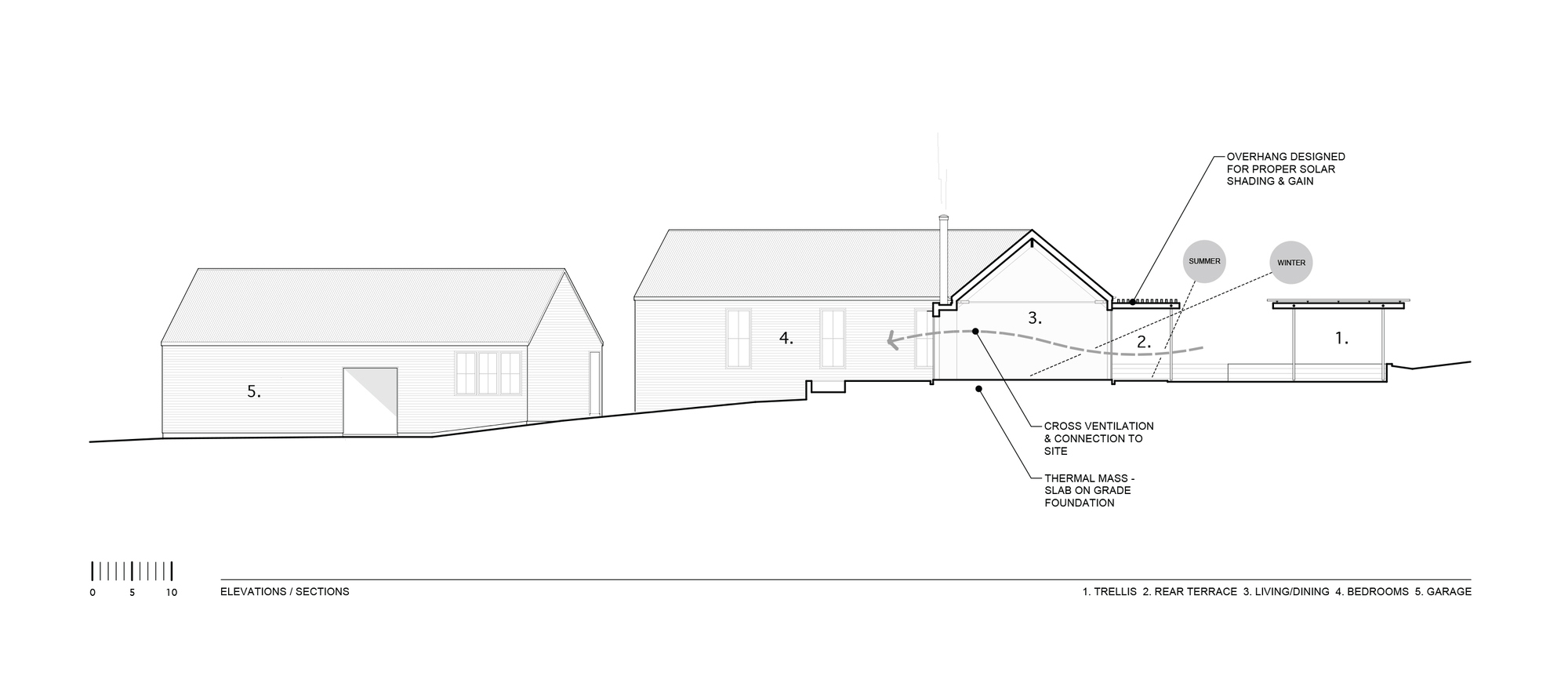 여기에, 뜨거운 고고도 여름 태양으로부터 집을 보호하고 저고도의 겨울 햇볕은 생활공간 깊숙이 유입되도록, 퍼걸러와 아케이드가 설치되었다.