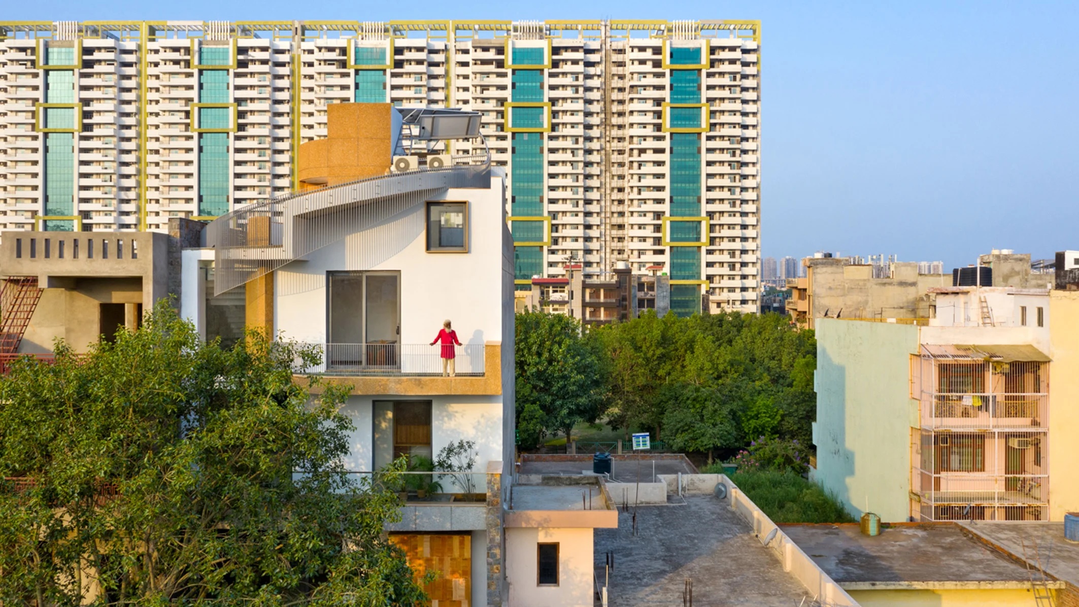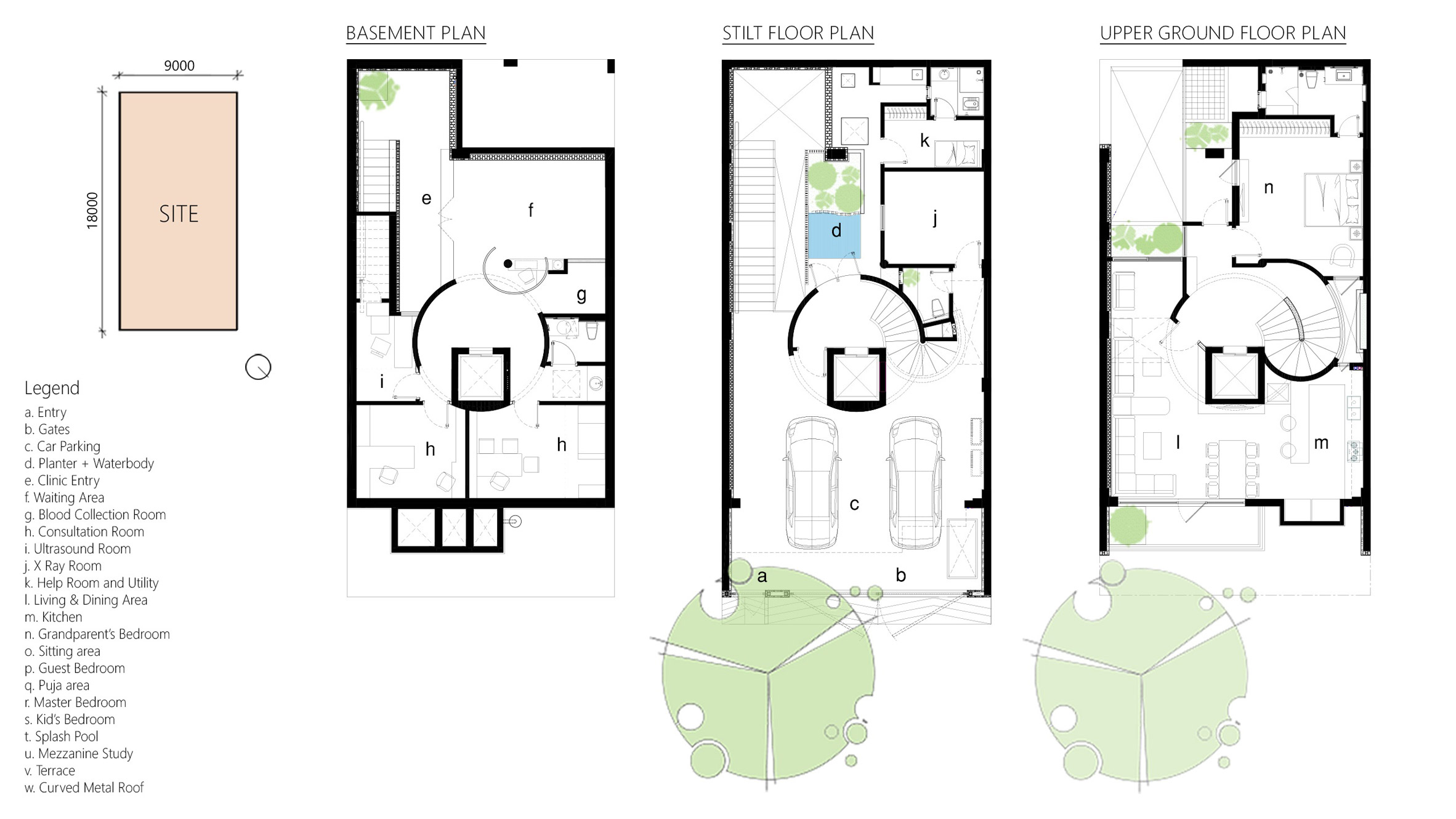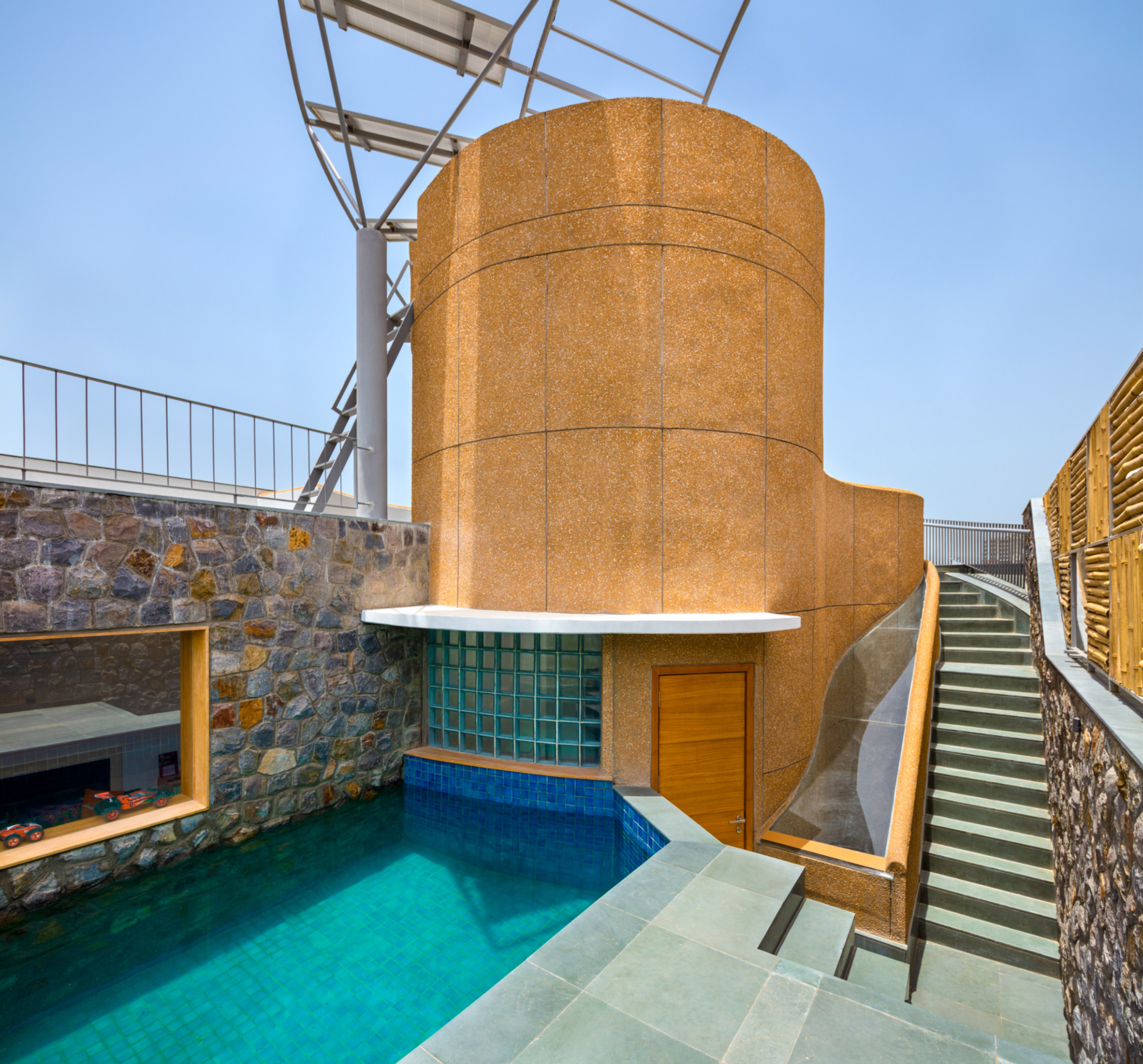 빗물 집수·저장 시설과 옥상 수영장을 갖춘 인도 노이다Noida의 상가 주택이다. 의료 사업가의 이 집의 지하와 1층에는 클리닉 공간이 들어 있다. 지하 1층, 지상 5층 규모의 건물 전체 층을 연결하는 엘리베이터와 나선형 계단이 포함된, 원형 코어를 중심으로 공간들이 배치되었다.
