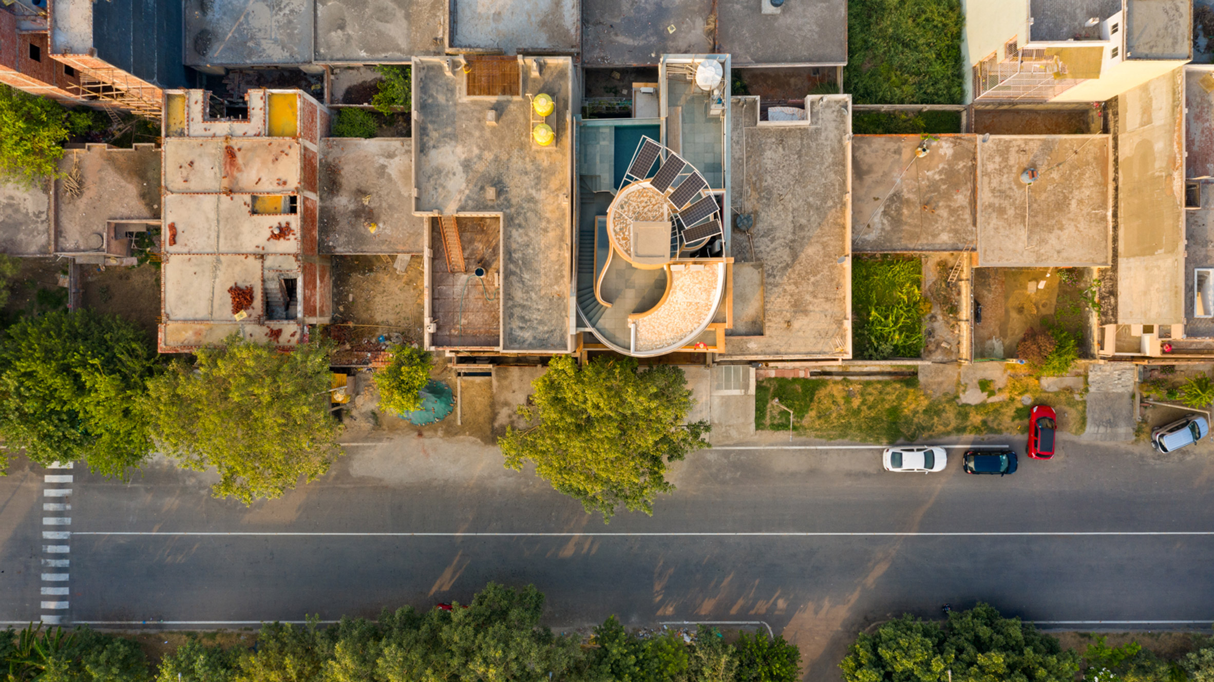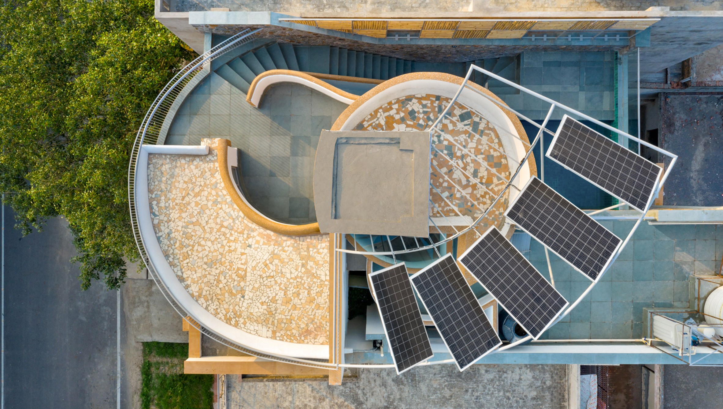 이 집은, 일 년 내내 햇빛 노출을 제어하고 빗물을 집수하여 활용하도록 세심하게 설계되었다. 수영장과 화단을 포함한 발코니와 함께 옥상의 곡선 램프에 의해 빗물이 집수된다. 그리고 나선형으로 설치된 5개의 태양광 패널이 스카이라인을 형성한다.
