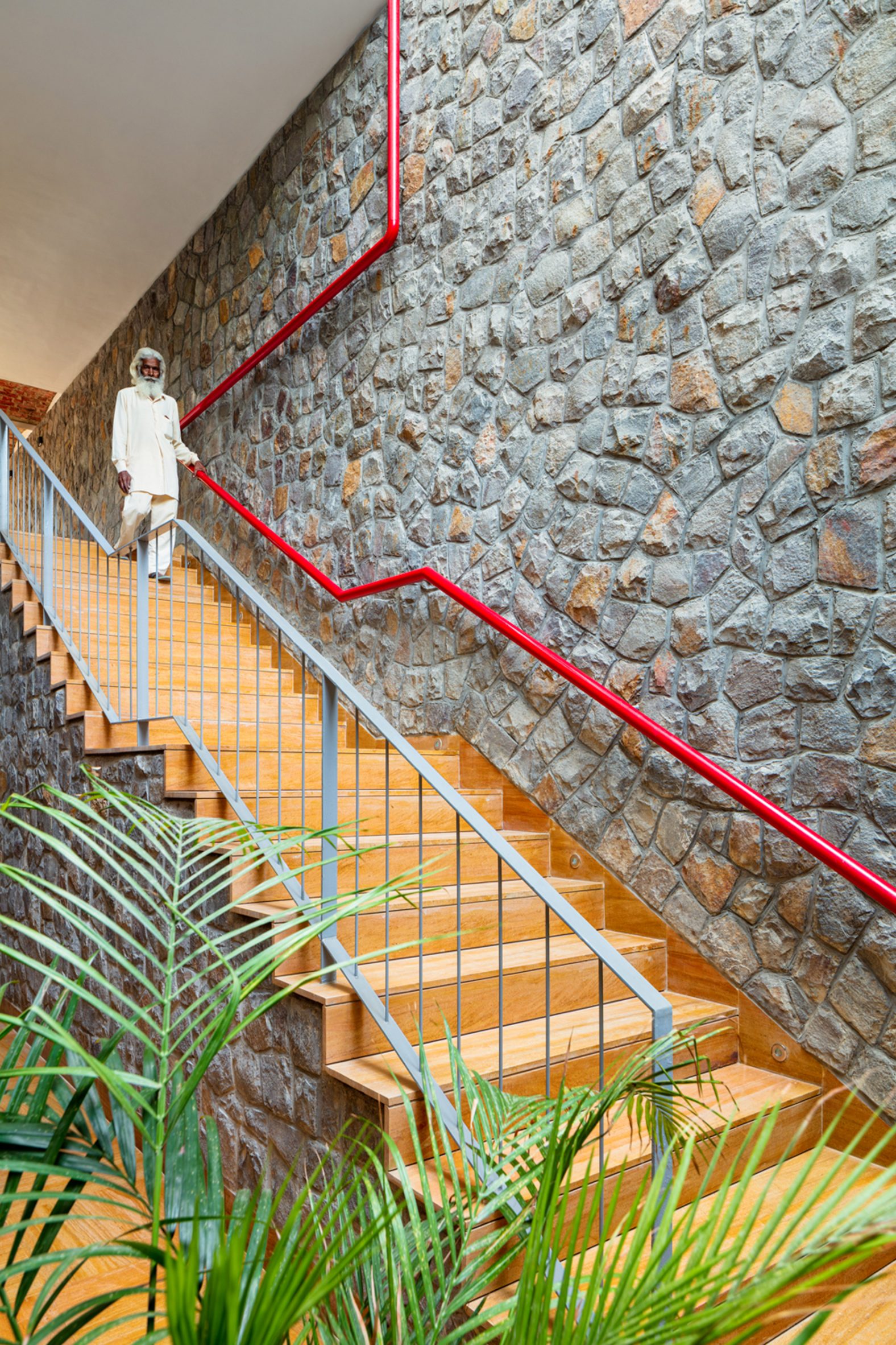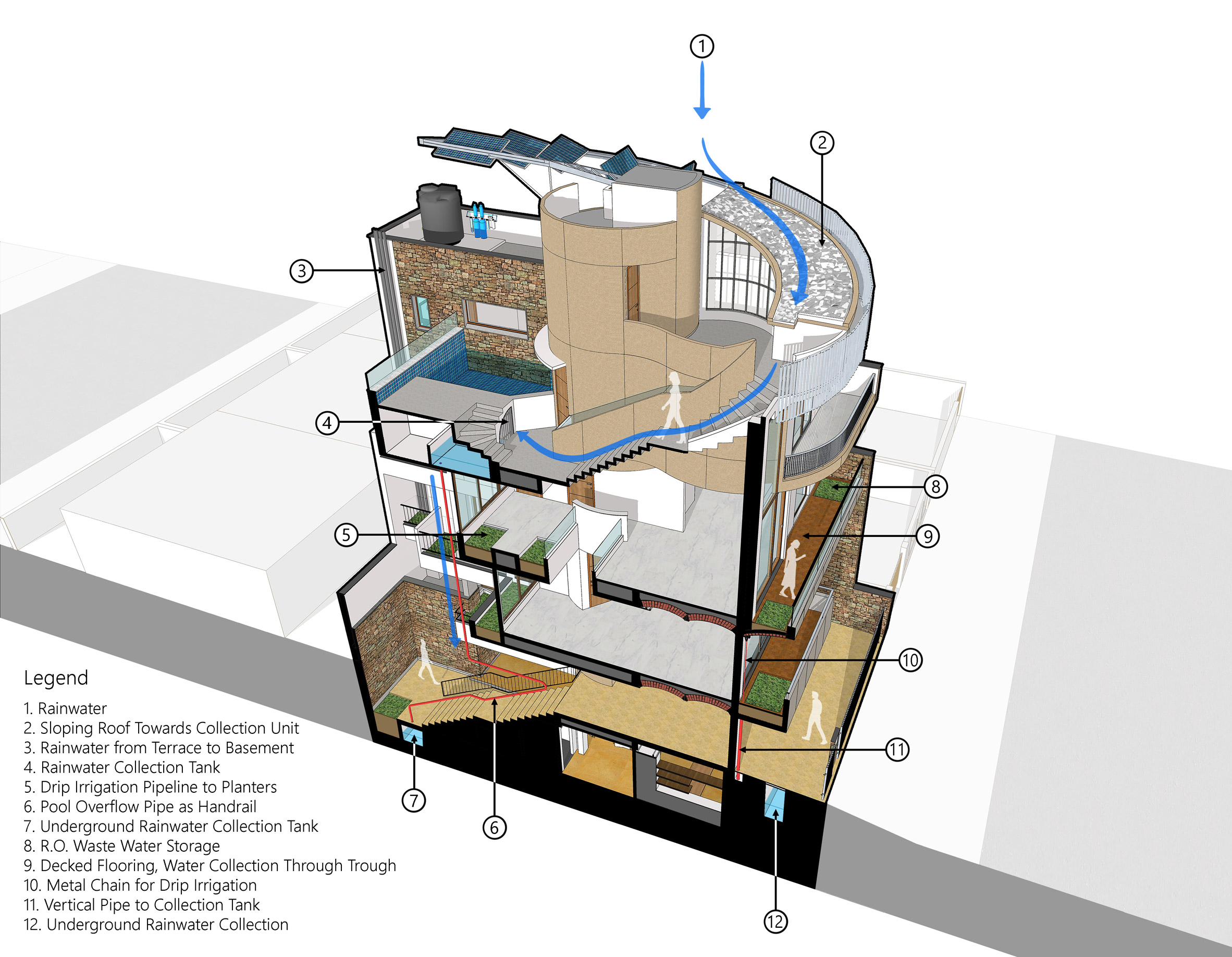 “이 건물은, 에너지를 생산하고, 오랜 전통을 가진 집수 기술을 통해 물을 생활용수로 재활용하며, 식재된 지역에 물을 대어 생물을 양육합니다.” 설계를 한 Archiopteryx 측의 설명이다. “인도 라자스탄주 아 메르에 위치한 요새인 Amber Fort의 집수 시스템에서 영감을 가져와서 빗물 유출을 채널화 했습니다.”