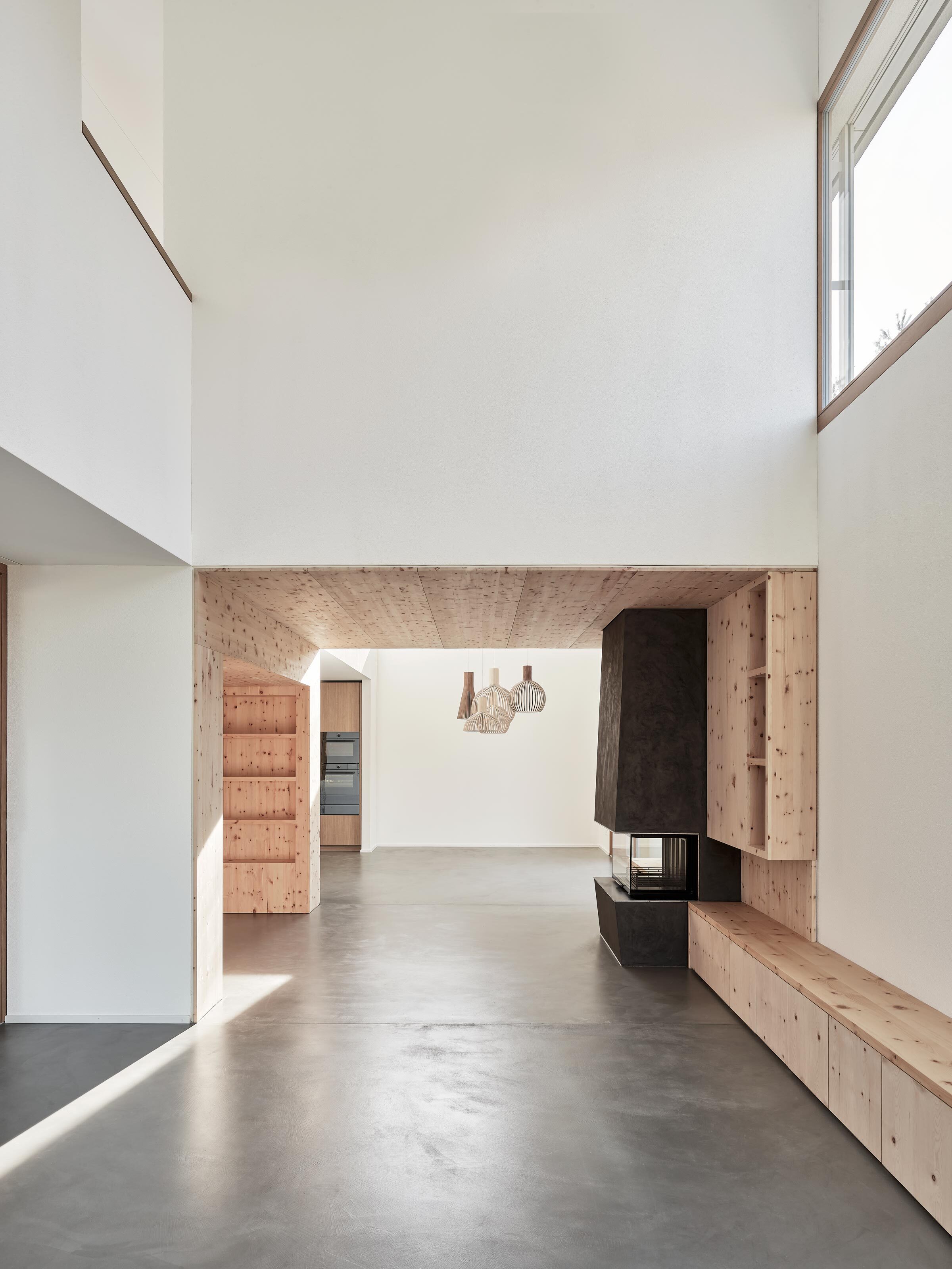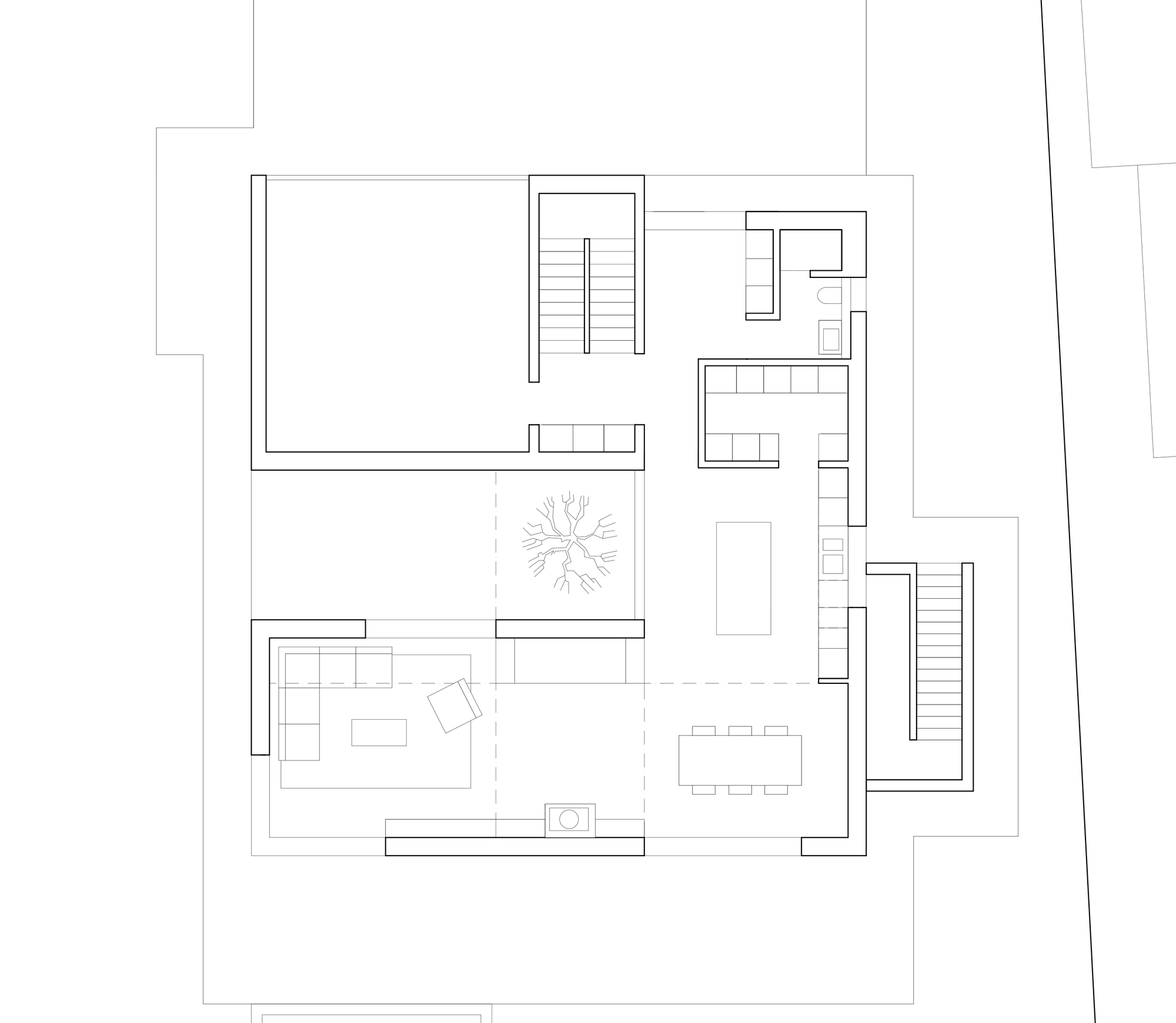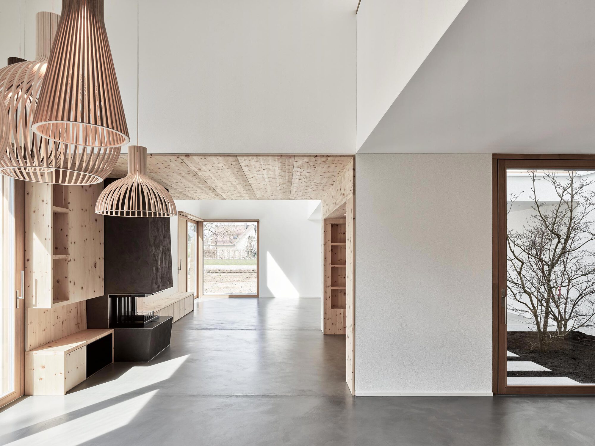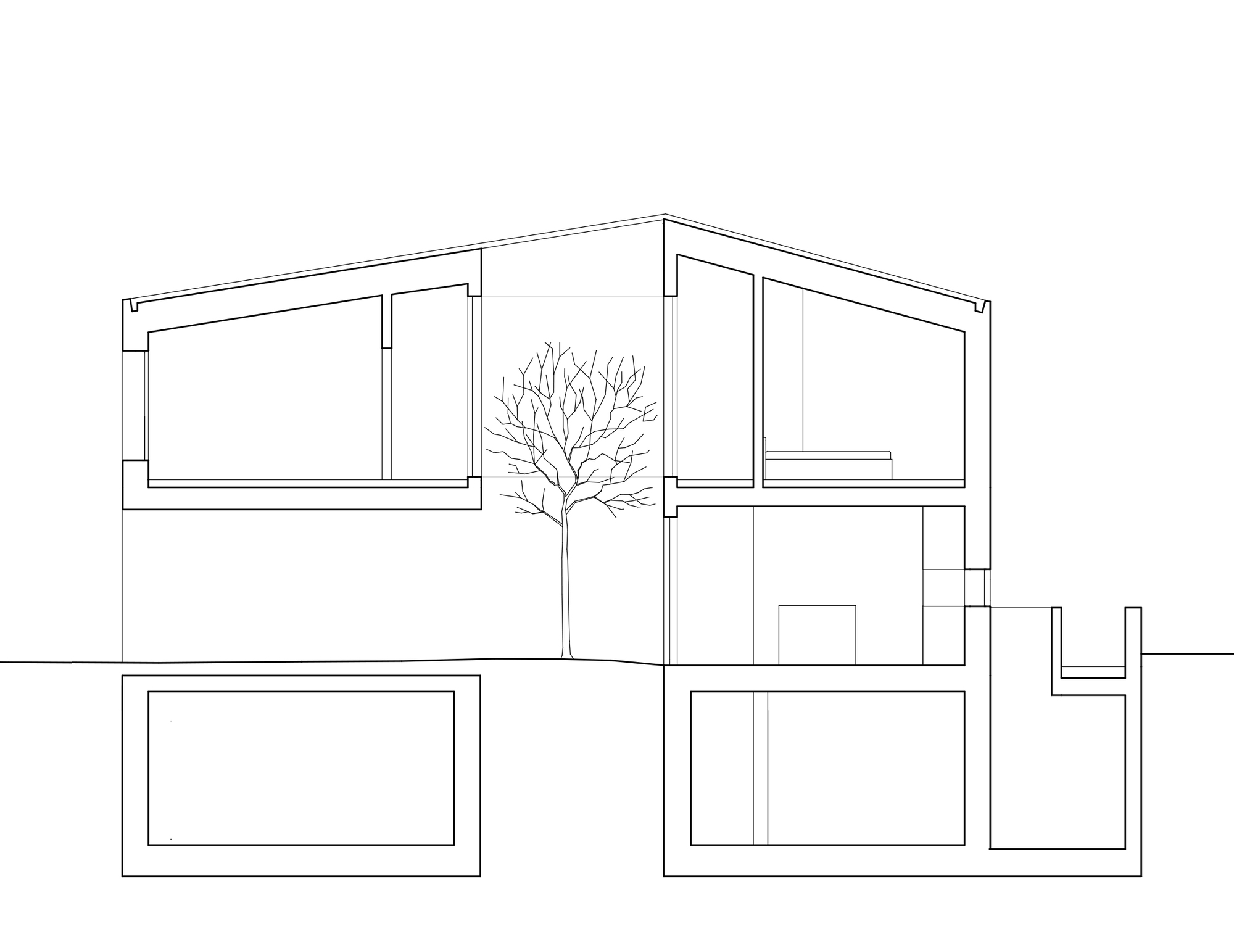 가정생활에 초점을 맞춘 내향성 구조의 건물 중심에 조경된 안뜰이 위치한다. 이 중정은, 명확한 공간적 위계를 형성하는 동시에, 풍경과 건축이 결합된 하늘과 땅의 단면을 프레임화한다. 그리고 안뜰과 두 군데의 보이드로 집 내부를 리드미컬하게 분할하여, 다양한 시각적 관계를 형성했다.