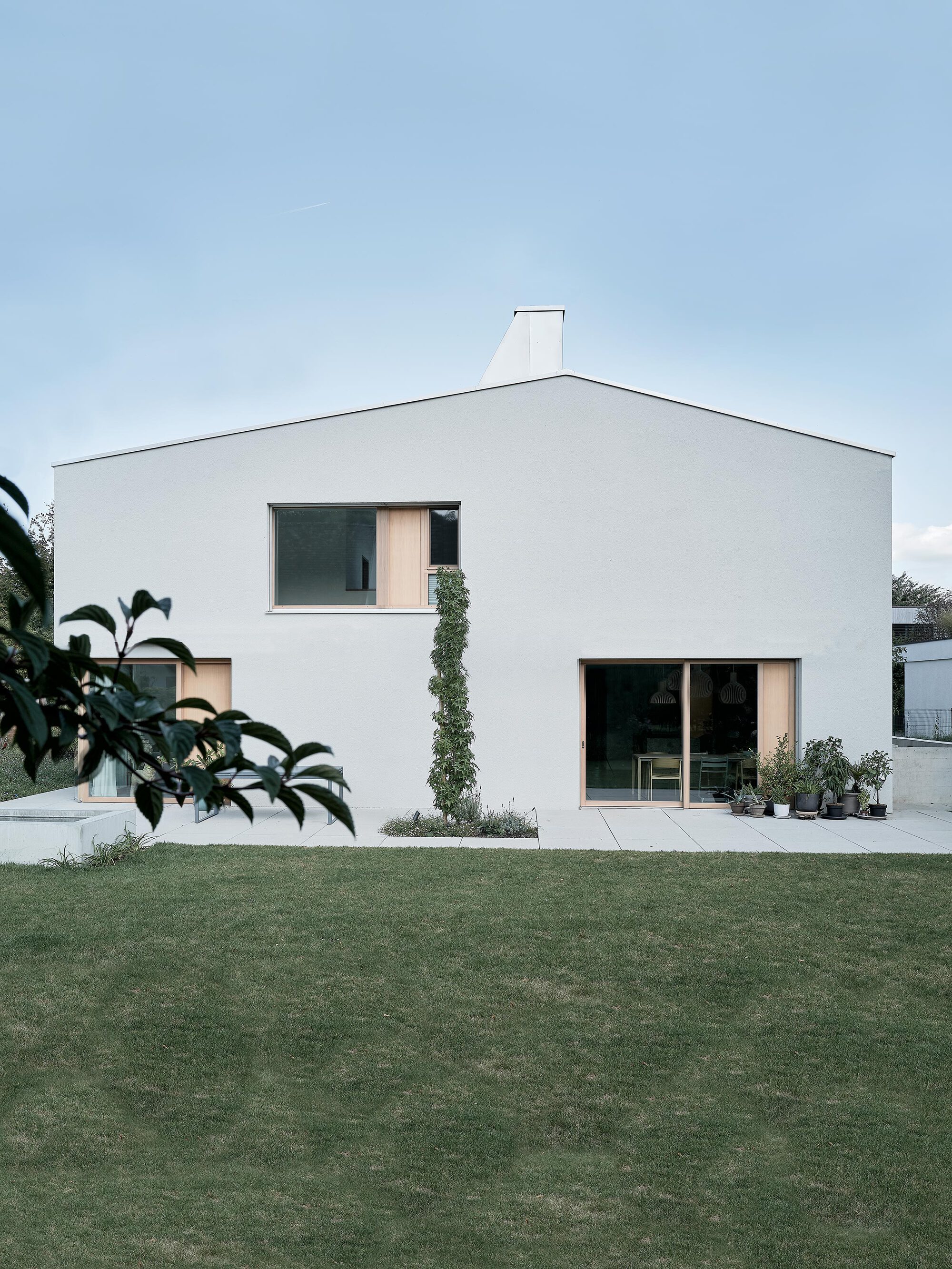 창문 하나 없이 꽉 막힌 것처럼 보이는 비대칭 박공지붕을 특징으로 한 전면 파사드를 가진 주택이다. 안으로 들어가면 전면 파사드와 대비되는 집의 구조가 드러난다.