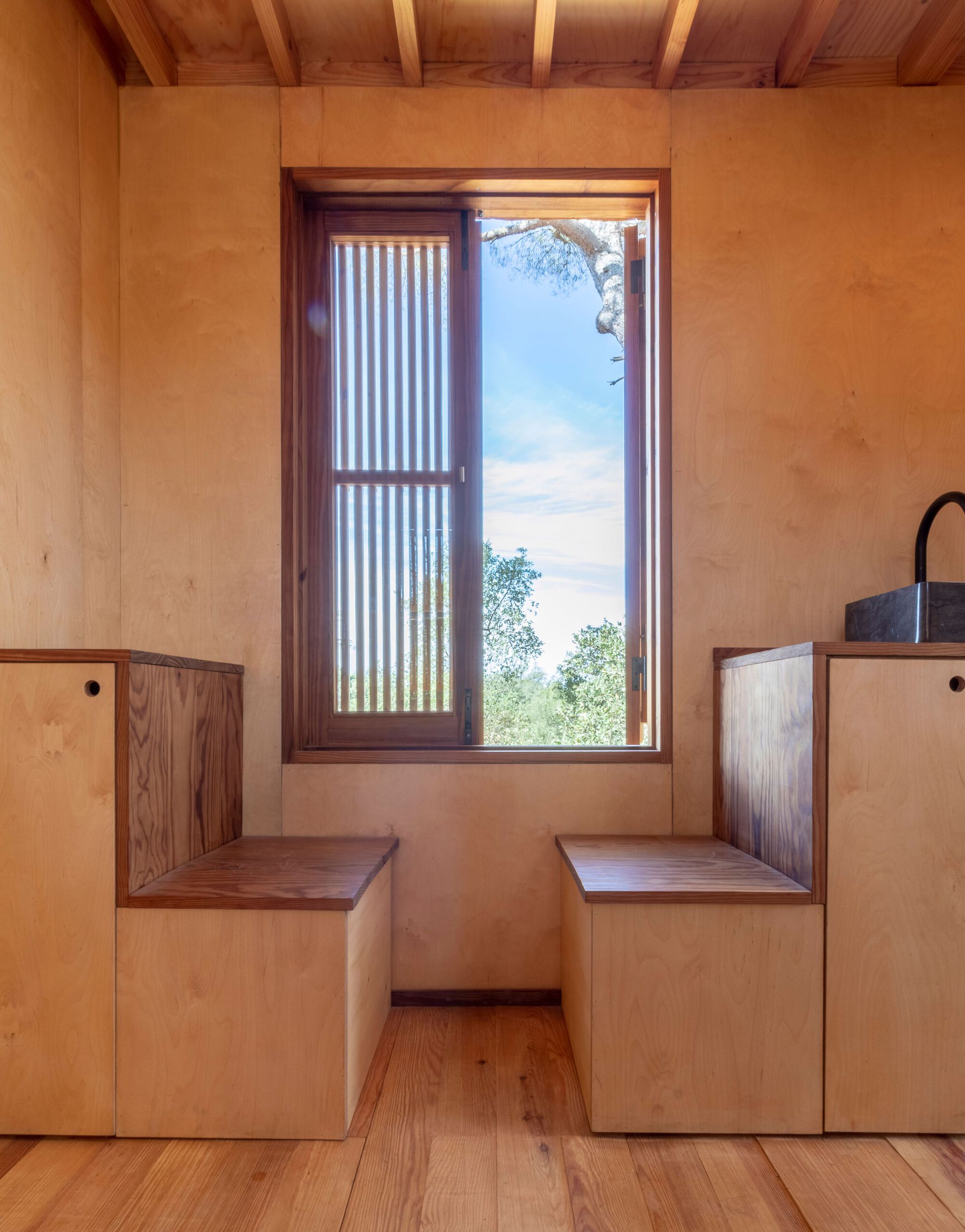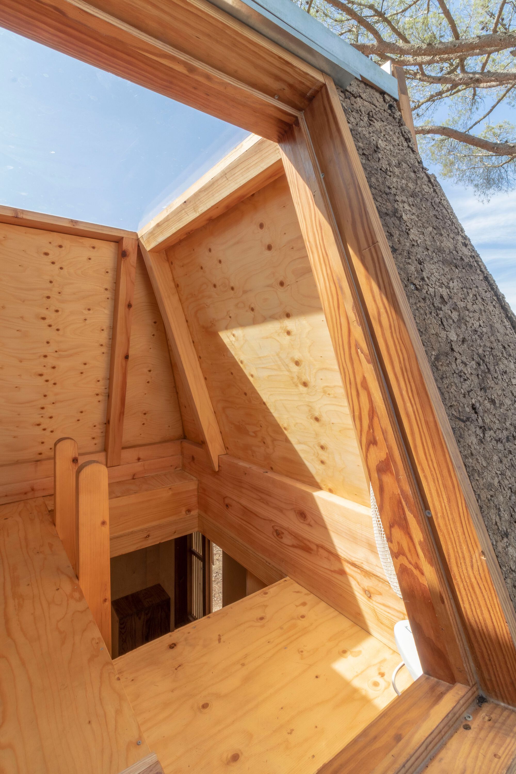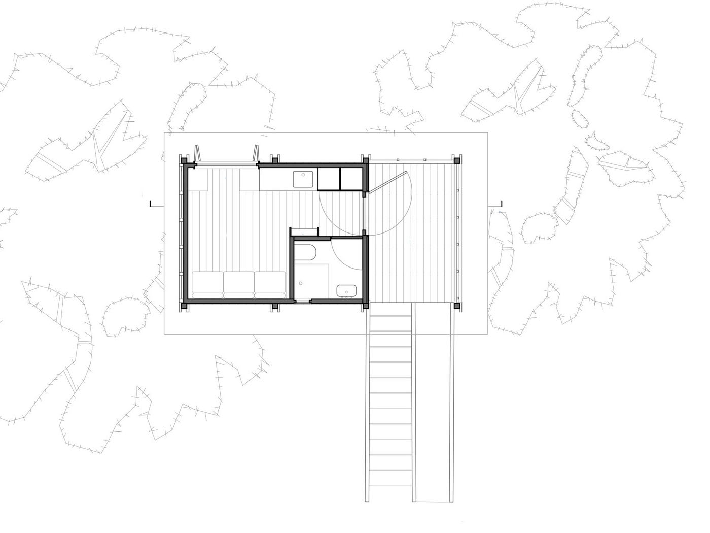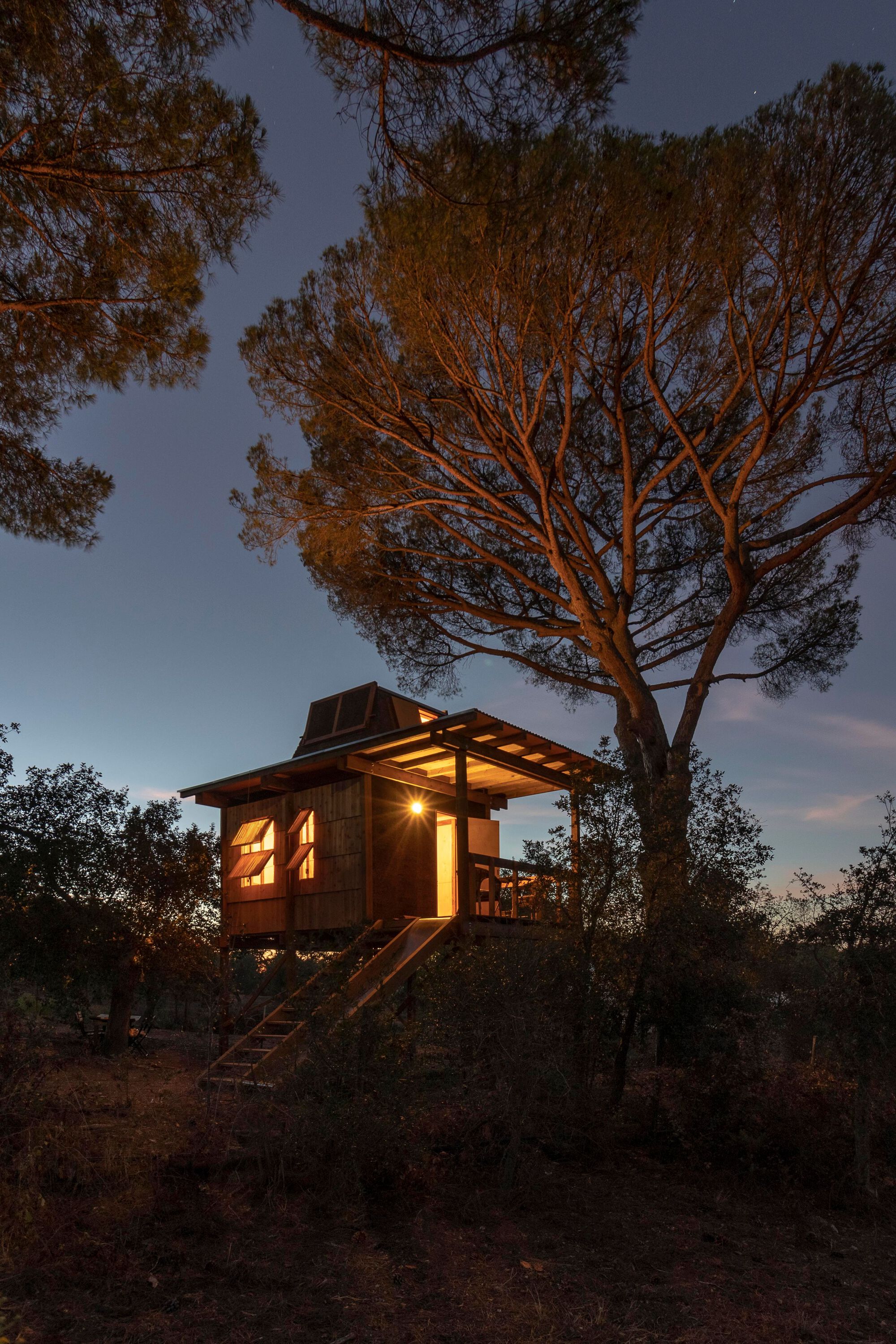 뒷마당에 있는 두 그루의 100년 된 소나무 사이에 지은 트리 하우스이다. 나무의 강한 존재감을 고려하여 물리적으로 접하지 않게 지었다. 주인공인 나무의 존재감을 해치지 않는 수준에서 극적 효과를 보완하는 행인 개념으로 위치시키기 위해 별도의 기둥 위에 지었다고 한다. 2.5m 높이로 올려서 지음으로써, 1층(소나무 기둥 사이의 공간)을 다양한 용도로 사용할 수 있는 지붕 있는 외부 공간으로 만들었다.