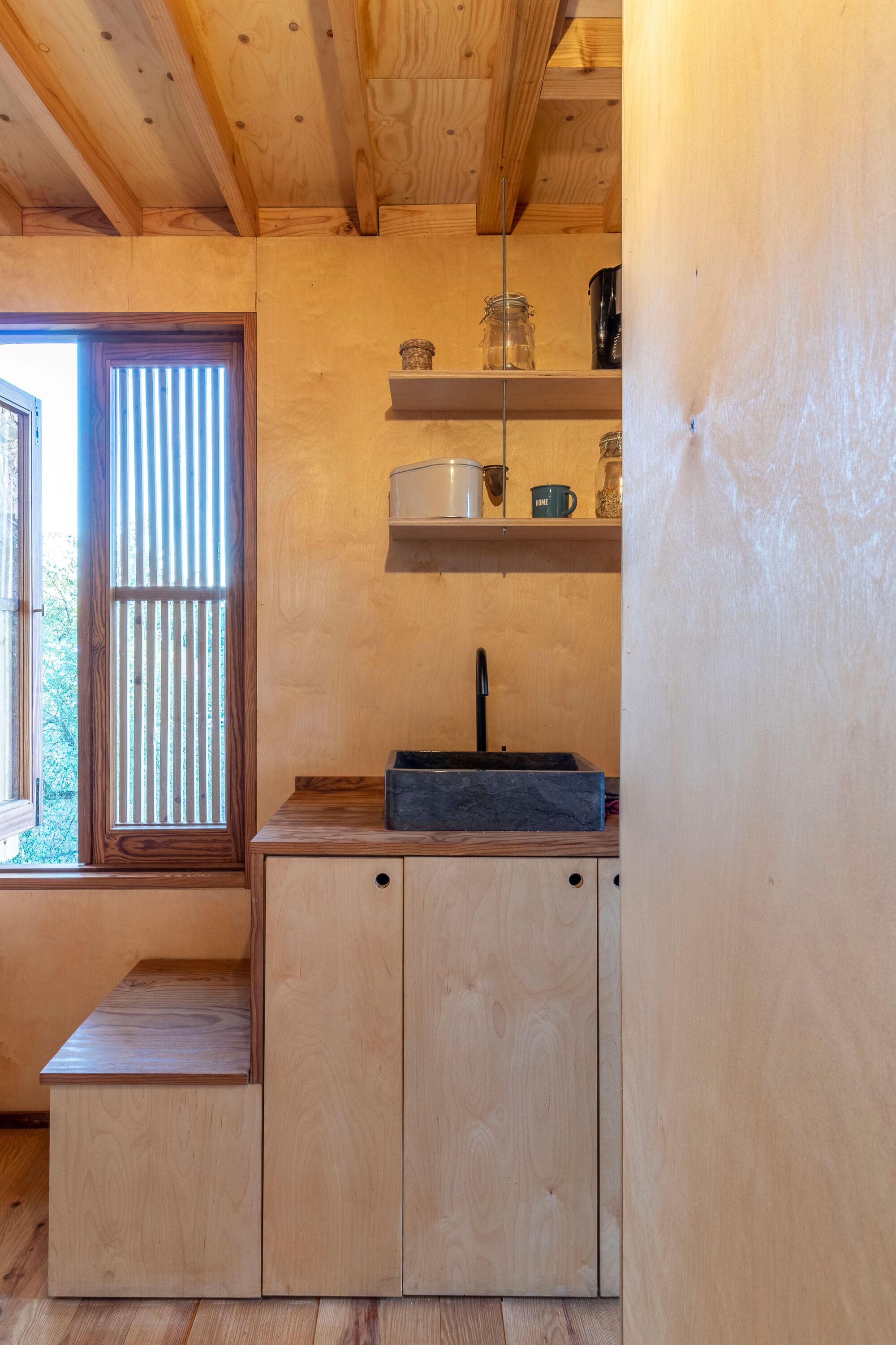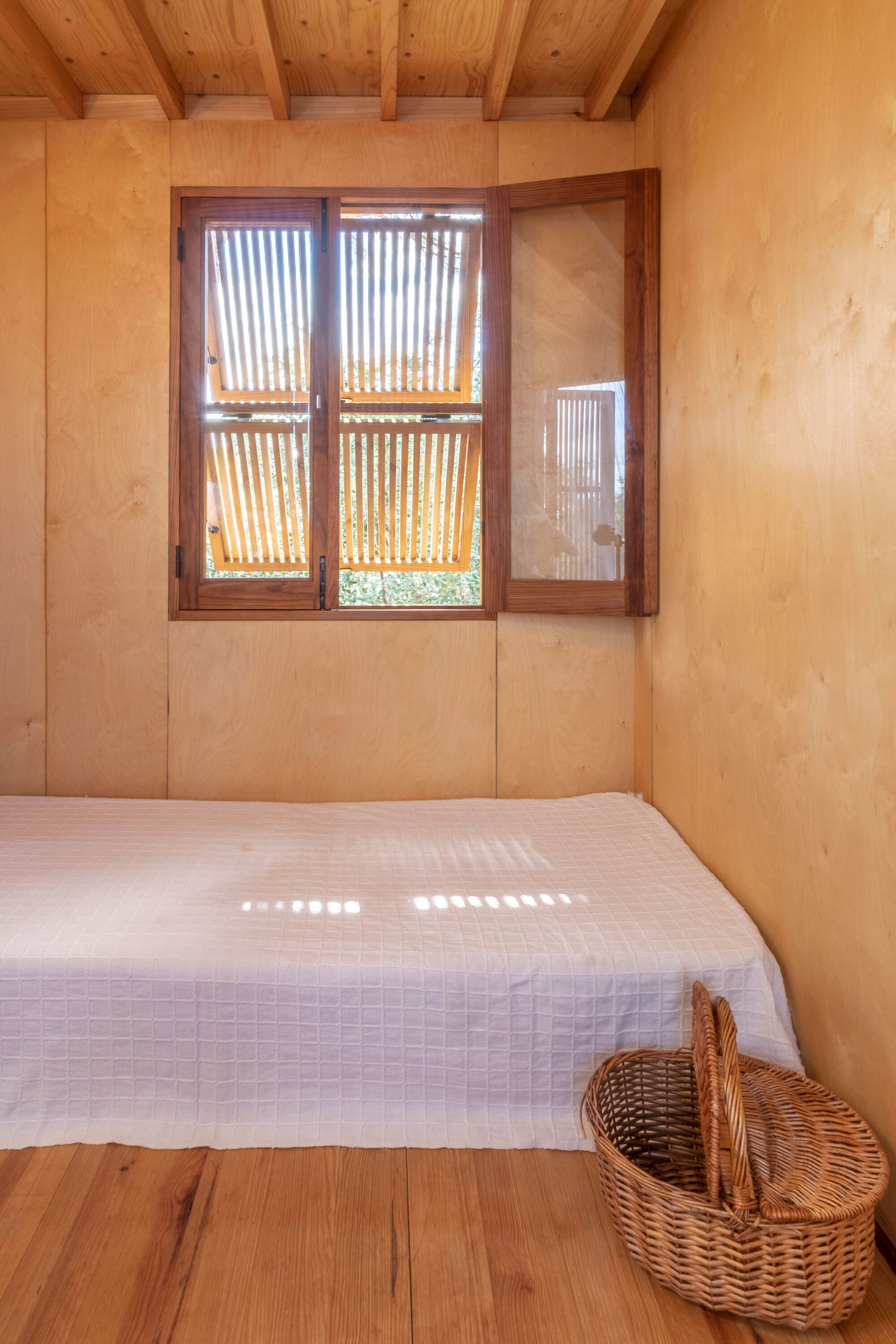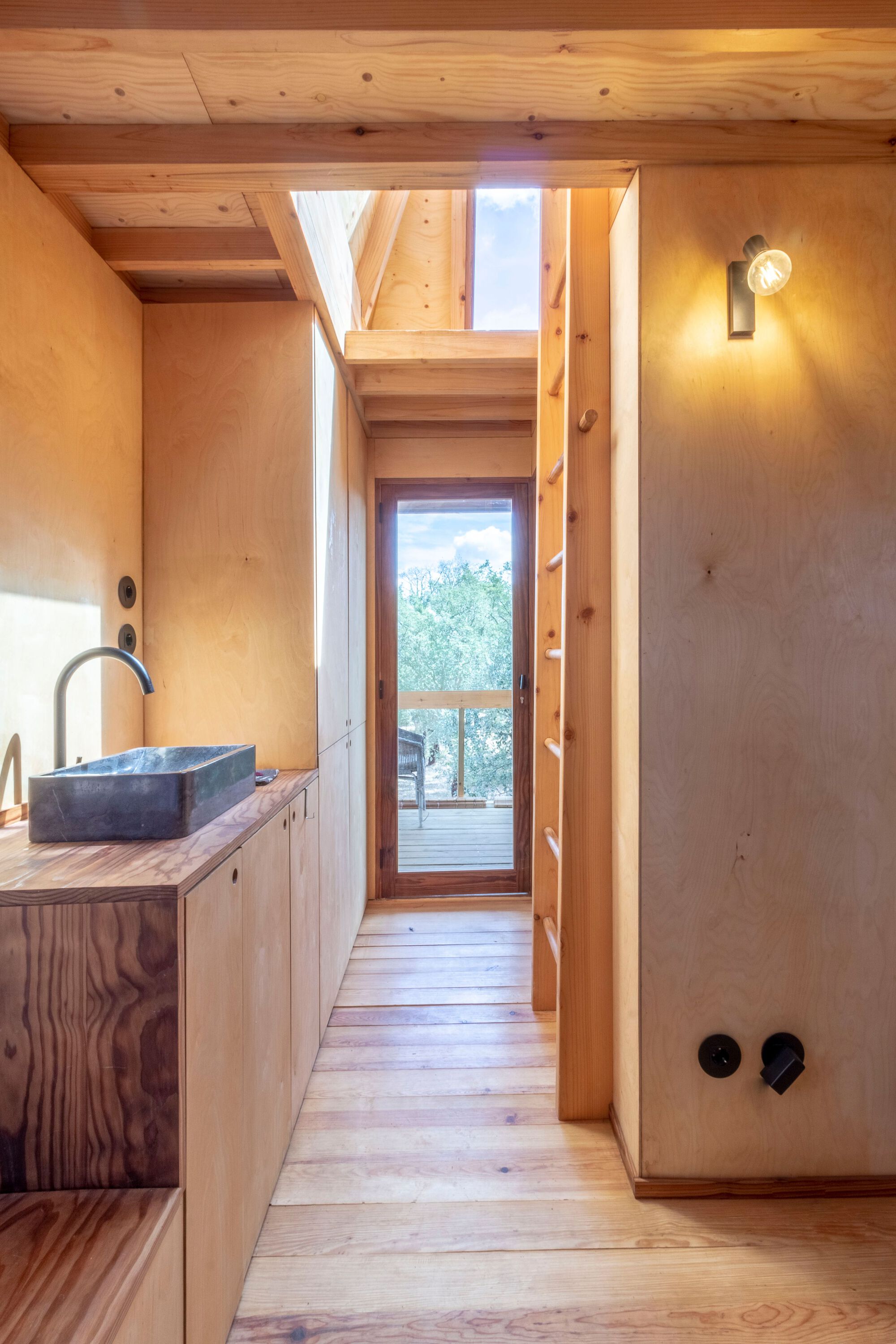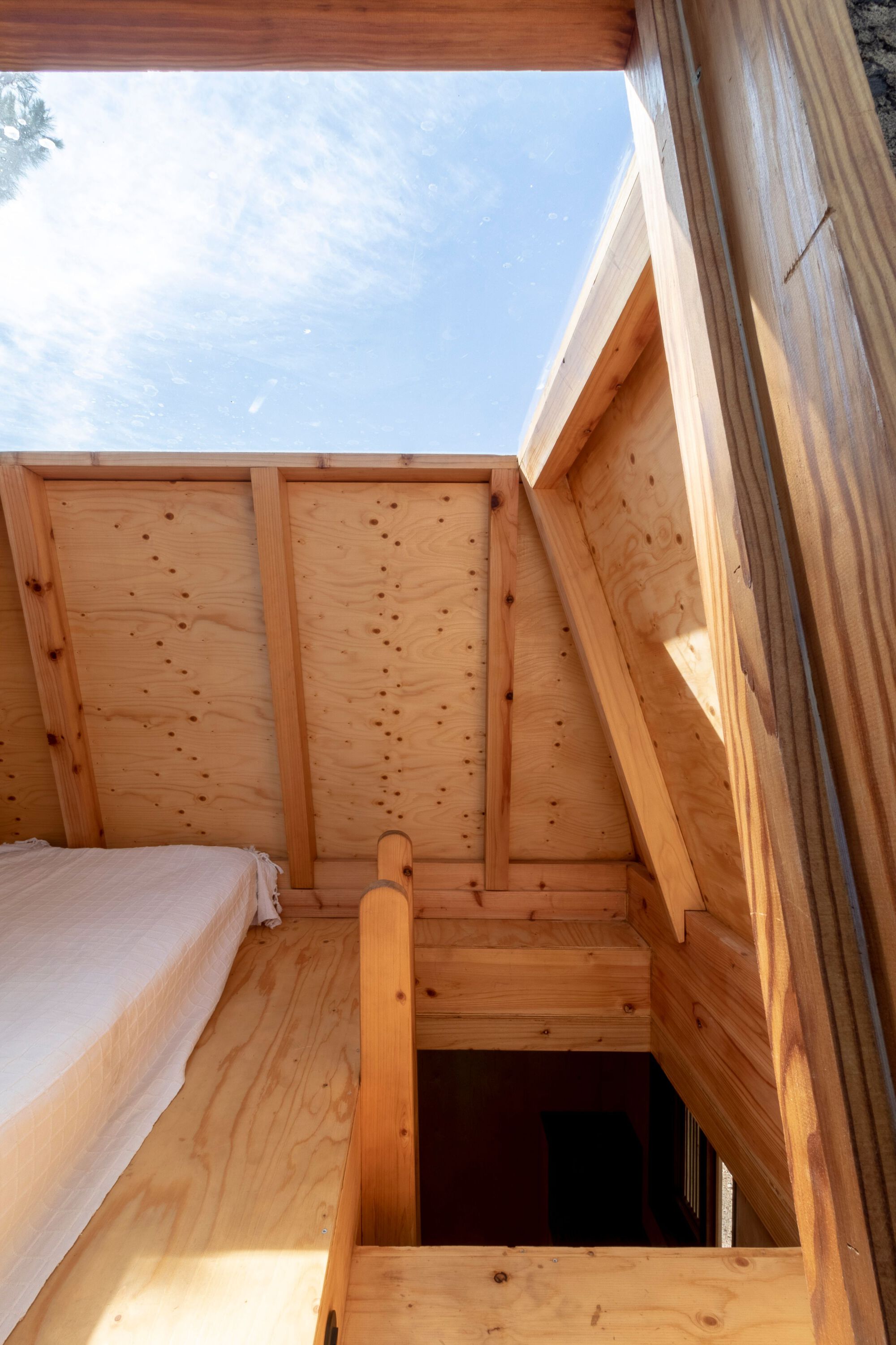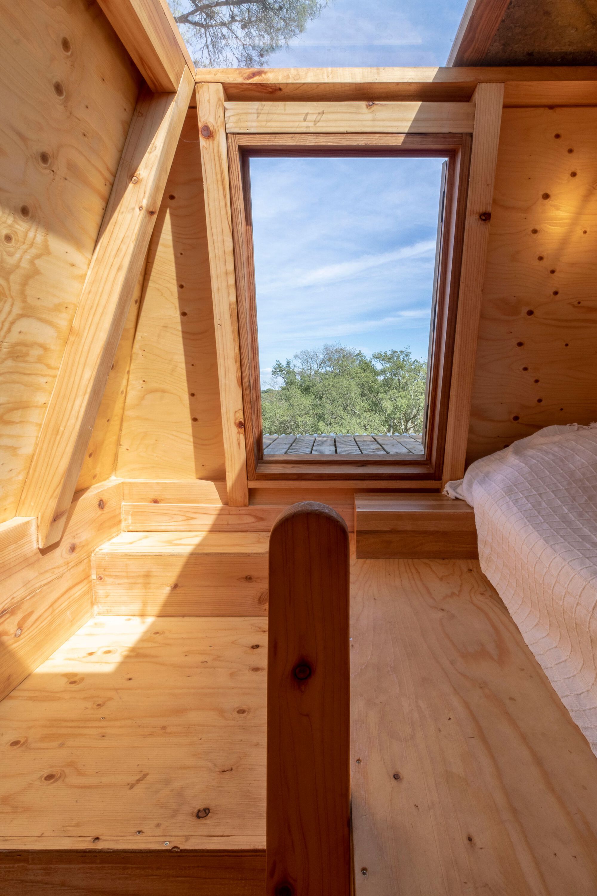 발코니 외에도 이 층에는, 욕실, 작은 거실, 주방, 옷장 등 생활에 필요한 최소한의 공간들이 갖추어졌다. 그리고 사다리를 통해 오르내릴 수 있는 침실에는 천창과 옆문이 설치되었다. 사다리꼴 모양의 침실 볼륨은, 외관은 왕관을, 내부는 누에고치가 연상되도록 디자인되었다. 옆문을 통해 지붕으로 나갈 수 있게 만들어서, 아름다운 풍경을 즐기거나 100년 된 소나무와 교감할 수 있게 하기도 했다.