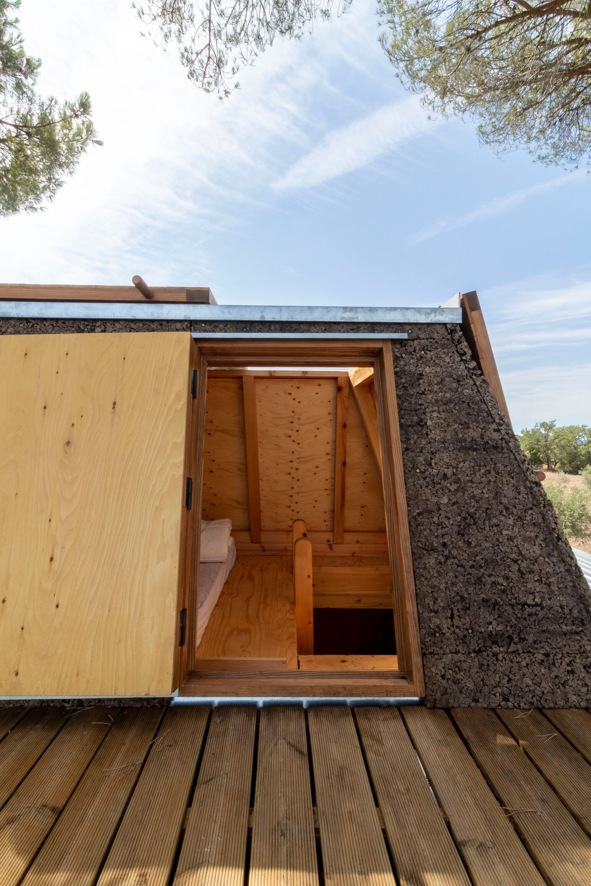 멀리서 보면 골 강판 지붕 위로 사다리꼴 모양의 코르크 마감 볼륨이 솟아 있는 건물이다. 미끄럼틀 일체식 계단을 따라 올라가면, 아름다운 소나무 풍경을 즐길 수 있는 발코니가 출입문 앞에 설치되어 있다. 내려올 때는 미끄럼틀을 이용할 수 있다. 창문에는, 극도로 더운 여름과 추운 겨울을 감안하여 덧창이 설치되었다.