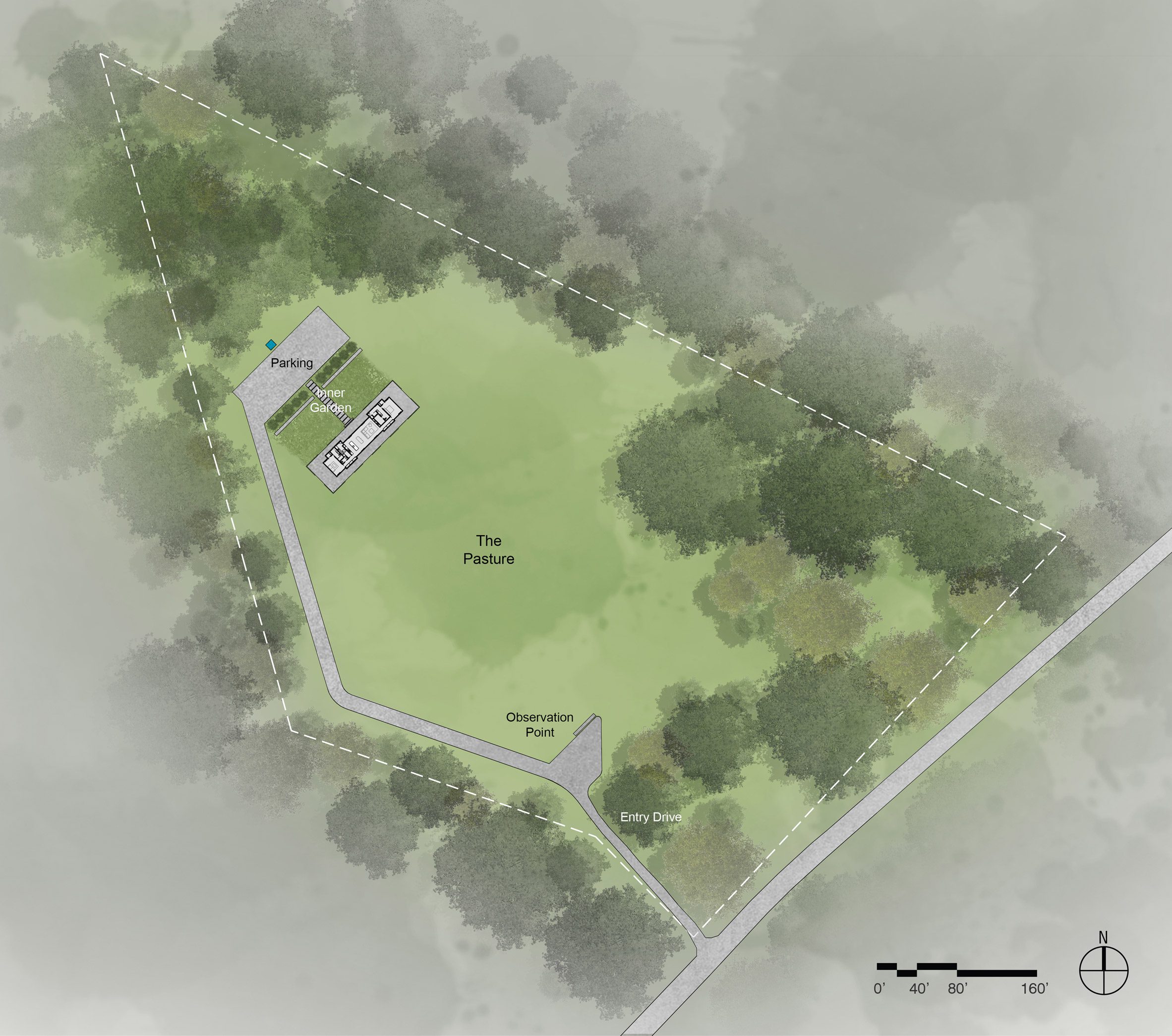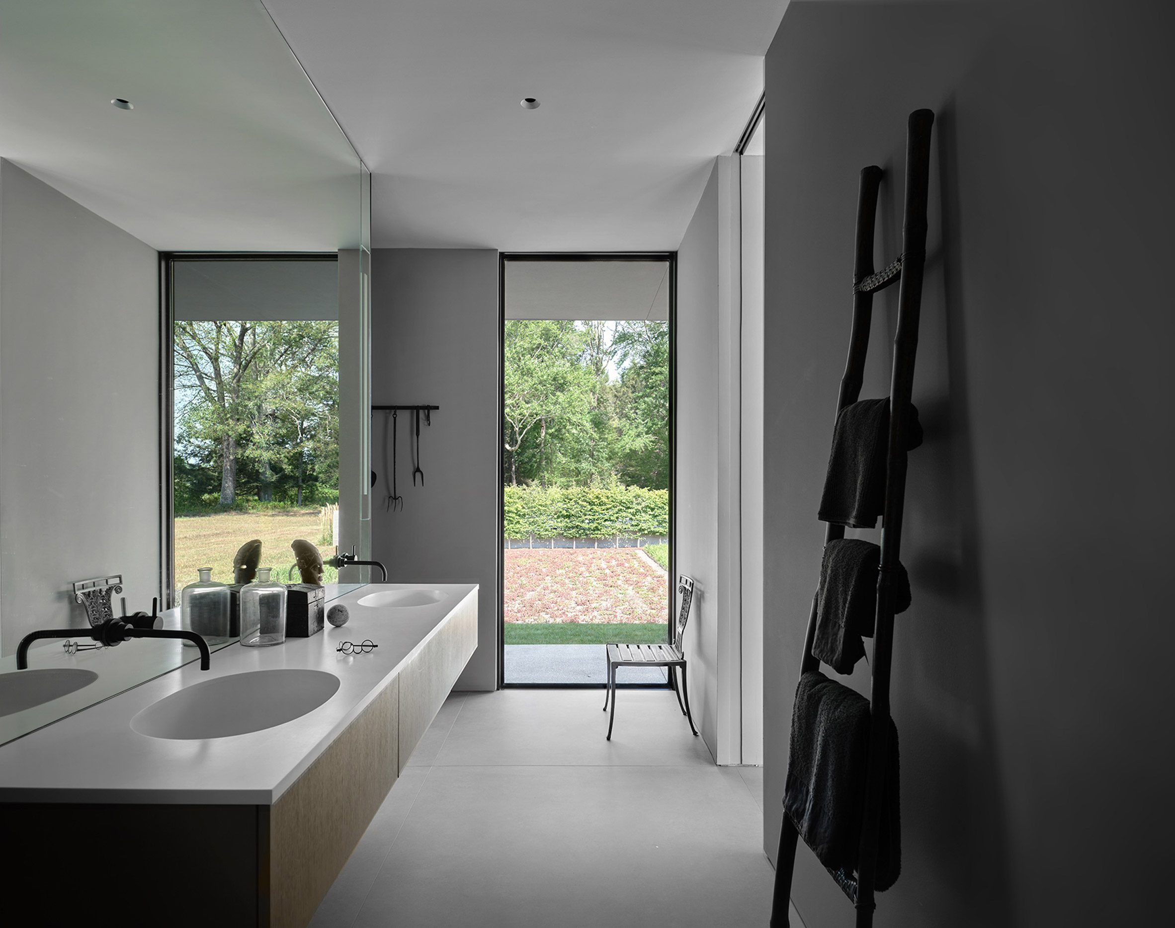 “우거진 숲 사이를 지나, 크고 탁 트인 목초지 안쪽 깊숙이 위치한 대칭 구조의 집으로 길게 이어진 진입로가 분위기를 고조시킵니다.” 설계팀의 설명이다. “전체 집 주변으로 최대 15피트(4.5m)를 연장하여 포치를 형성한 지붕에 의해 냉난방 부하가 줄어들도록 계획했습니다.”