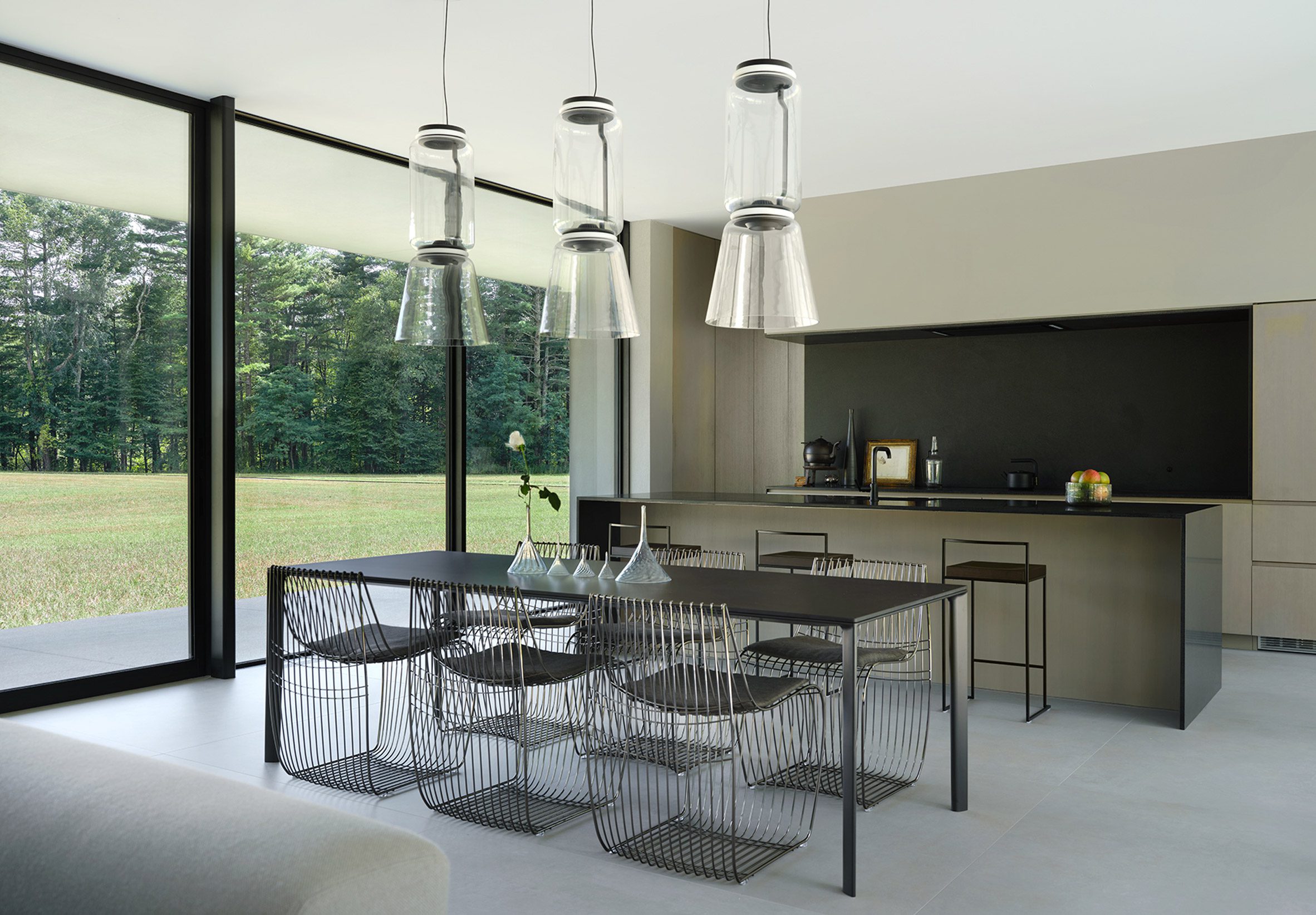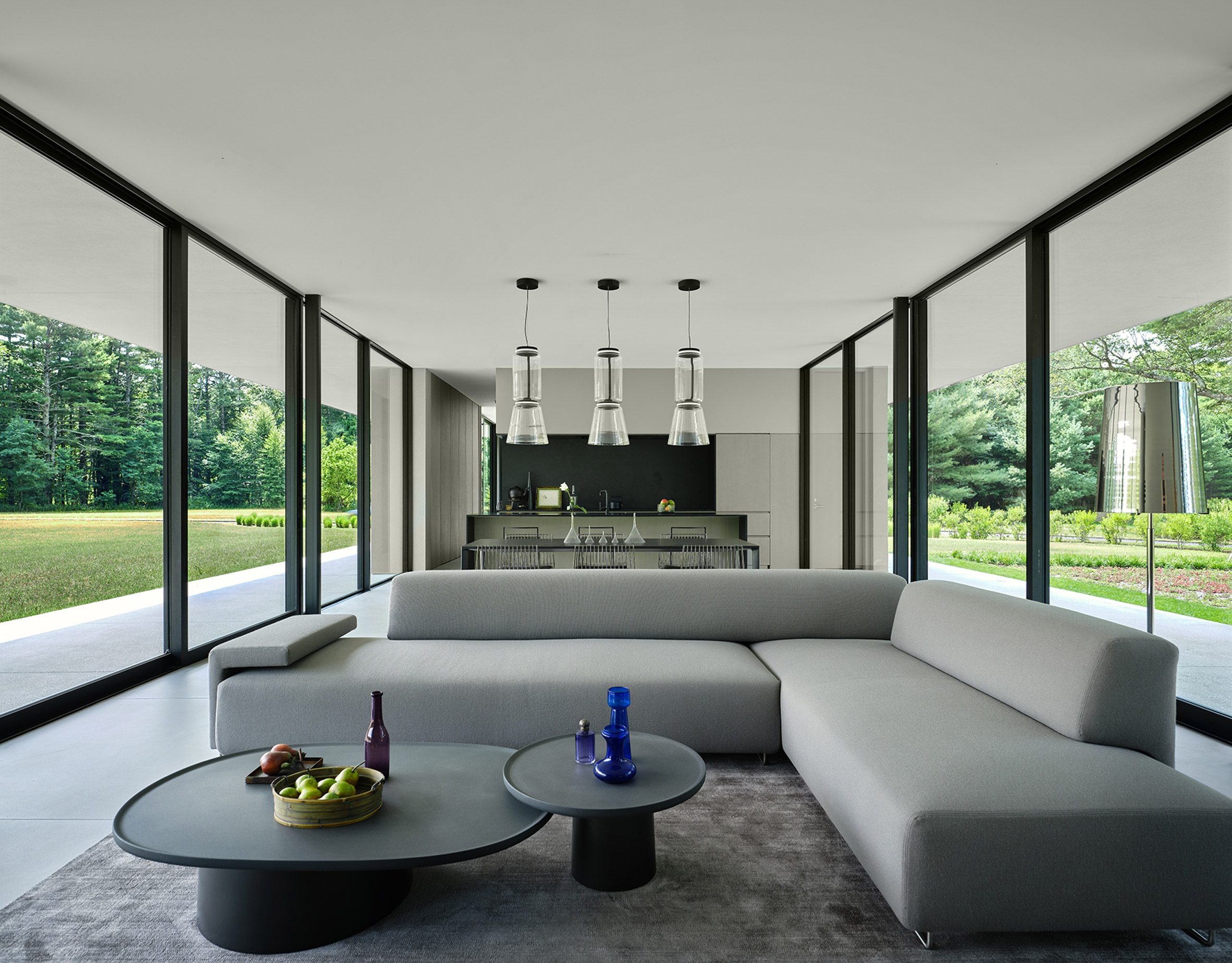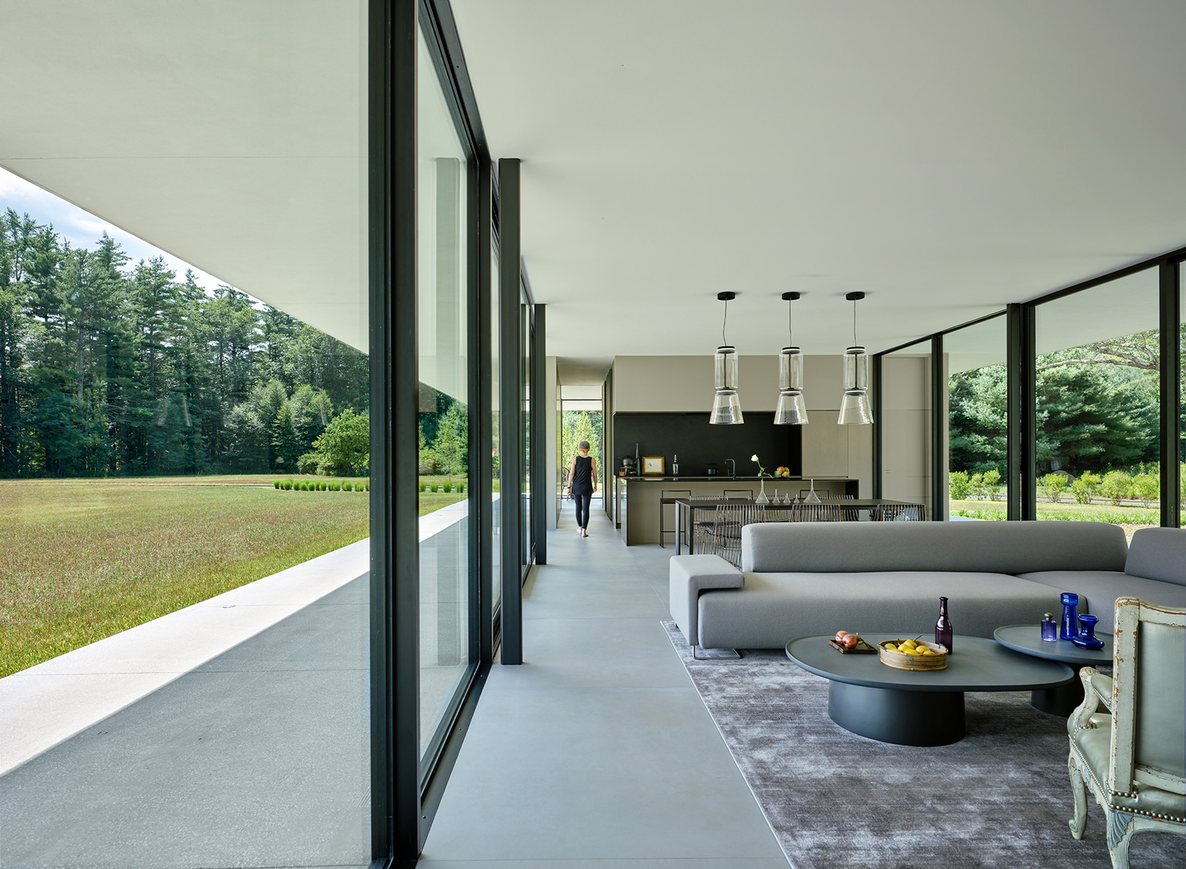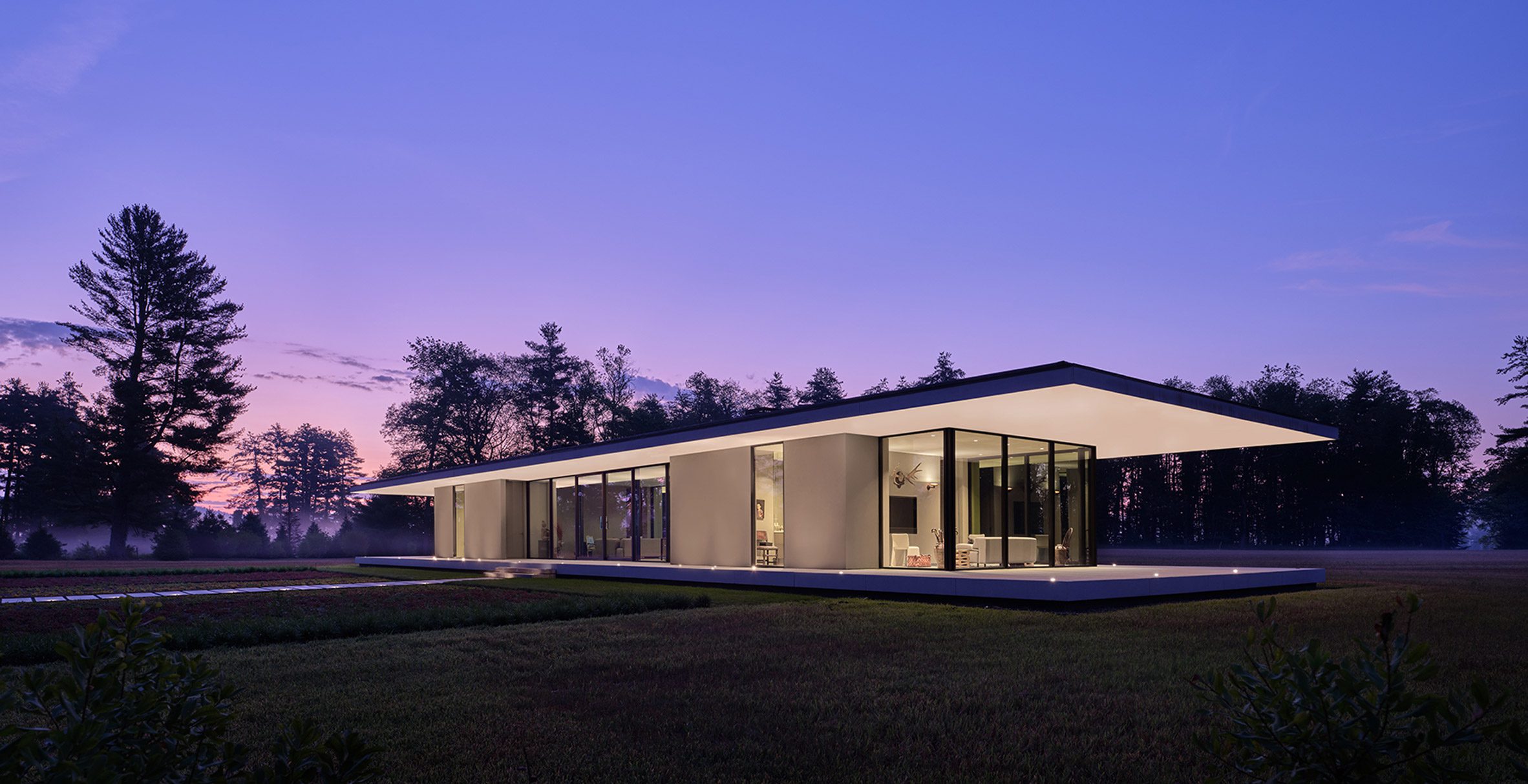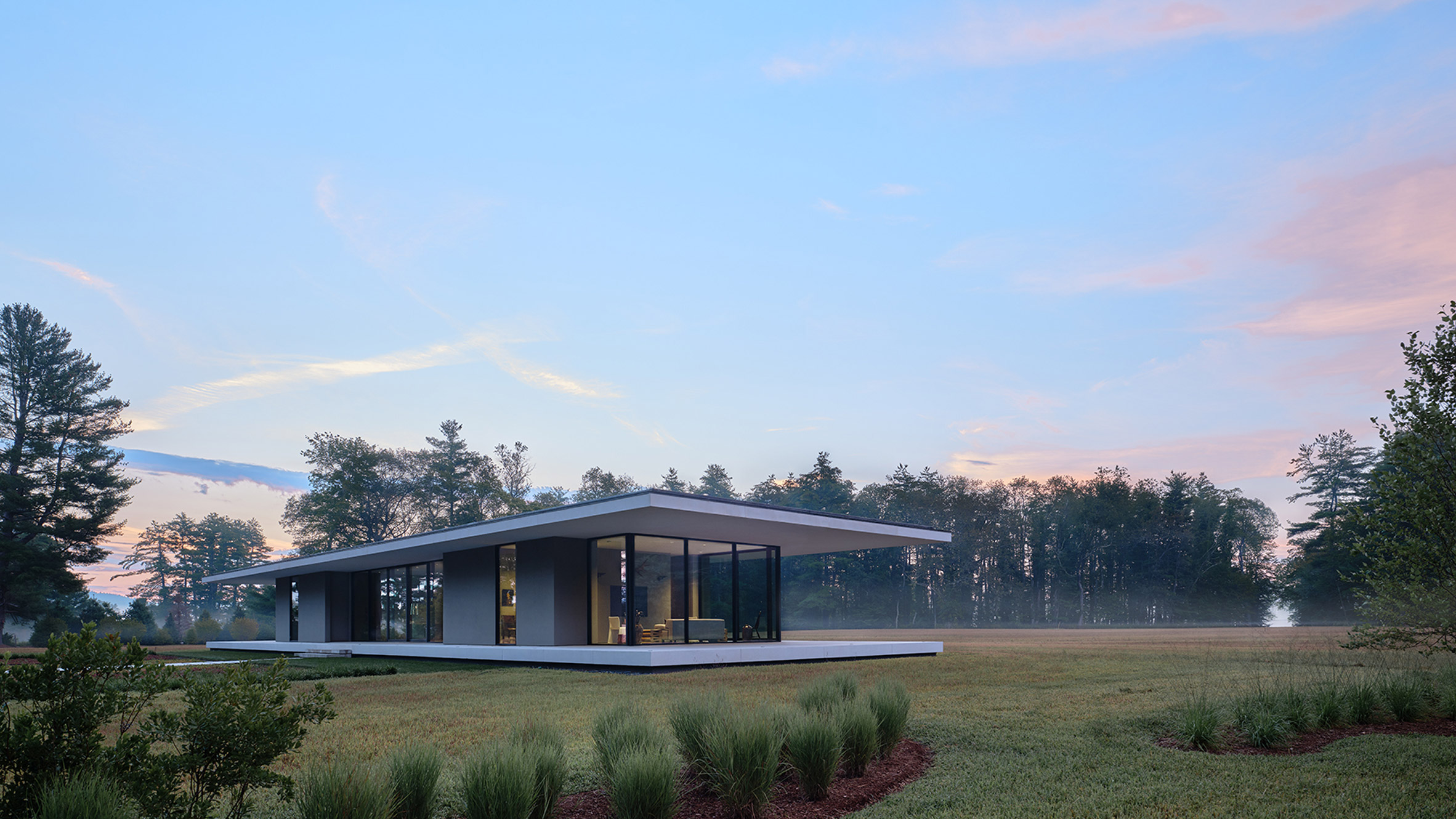 유리 상자 구조 그리고 그 바깥으로 뻗어 있는 평행한 바닥 판과 지붕 판으로 이루어진 이 집은, 지면에서 살짝 떠 있는 풍경 속의 오브제처럼 지어졌다.