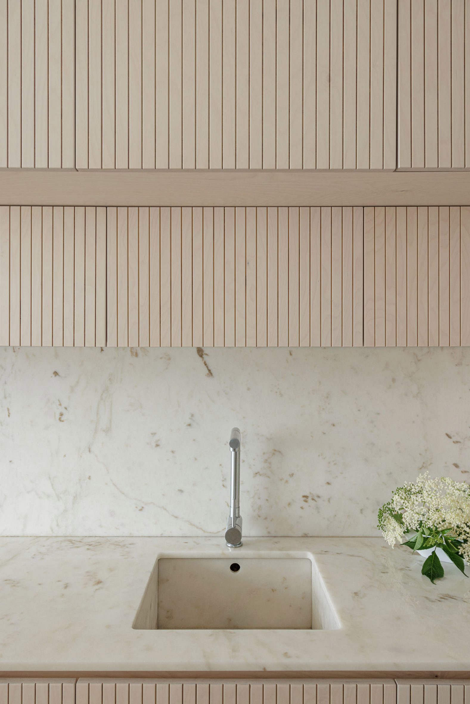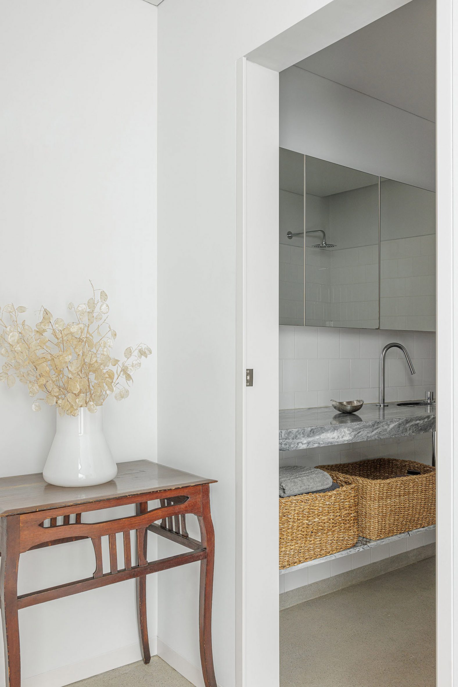 “미니멀한 외부의 이 특성을, 노출 콘크리트, 흰색 벽, 목재 등으로 이루어진 내부에 그대로 적용하여 밝고 자연스러운 분위기를 연출했습니다.” 이 역시 설계팀의 설명이다. “모든 바닥의 시멘트, 문, 수납장, 난간 등의 목재, 그리고 주방 조리대 및 위생 설비에 사용된 대리석 등 원자재를 일관성 있게 사용하여 전체적으로 통일성을 강화하기도 했습니다.”