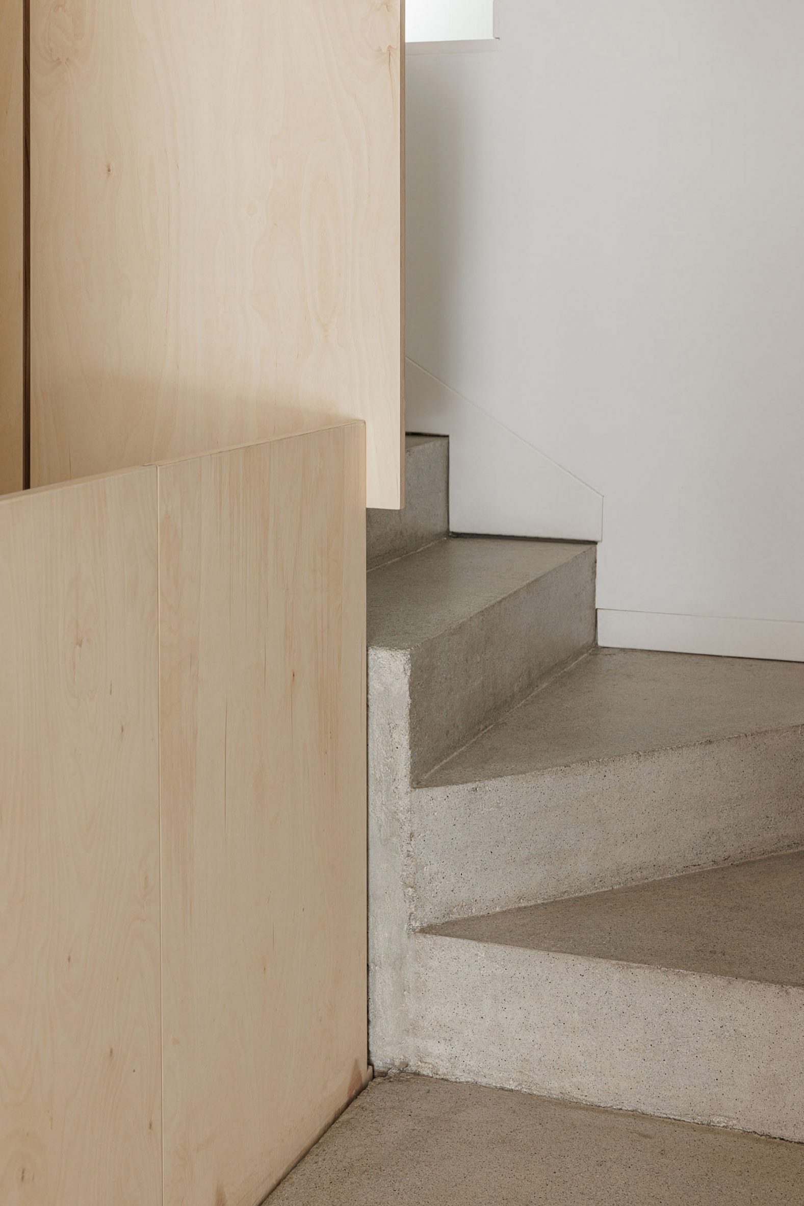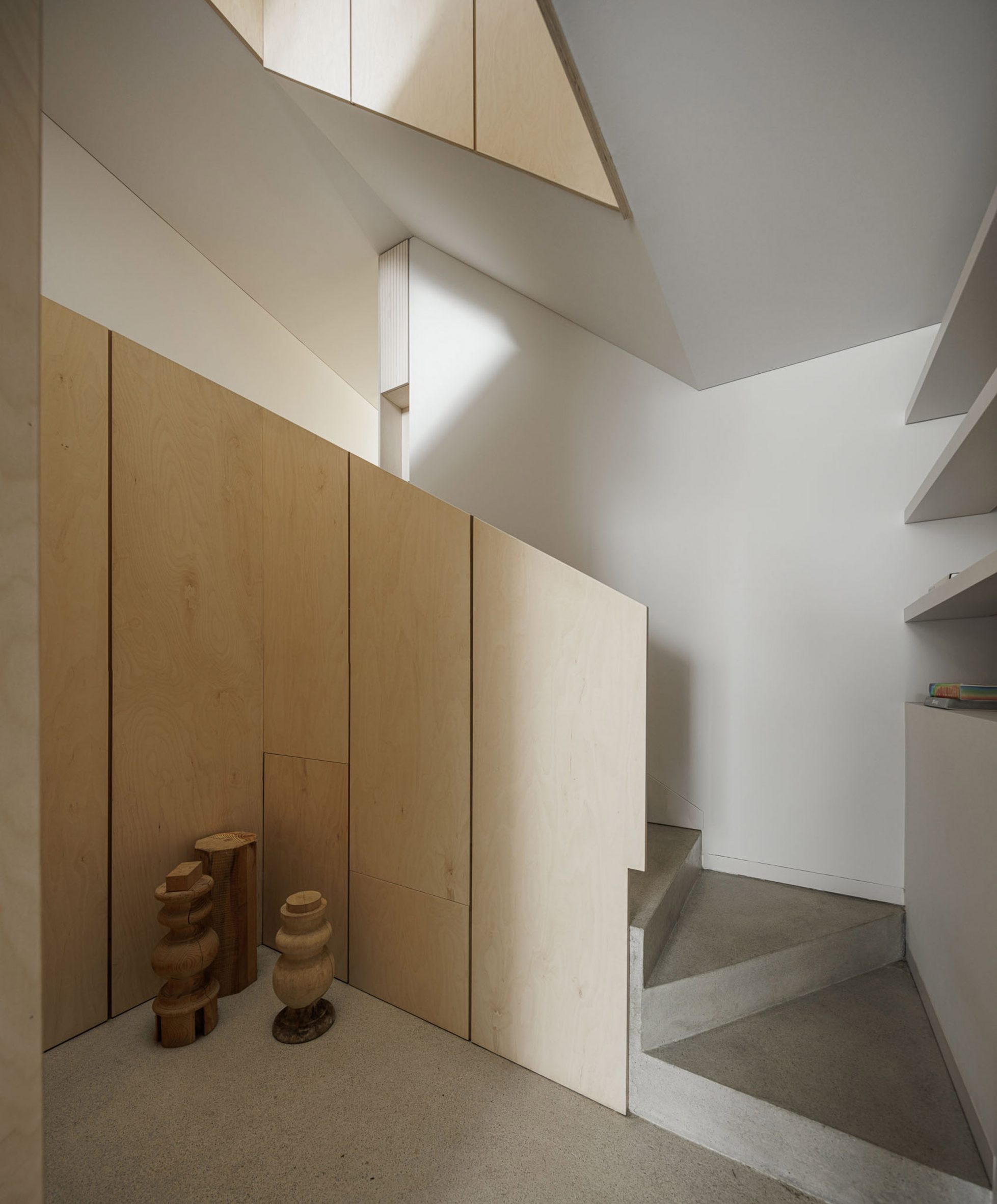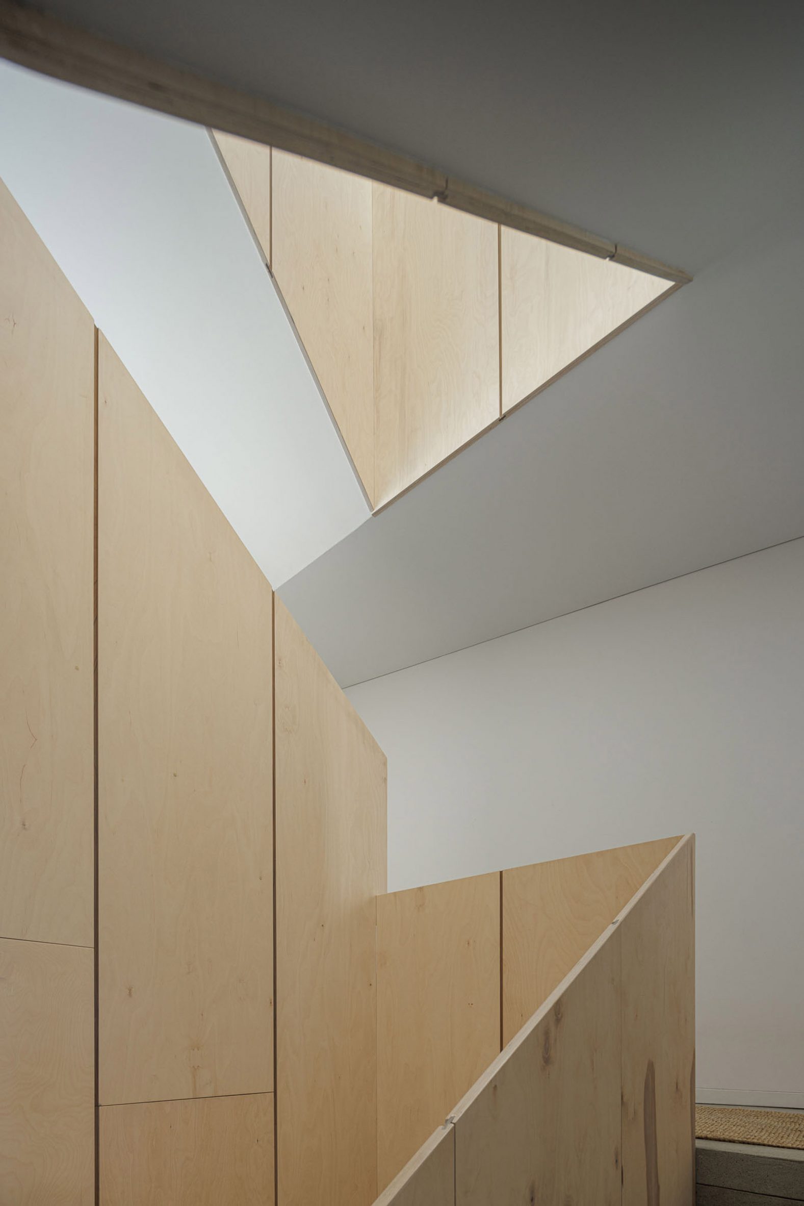 좁은 삼각형 부지에 4.5층 규모로 지은 버티컬 하우스이다. 차고 옆에 설치된 입구로 들어가면, 노출 콘크리트로 시공하고 합판 패널 난간을 적용한 중앙 계단으로 복도가 이어져 있다.