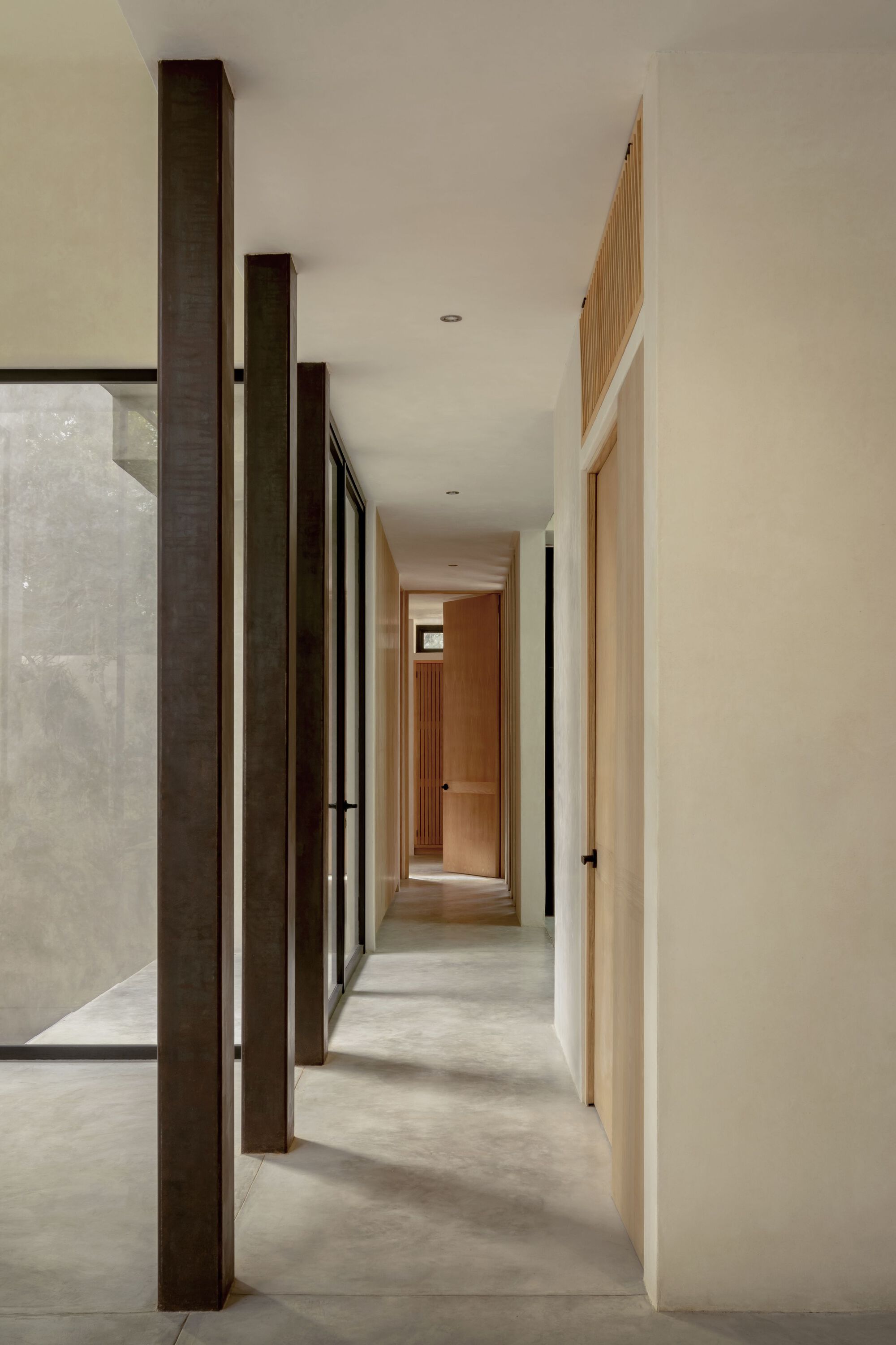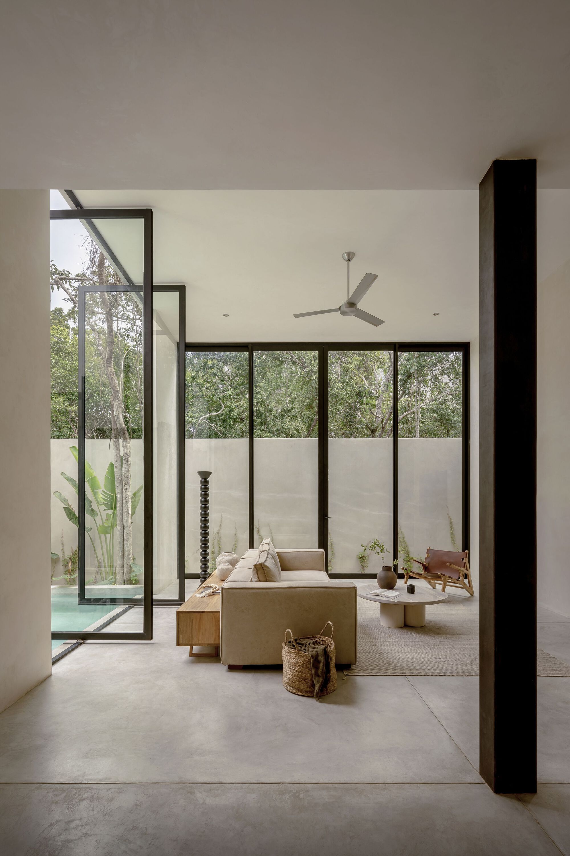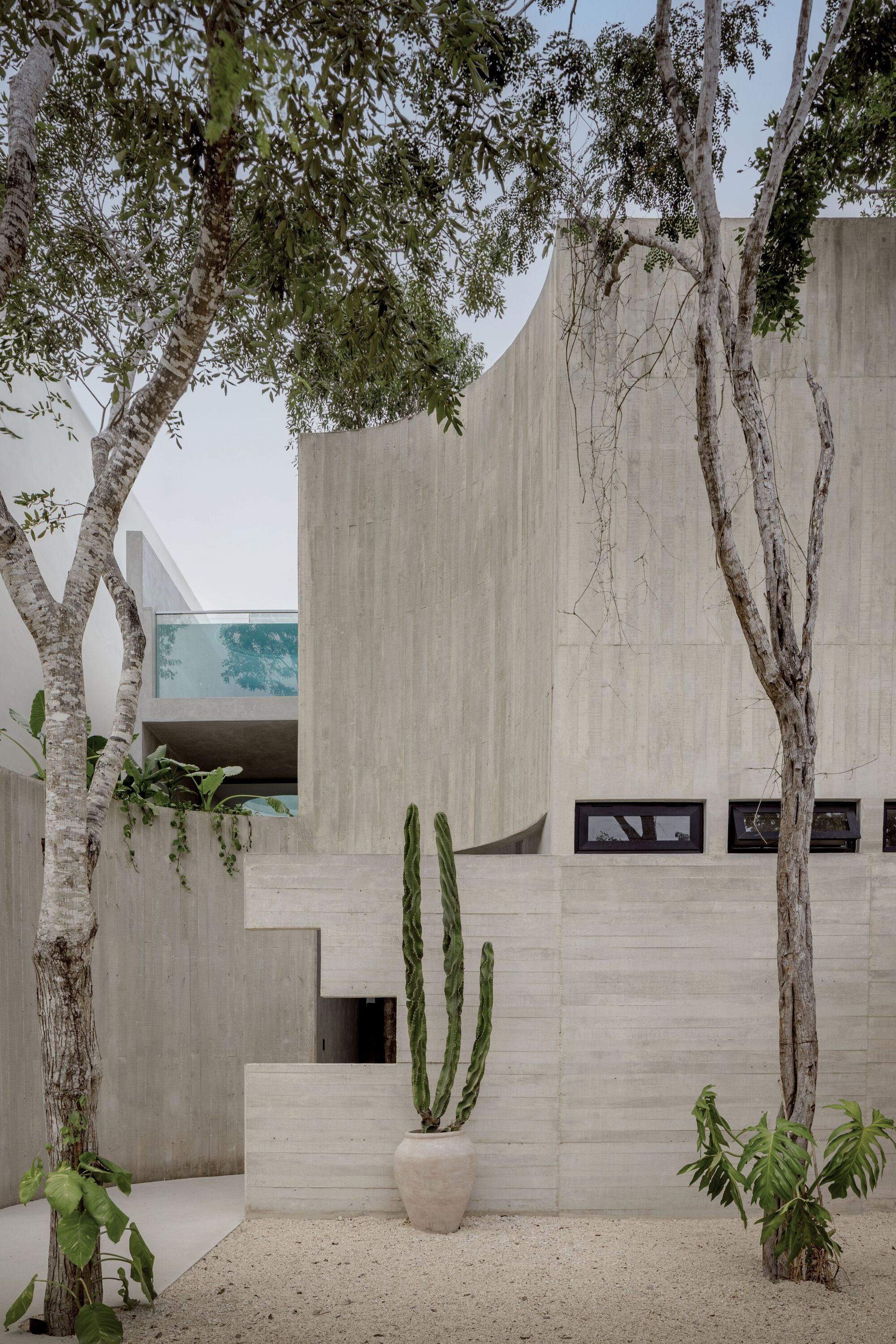 The house was carefully designed to blend in with the existing landscape. The construction regulations and existing trees influenced the outline of the house, while the jungle views were considered to ensure complete privacy. The brutalist-inspired fortress is made of raw wood-formed concrete, which is slowly uncovered to reveal itself as a carved sculpture. The materials were selected to harmonize with the immediate context, considering the humid and rainy climate, as well as the potential for hurricanes.