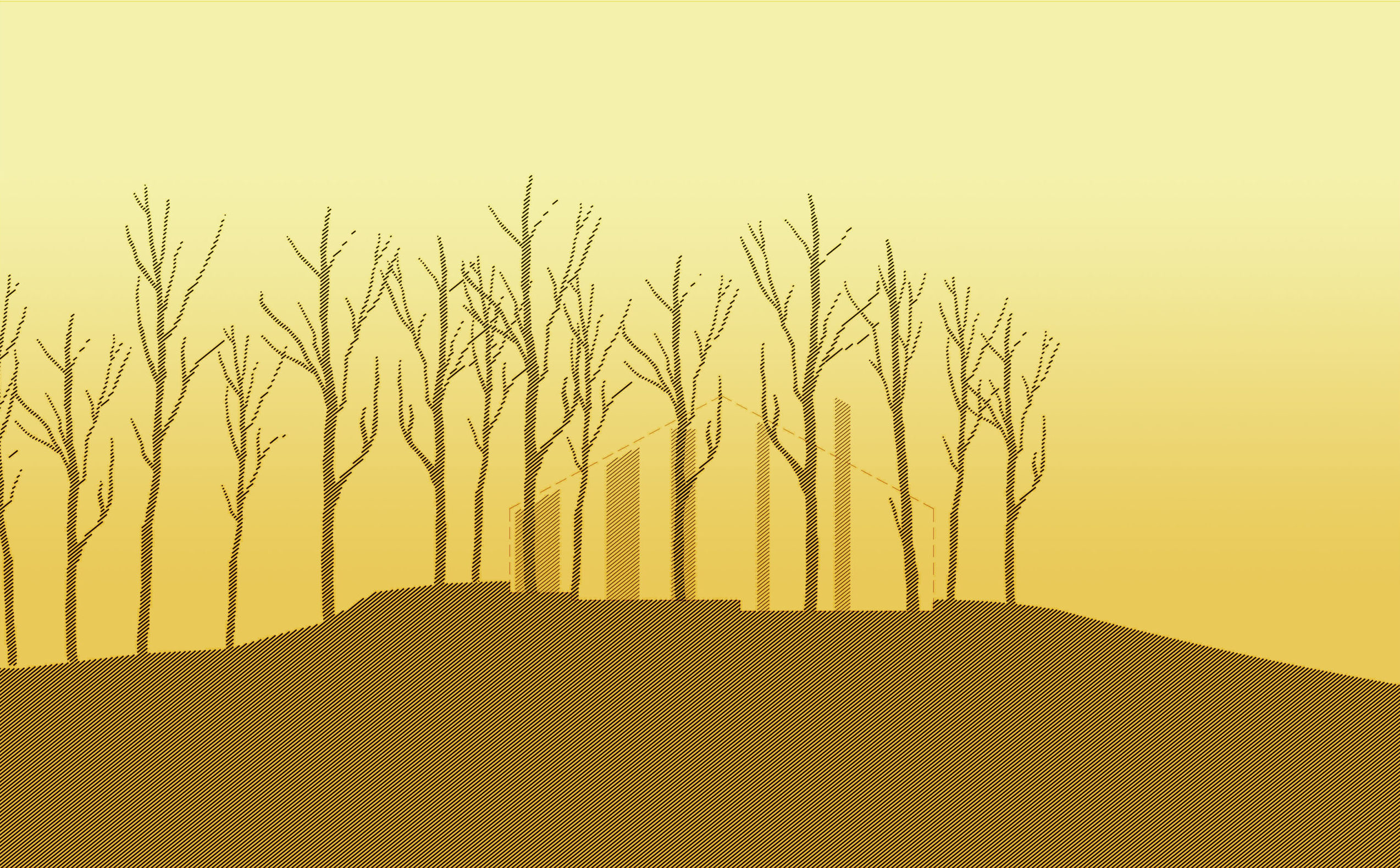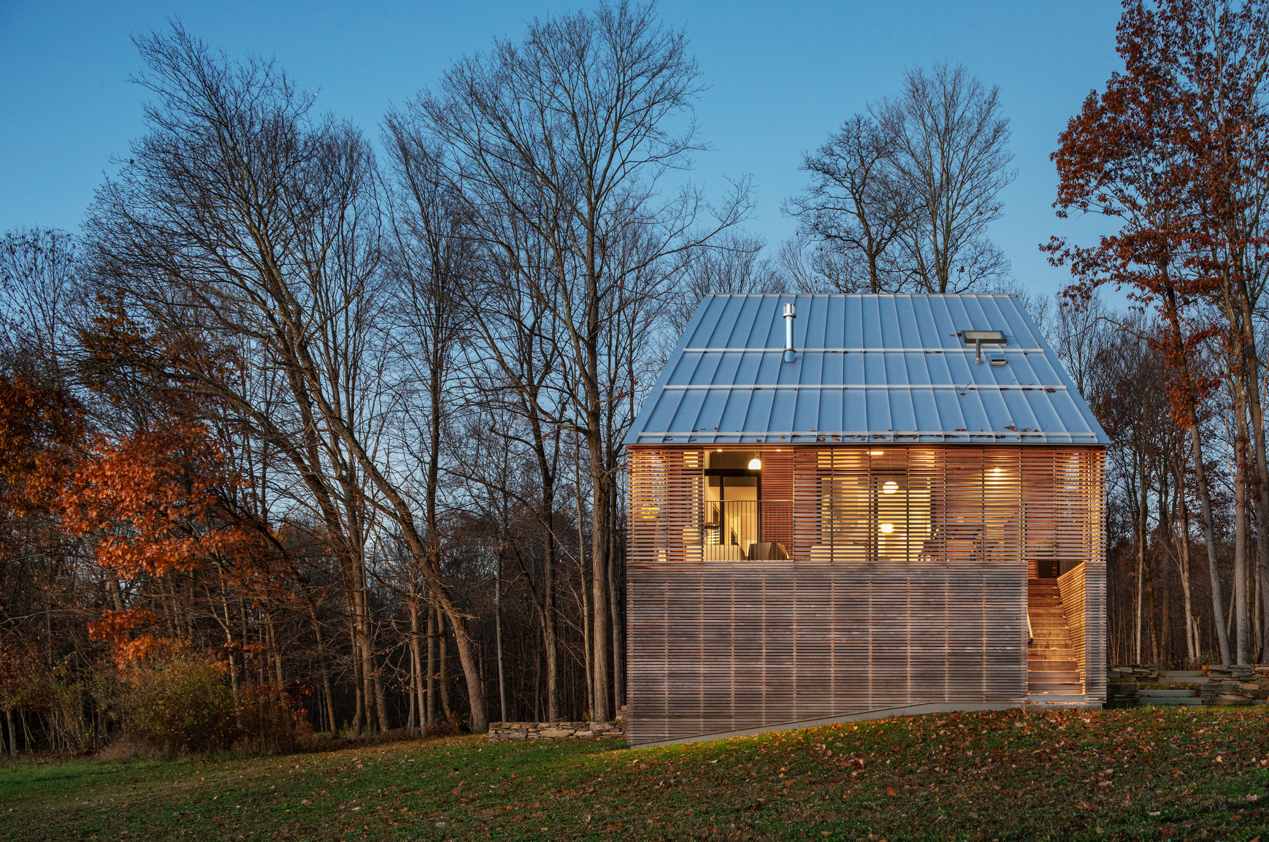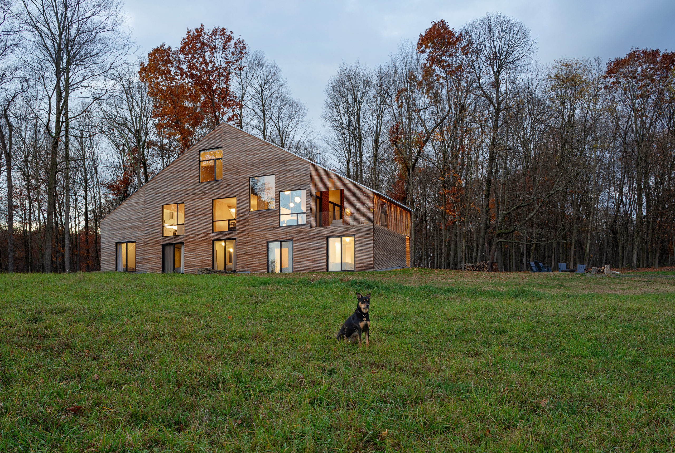앞뒤로 무질서하게 분산 설치한 창을 통해 풍경과 연결된 전원주택이다. 뉴욕 주 더치스 카운티의 언덕에 지은 ‘숲과 들판 사이의 집’이라는 이름의 이 주택의 콘셉트는 주변 환경과 지형에서 가져왔고, 공간 구조는 대지와의 일상적 접촉에 초점이 맞춰졌다.