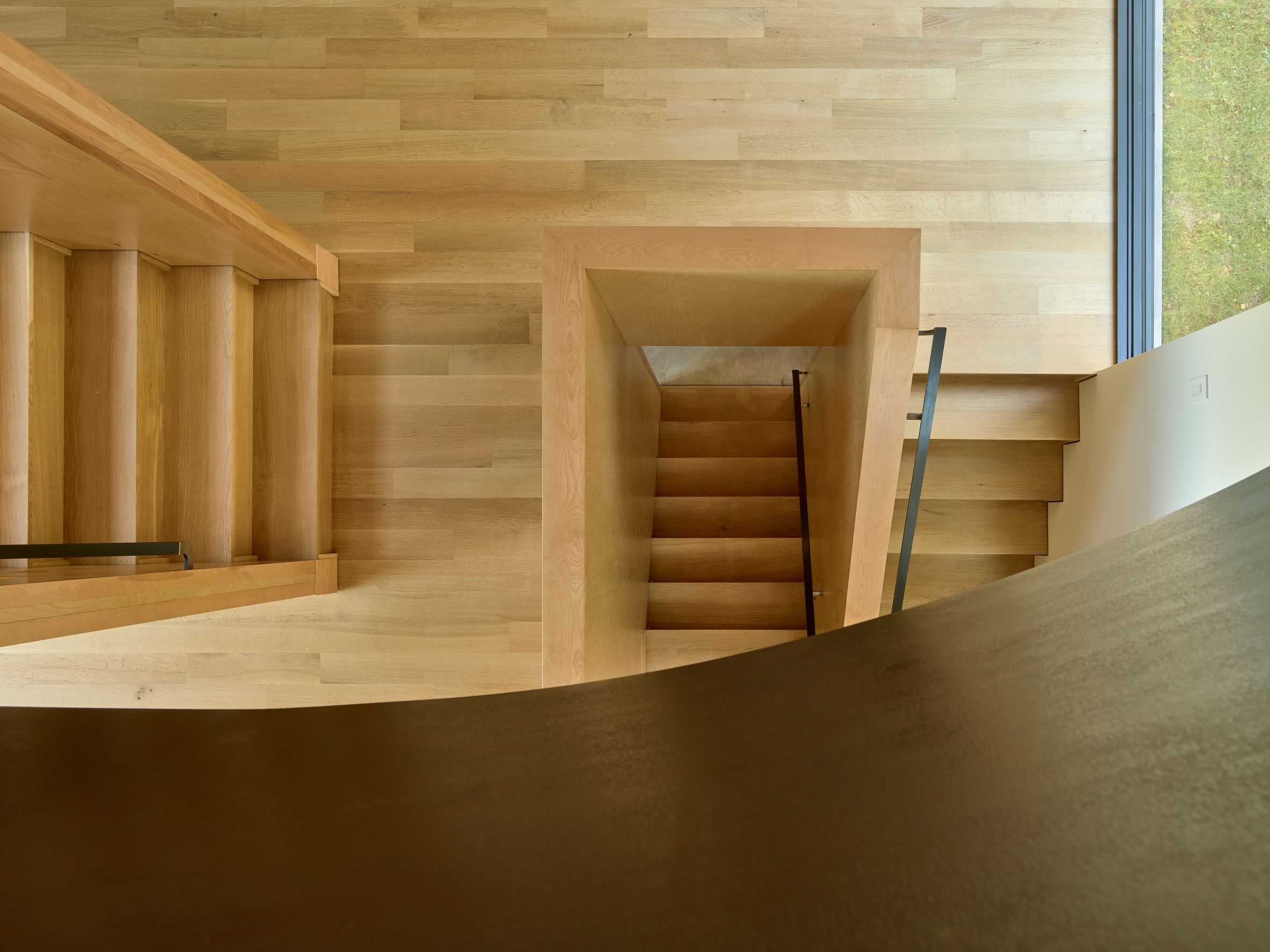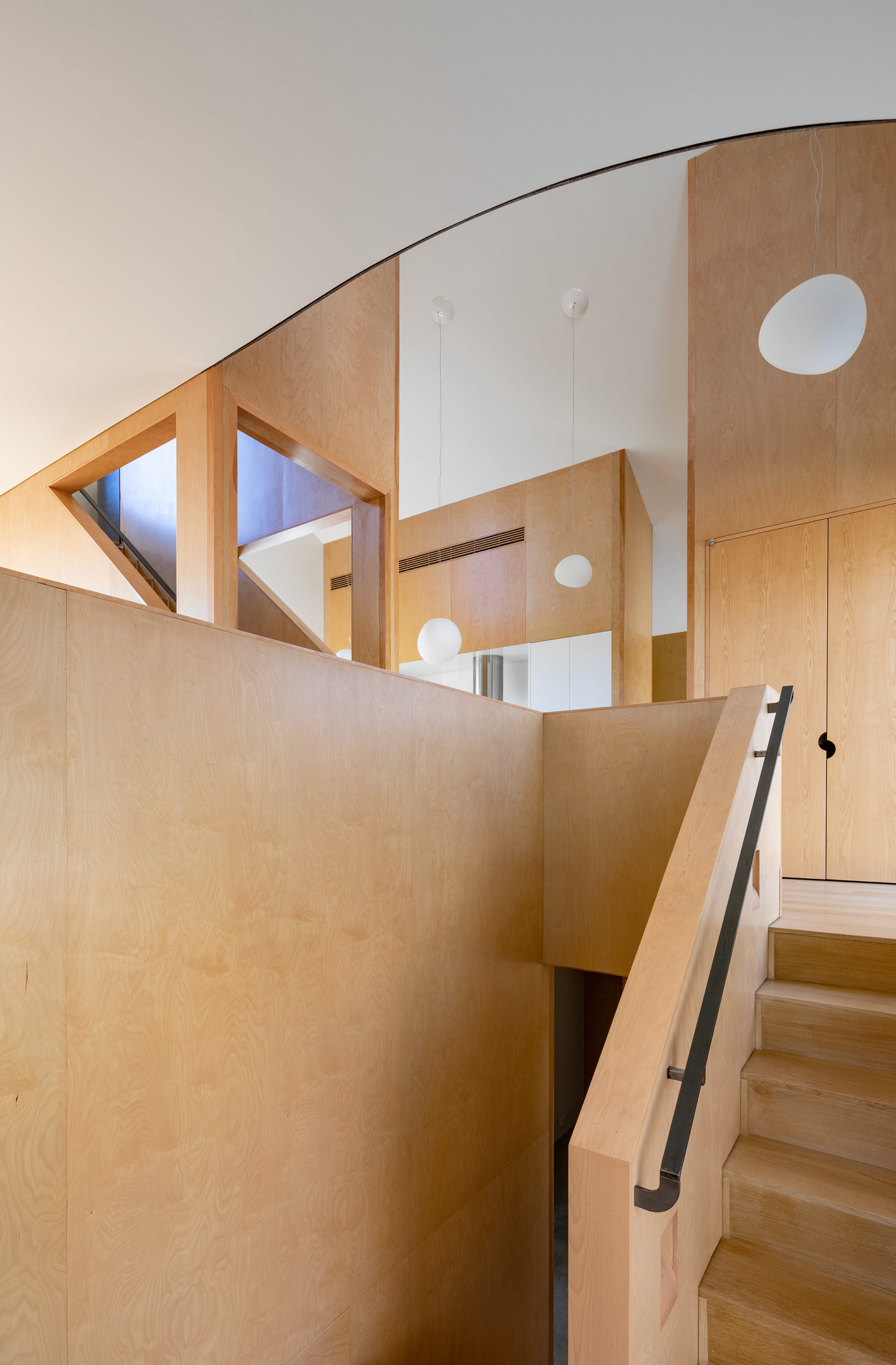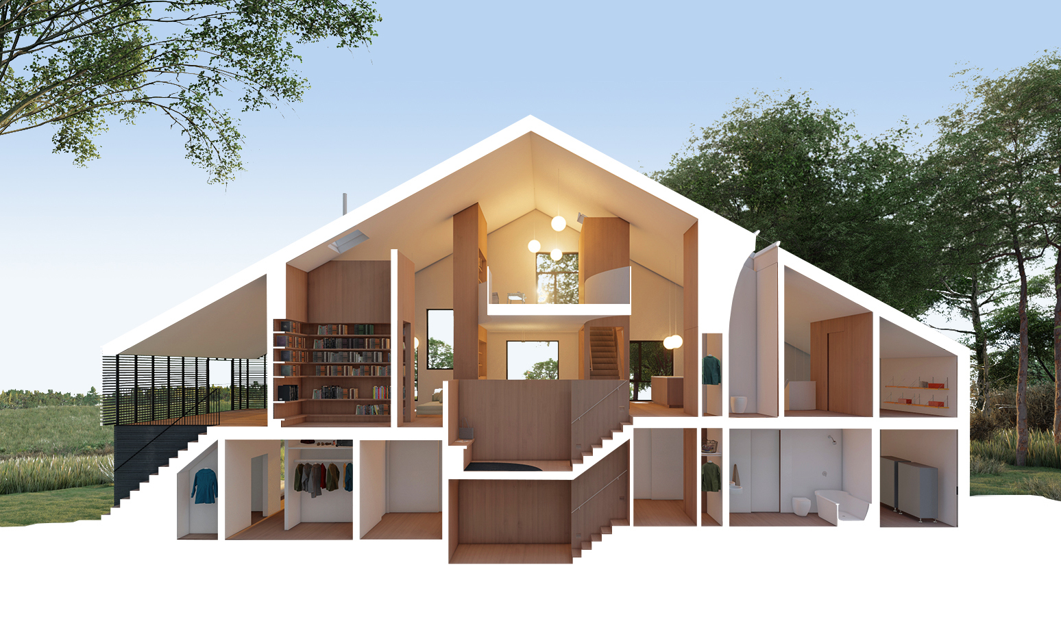 이 집은, 콘크리트 슬래브 위에 전통 목재 스터드 구조로 지어졌다. 외벽체뿐만 아니라, 내부의 코어들도 구조적인 안정성을 유지하는 데 일조한다. 합판으로 마감된 나무줄기 모양의 이 볼륨(코어)들은, 마치 숲의 지면에서 자라난 나무줄기들처럼, 광택이 나는 콘크리트 바닥으로부터 추상적인 흰색 공간으로 솟아나 있다.