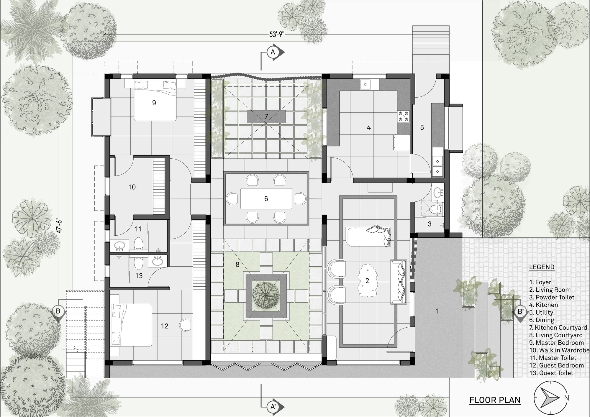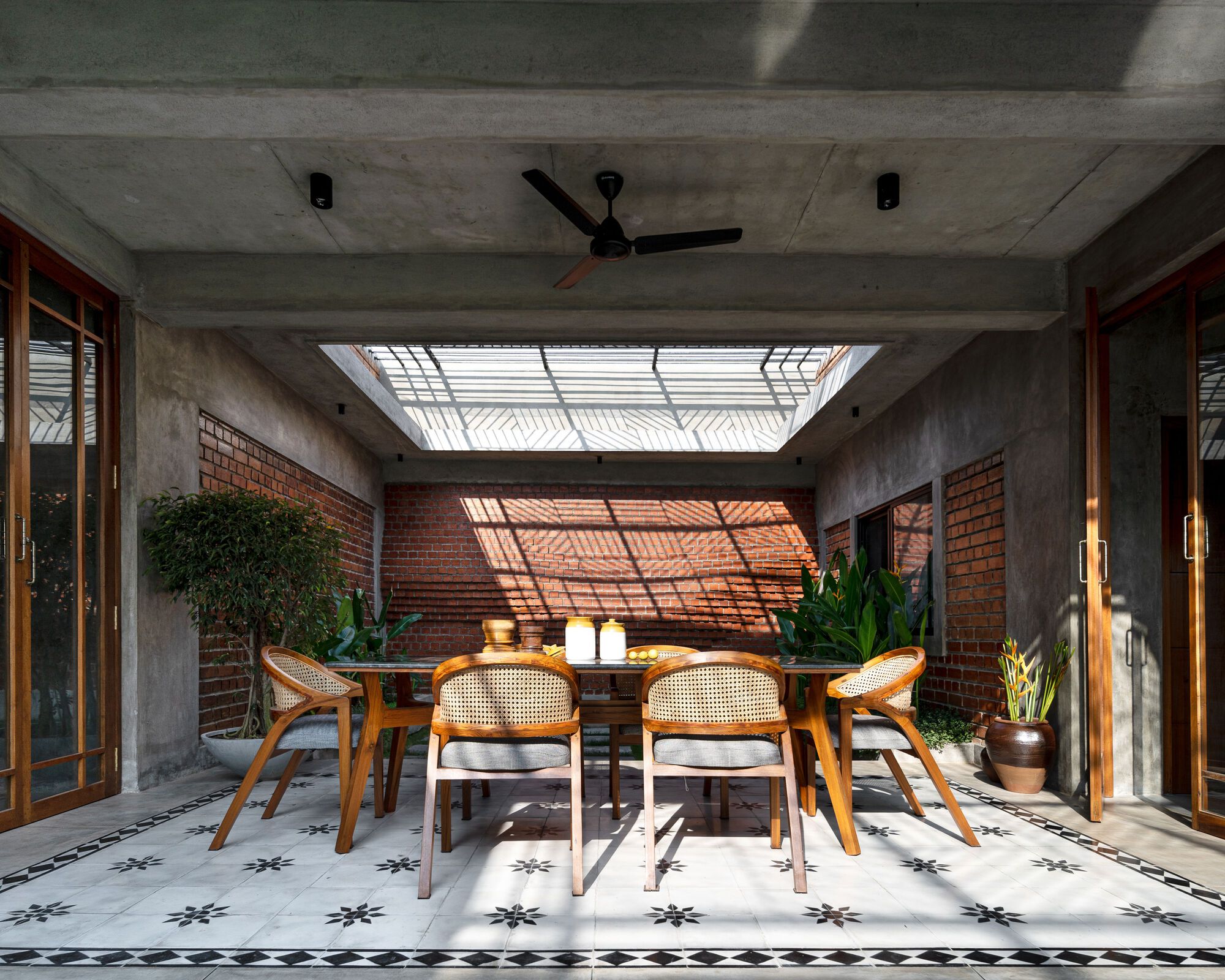 중정을 둘로 나누고 그 사이에 배치된 식당은, 대규모 가족이 한 자리에서 식사를 할 수 있게 계획되었다. 아침 햇살이나 몬순 비의 냄새와 같은 자연과 외부 조건에 늘 연결되어 있는 공간이다.