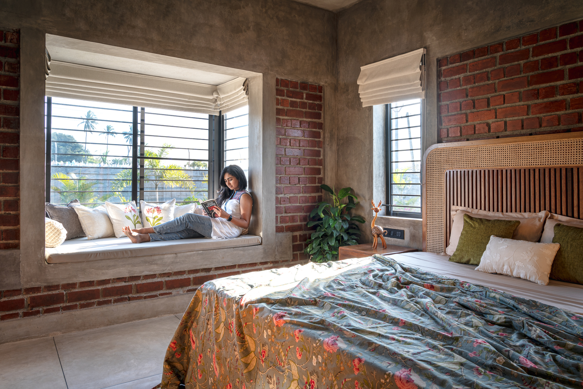 The two bedrooms, the master and guest bedroom are separated from the dining and courtyard spaces by a 9 feet glass door. The master bedroom is treated with wood and cane to bring in enough warmth and texture to the space. Upon entering the guest bedroom, you are welcomed by a striking live edge wood headboard which always serves as a conversation starter. All the furniture, wardrobe, kitchen cabinets, and doors used in the house are made from reclaimed wood taken from different palaces and houses in various parts of Tamil Nadu. Reusing wood has always been our priority, our aim is to decrease the usage of freshly cut trees and repurposing the ones that have been discarded.